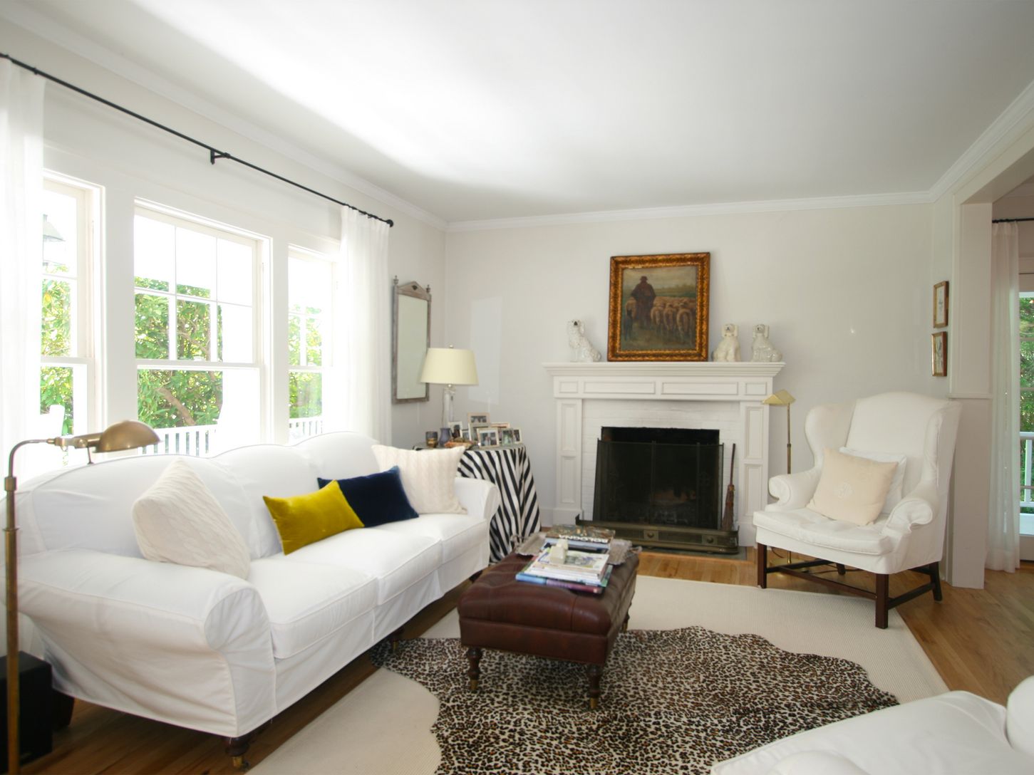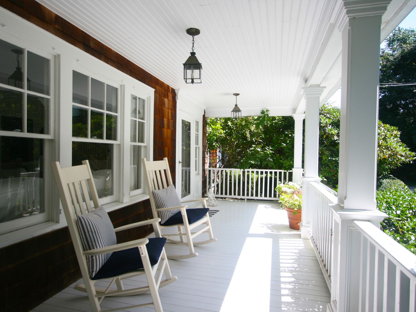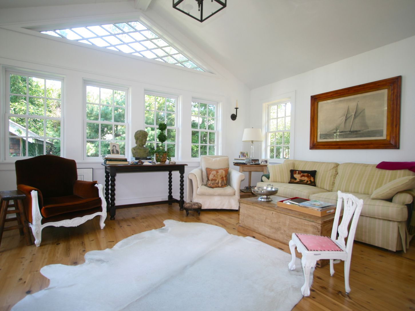 Minutes from Main Street Sag Harbor and feet from beautiful sunsets over Noyac Bay, this circa 1924 designer-renovated farmhouse is the perfect rental for the Hamptons off-season. Featured in several publications, the house is decorated in a classically elegant yet wonderfully eclectic style. Living room with fireplace flows to open dining room and kitchen with French doors onto wraparound covered porch and dining deck. A butler's pantry and s