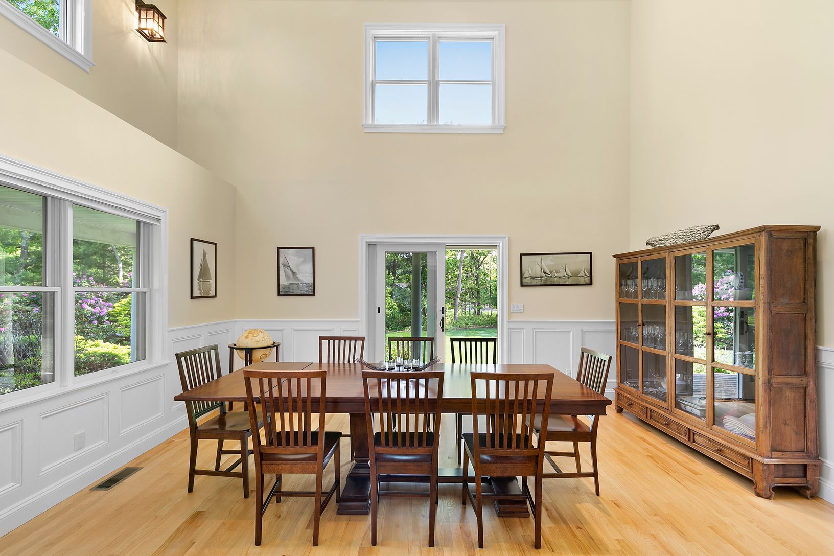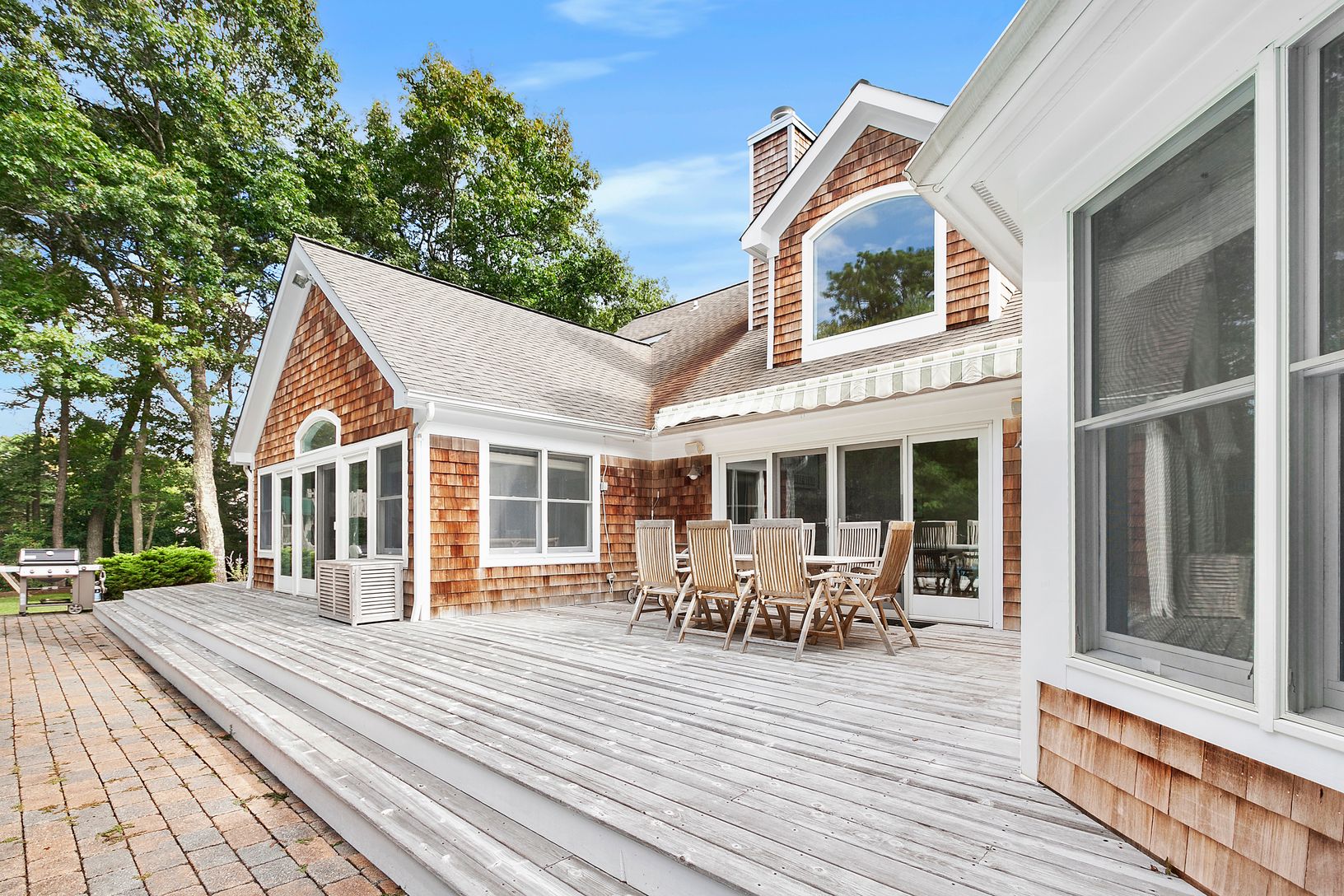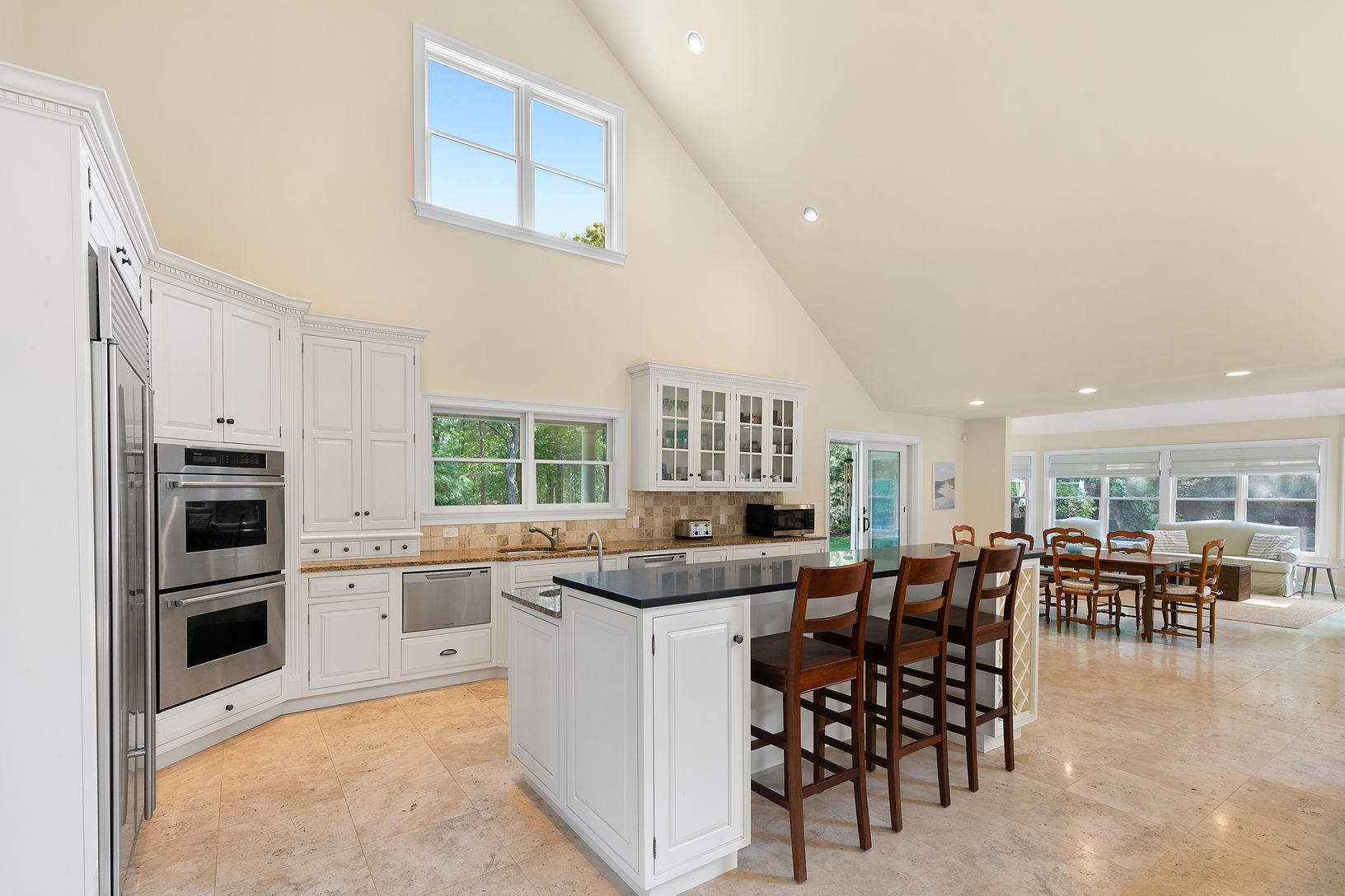 On over an acre of mature landscaping and manicured lawns, this 4-bedroom Post Modern offers an open-concept floor plan with double-height ceilings. The high-end custom kitchen joins the living area with fireplace and sliders to the deck, while the eat-in breakfast area and adjacent sitting room looks out over the pool. A separate formal dining room, cozy den, and full bathroom complete the main living space. The generous first floor maste