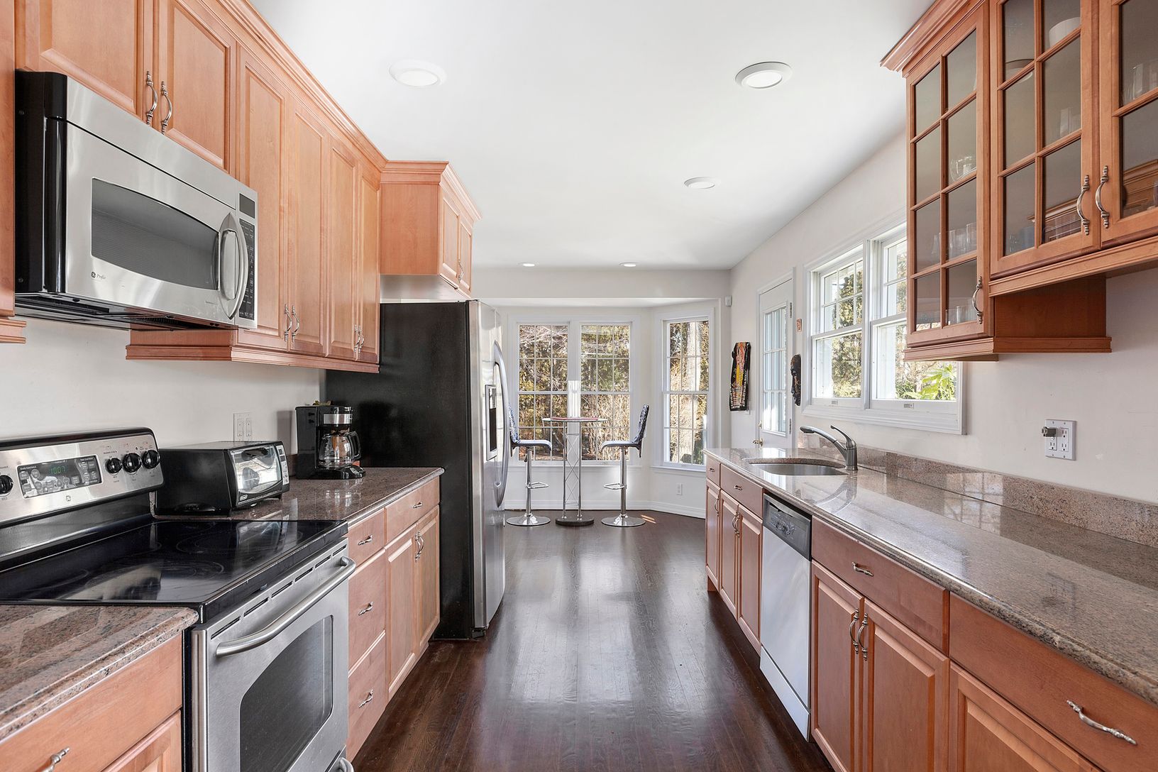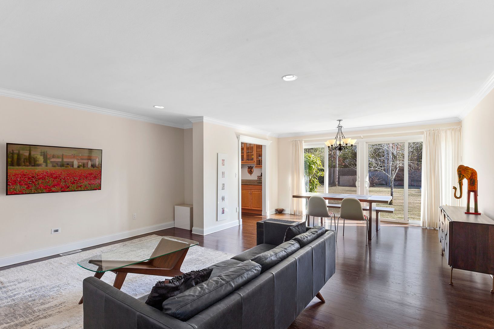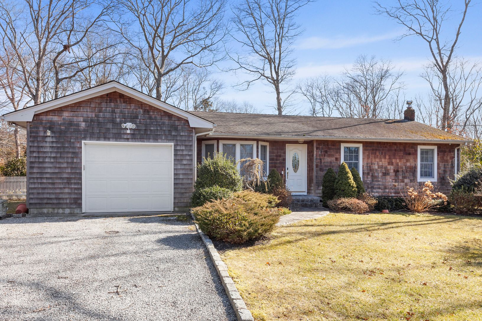 1 Beechnut Court, East Quogue. Located on a quiet cul-de-sac street, this updated ranch features three bedrooms and two baths, including an en suite master bedroom. House also includes large living room / dining room combination, overlooking vast backyard through Andersen sliders, galley kitchen with granite countertops and eating nook, finished basement, attached oversized one car garage, security system, Nest thermostats, central vacuum, and