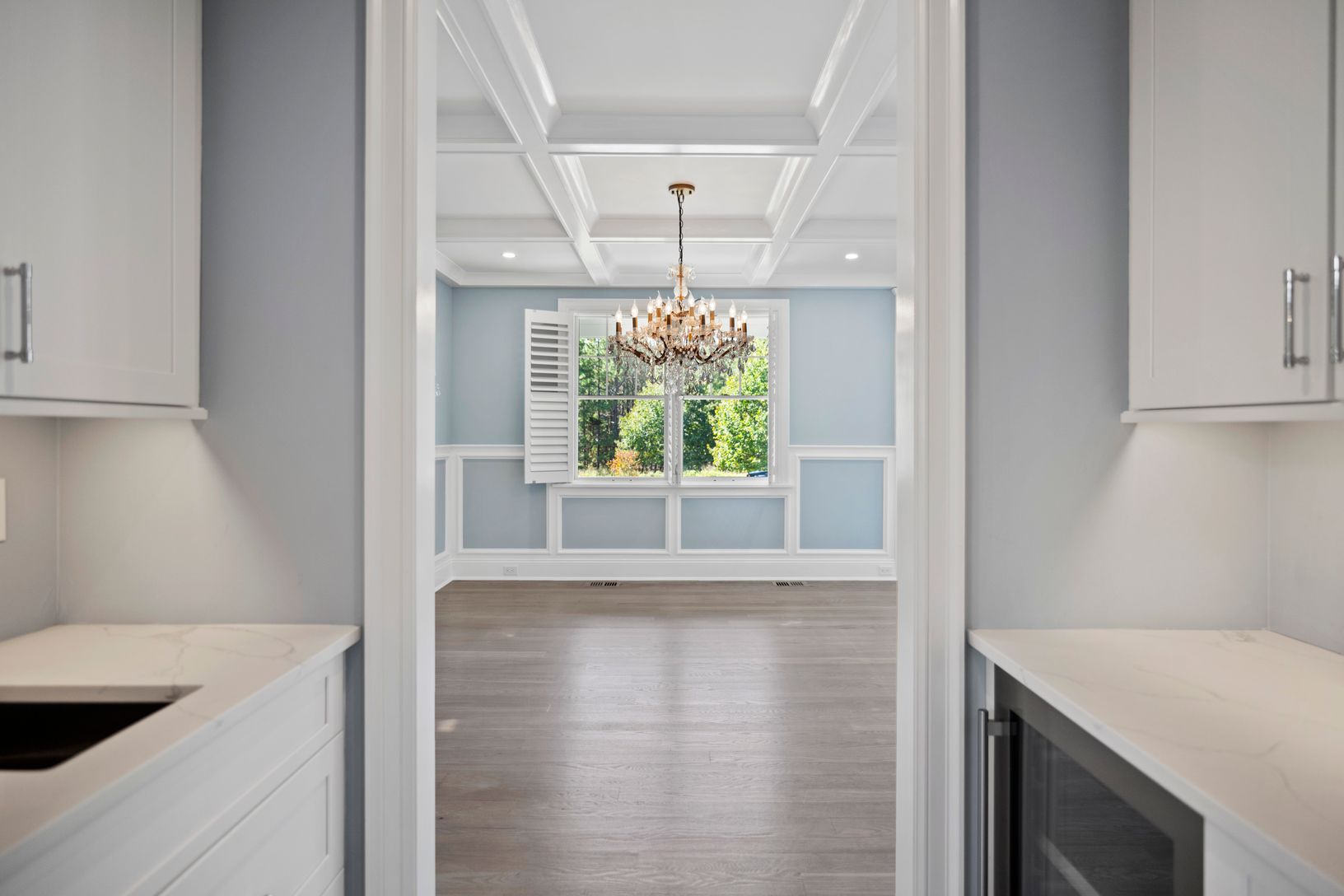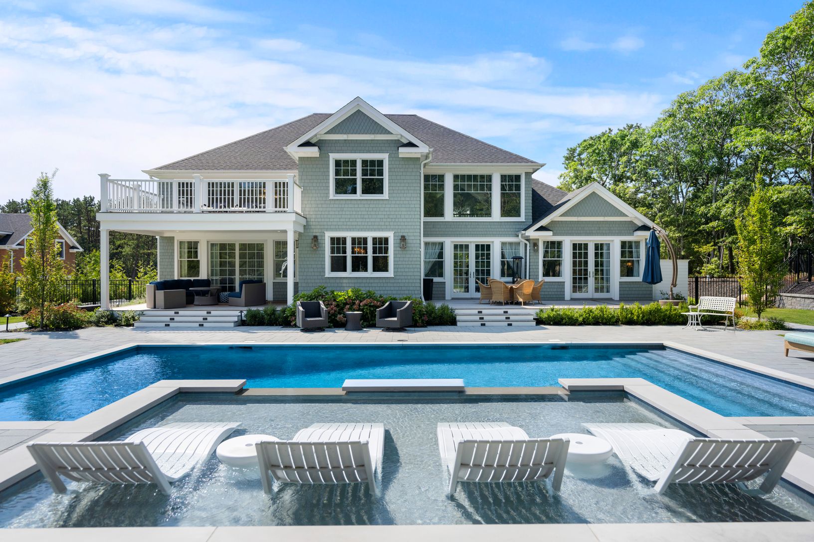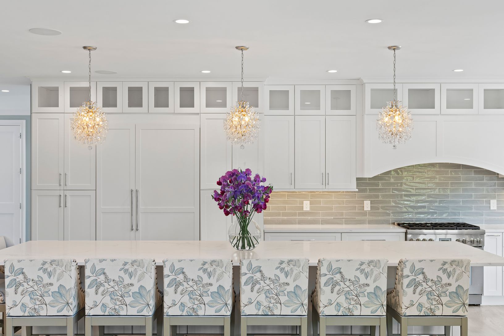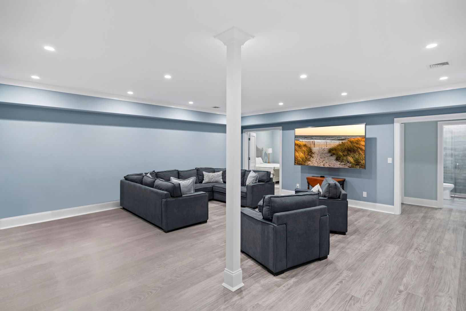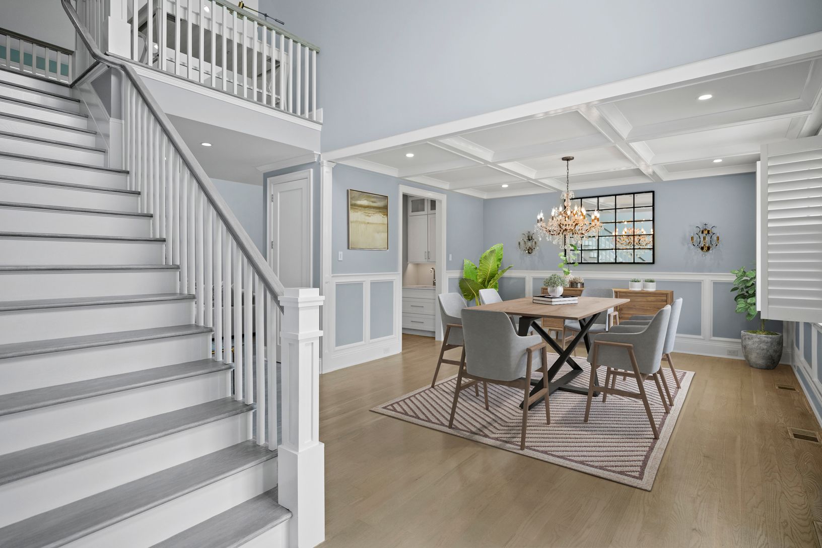 As you enter this 6600 sq ft home you feel a tranquil calm instantly upon entering with the beautiful light that radiates the entryway with a ceiling height towering almost 30 feet. The coastal color palette carried throughout the entire space are soft hues of blue that transition incredible into the gorgeous flooring in hues of grey and are absolutely stunning. The meticulous attention to detail and the unwavering commitment to superior craft