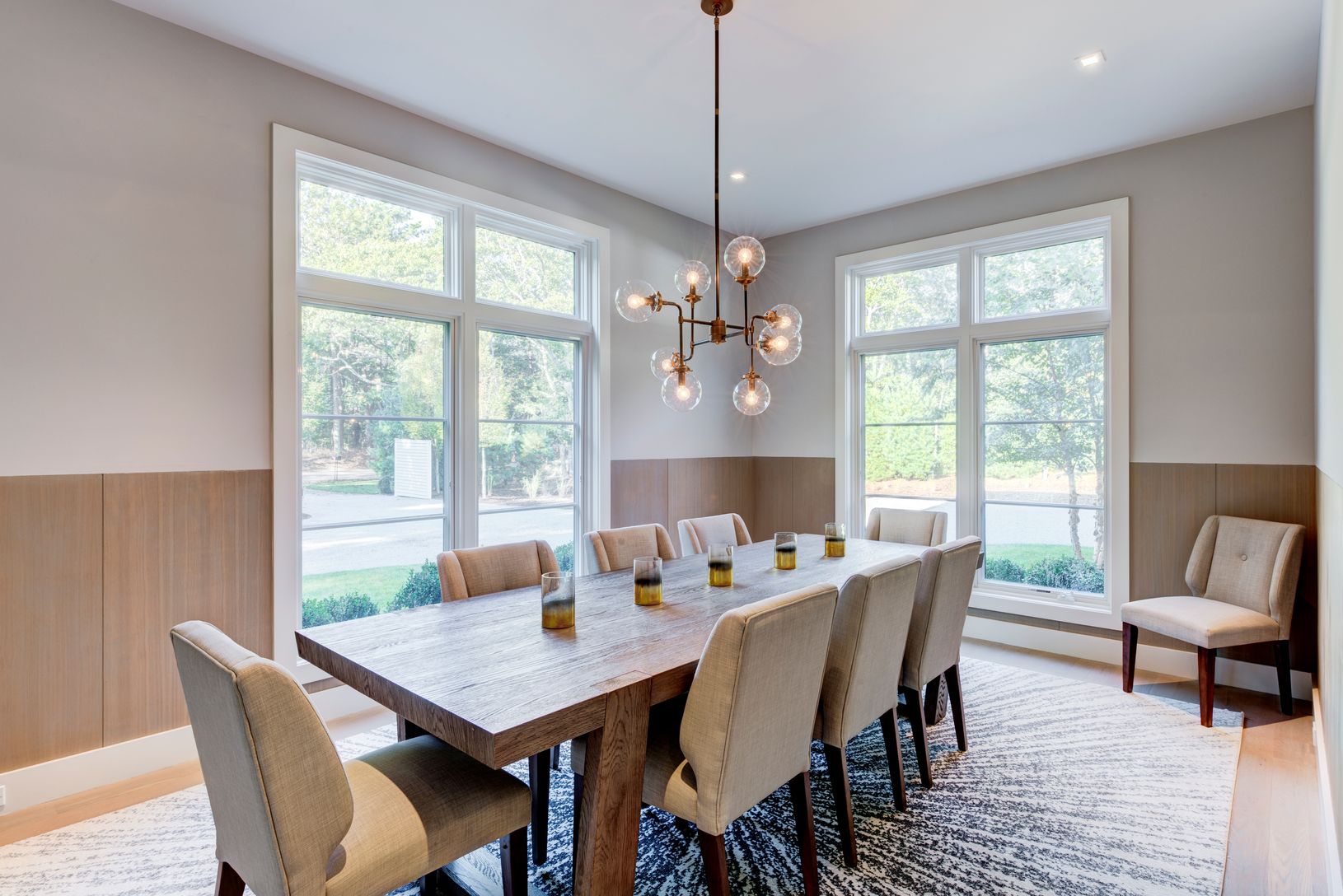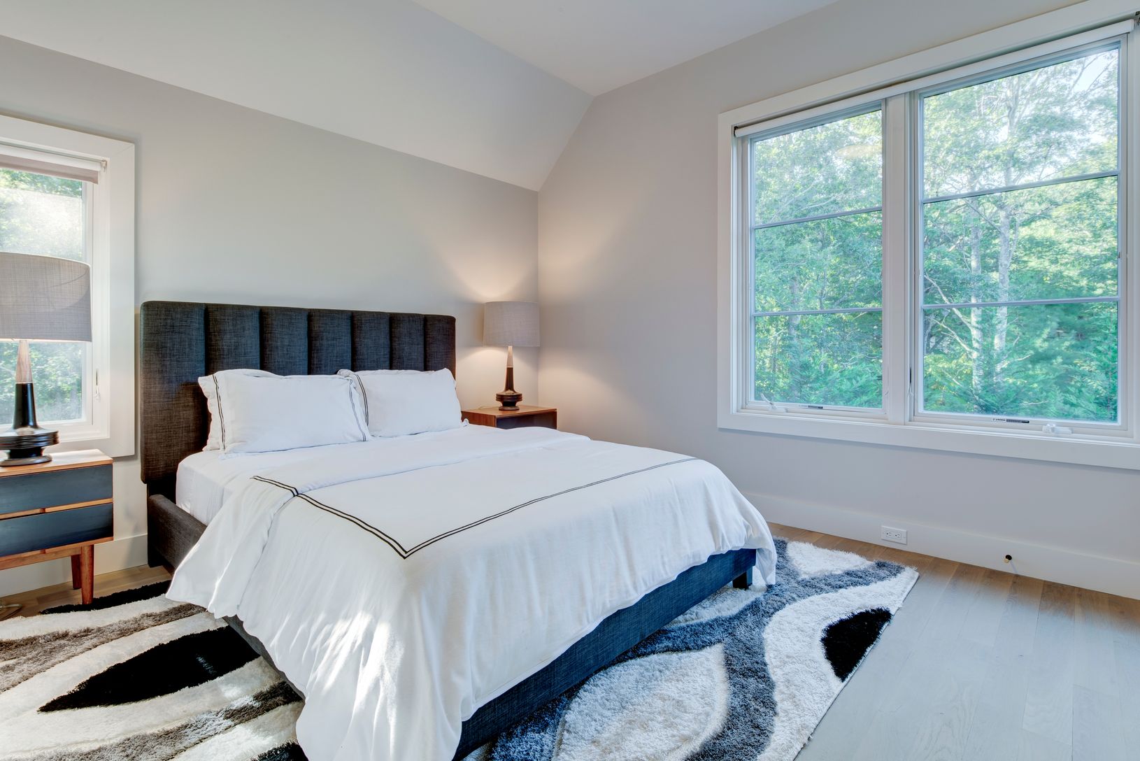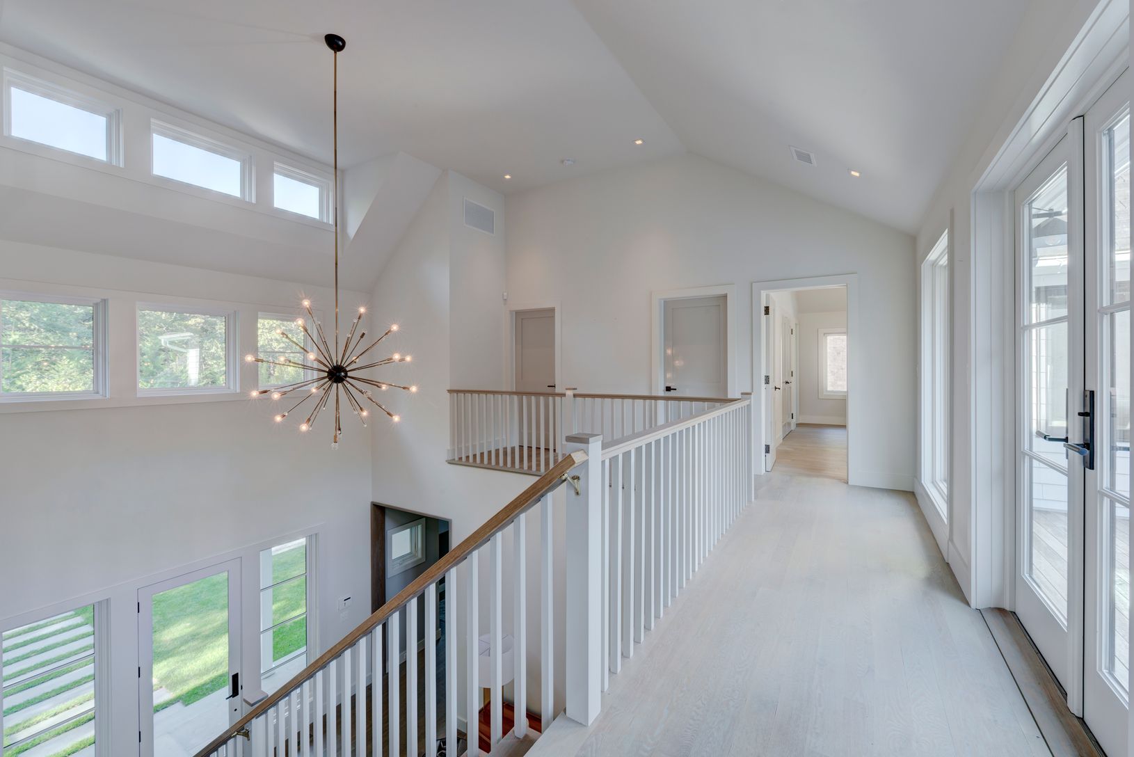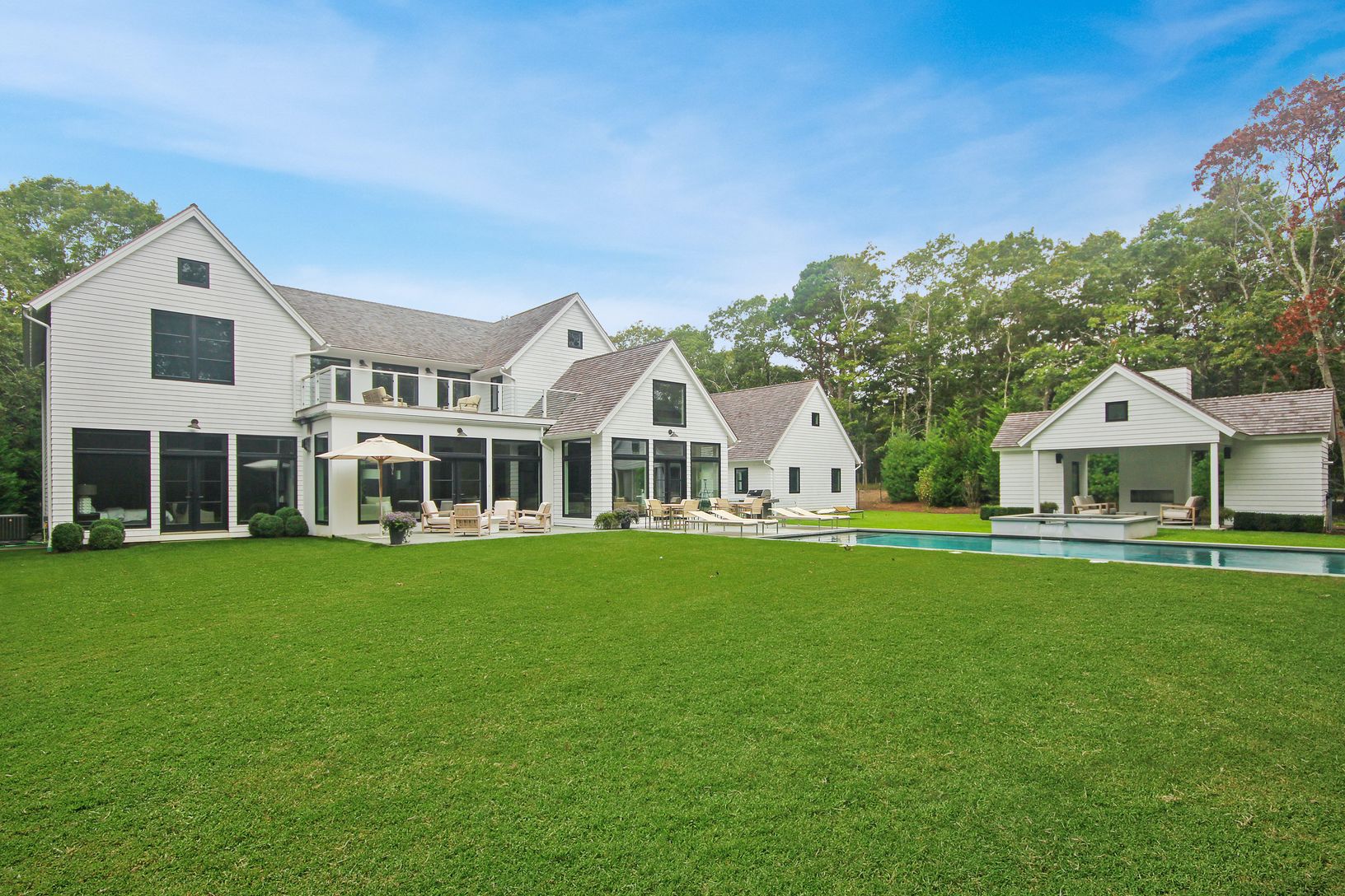 Travel through a front entry gate past a detached two car garage to arrive at this dramatic seven bedroom contemporary barn. Well located close to East Hampton Village, at the end of a private cul de sac, bordering a reserve on three sides, no expense was spared in the construction of this quality home. As you step inside a grand entry overwhelms, with double height ceiling and striking staircase. A spacious great room with stone gas fireplace