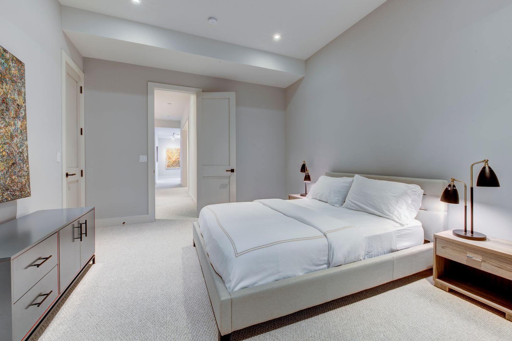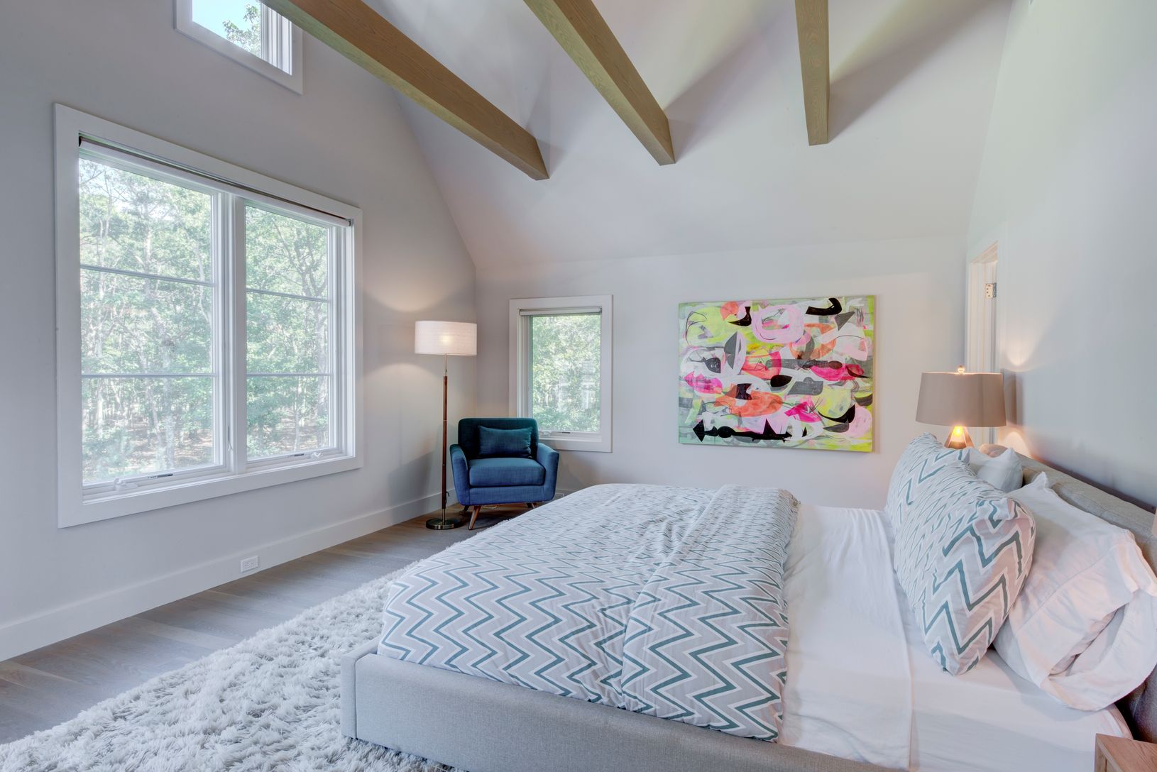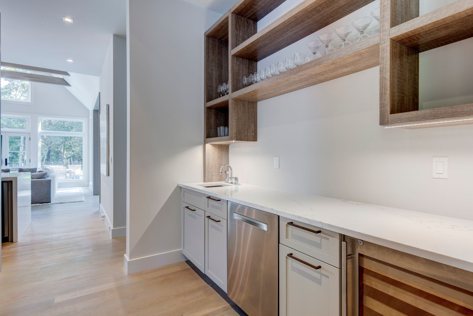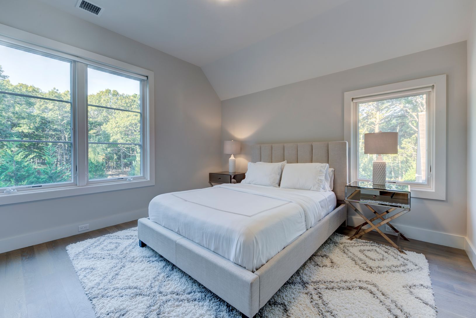 Travel through a front entry gate past a detached two car garage to arrive at this dramatic seven bedroom contemporary barn. Well located close to East Hampton Village, at the end of a private cul de sac, bordering a reserve on three sides, no expense was spared in the construction of this quality home. As you step inside a grand entry overwhelms, with double height ceiling and striking staircase. A spacious great room with stone gas fireplace