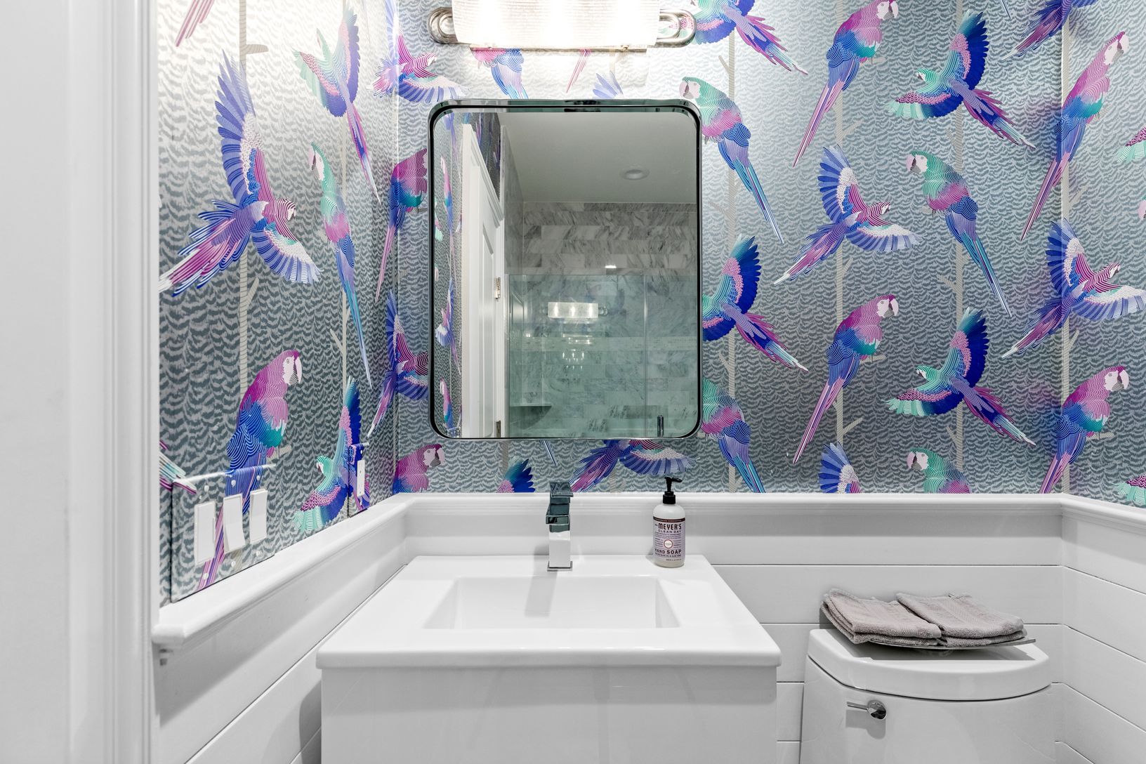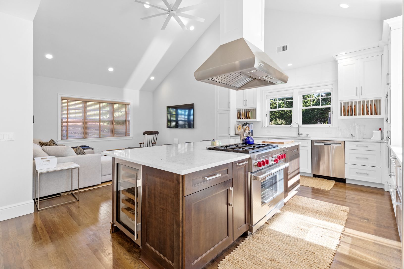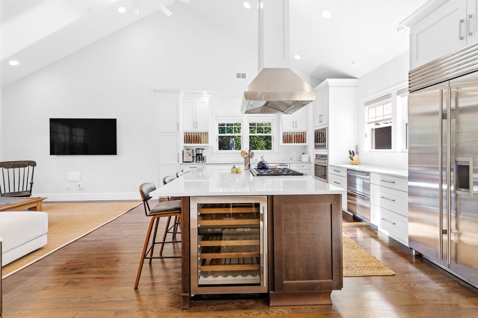 The chef’s kitchen, equipped with premium appliances, flows effortlessly into two living rooms, one