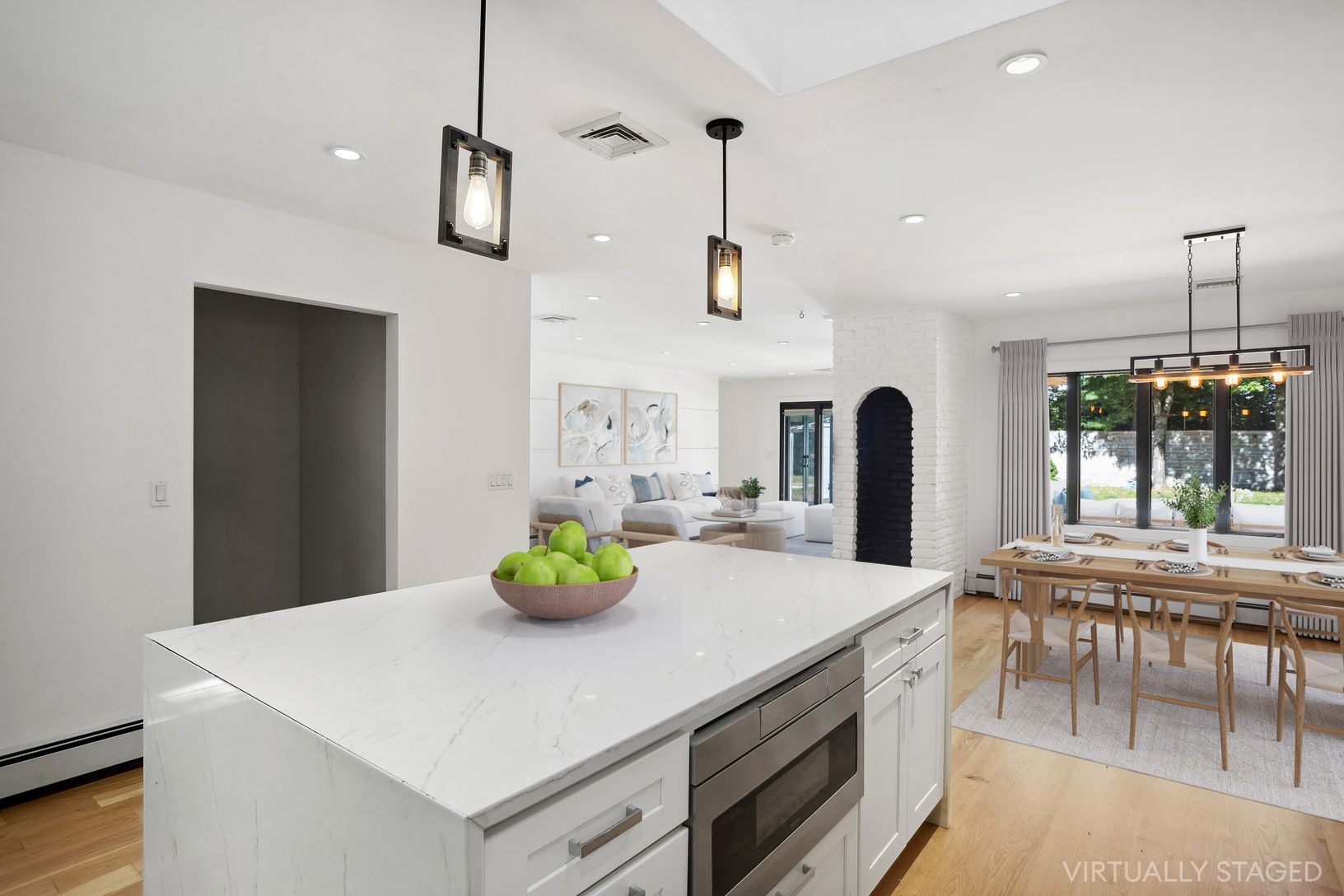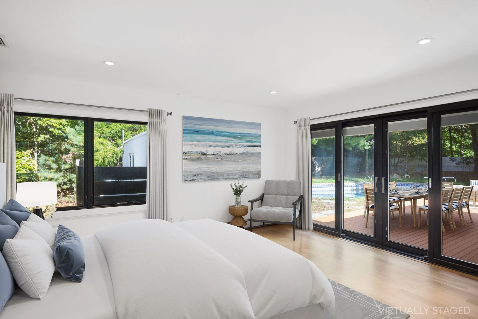 This renovated contemporary boasts three bedrooms and two and one-half baths on the main floor plus a walk-out lower level with media room, bathroom and two bonus rooms. The location is perfect for boaters and beach goers at less than a half mile to Three Mile Harbor and less than a mile to Sammy's Beach. As you enter the home and pass the foyer you will find a large living room with a wood burning fireplace and multiple sliders to the park li