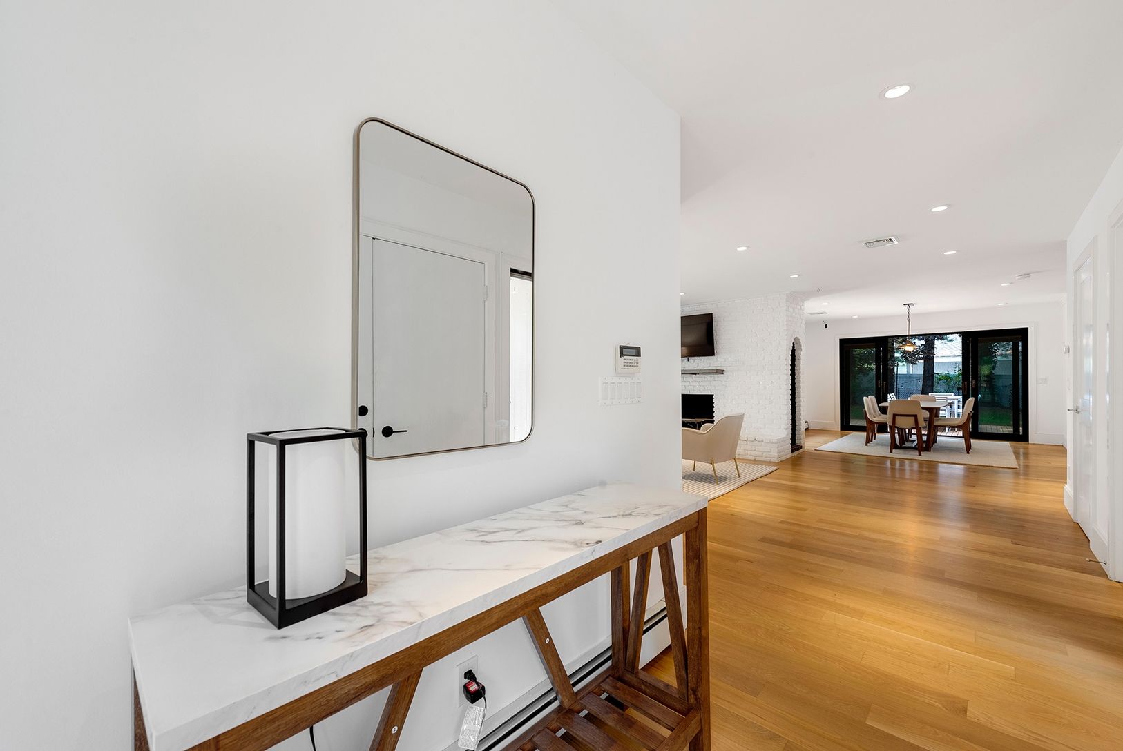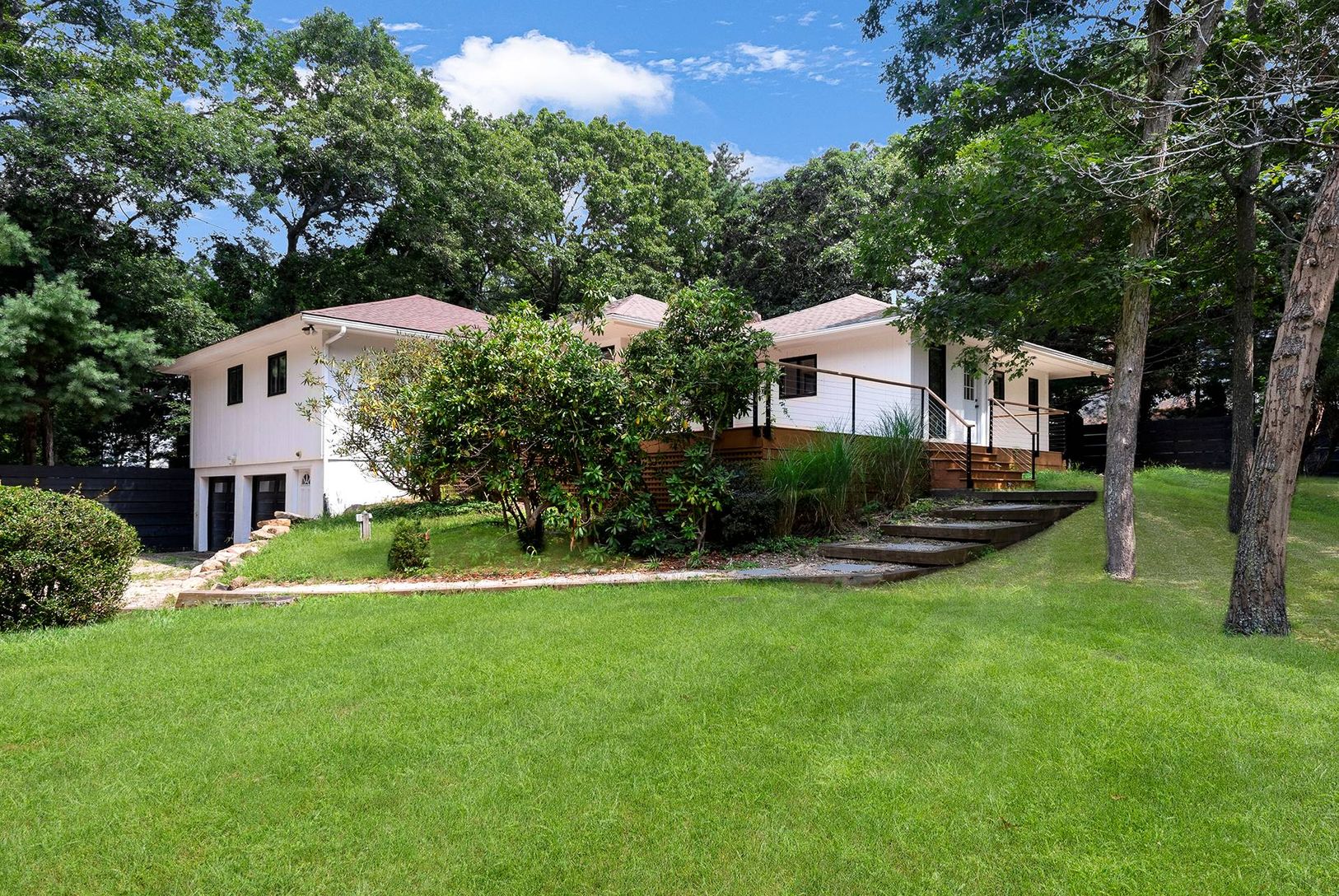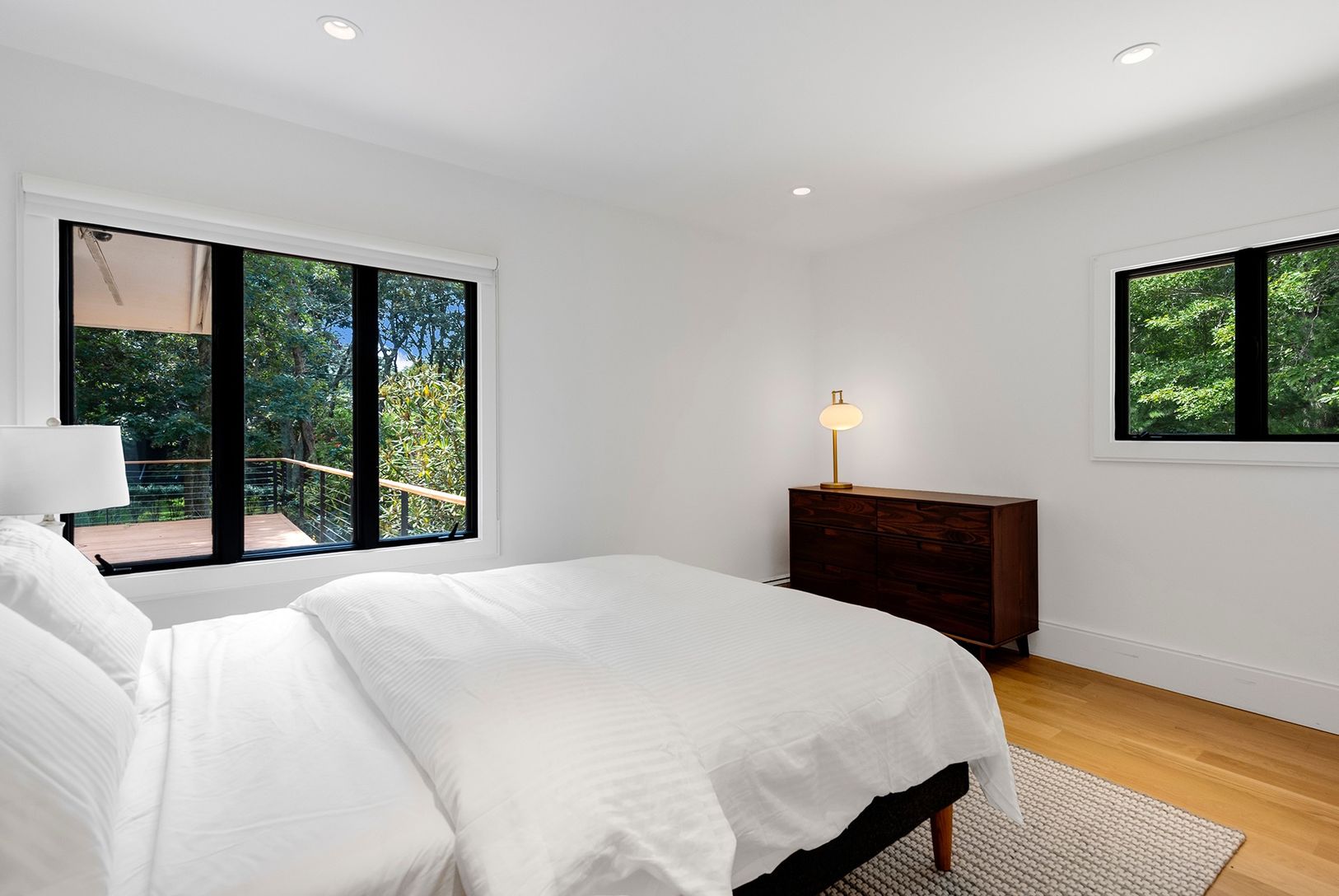 Perched atop High Point Road this lovely renovated 3 bedroom, 3 and one-half bath sun filled contemporary home offers a rare opportunity in Settler's Landing, a water community. The main level is an open floor plan with new wide panel oak flooring throughout and offers a chef kitchen with Bosch stainless steel appliances, an open dining and living room, a guest powder room plus a laundry room. The primary en-suite bedroom and two guest bedroom