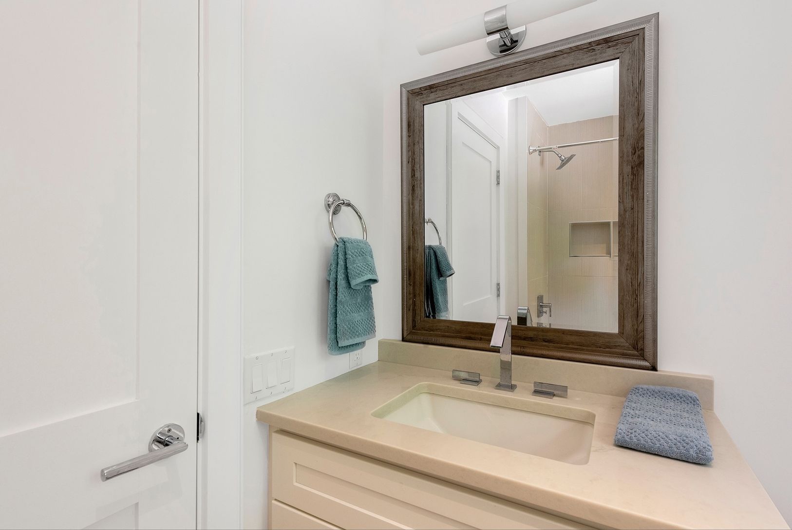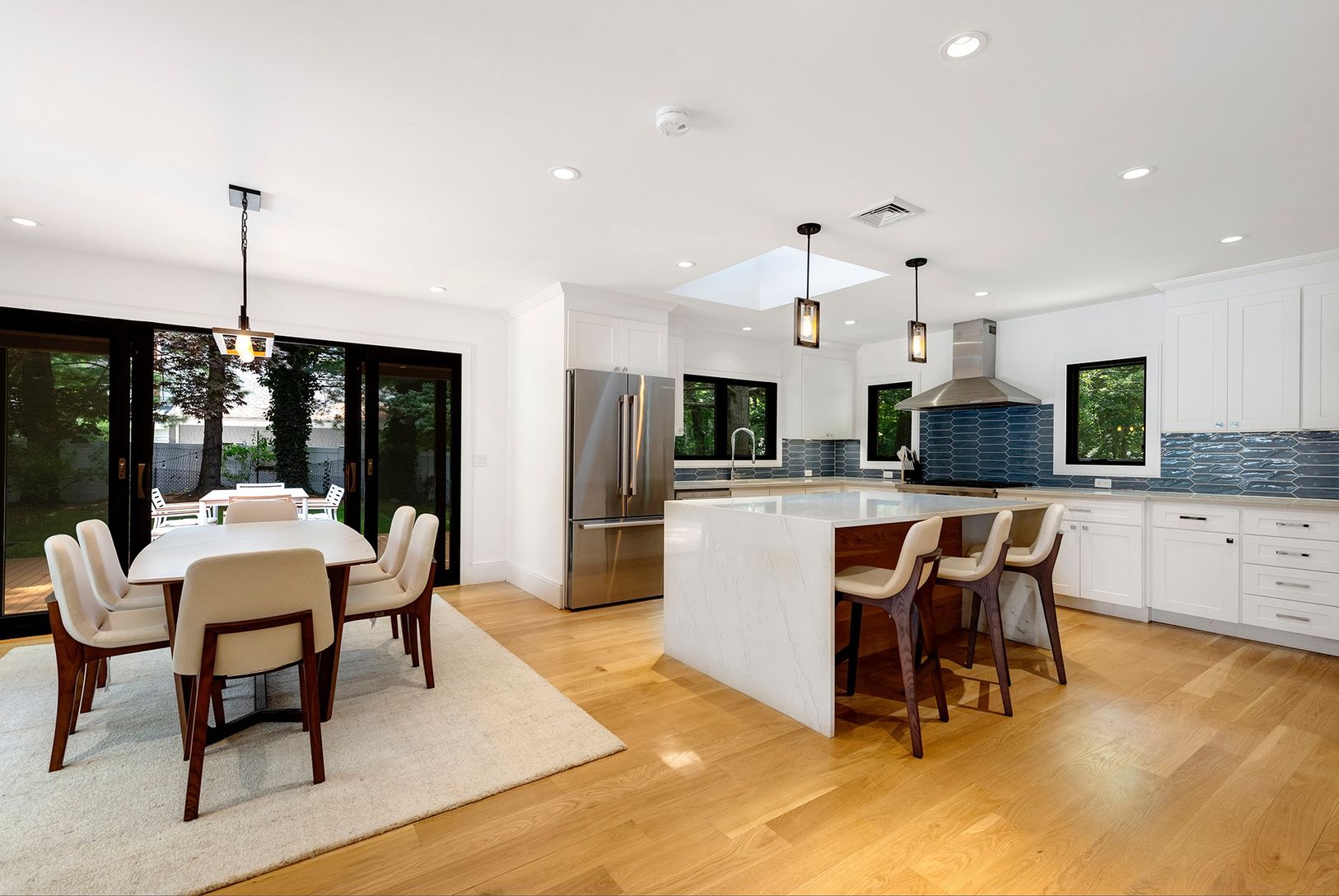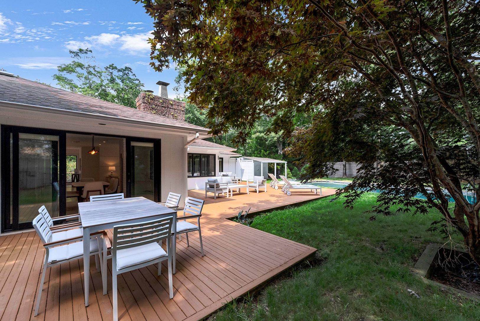 Perched atop High Point Road this lovely renovated 3 bedroom, 3 and one-half bath sun filled contemporary home offers a rare opportunity in Settler's Landing, a water community. The main level is an open floor plan with new wide panel oak flooring throughout and offers a chef kitchen with Bosch stainless steel appliances, an open dining and living room, a guest powder room plus a laundry room. The primary en-suite bedroom and two guest bedroom