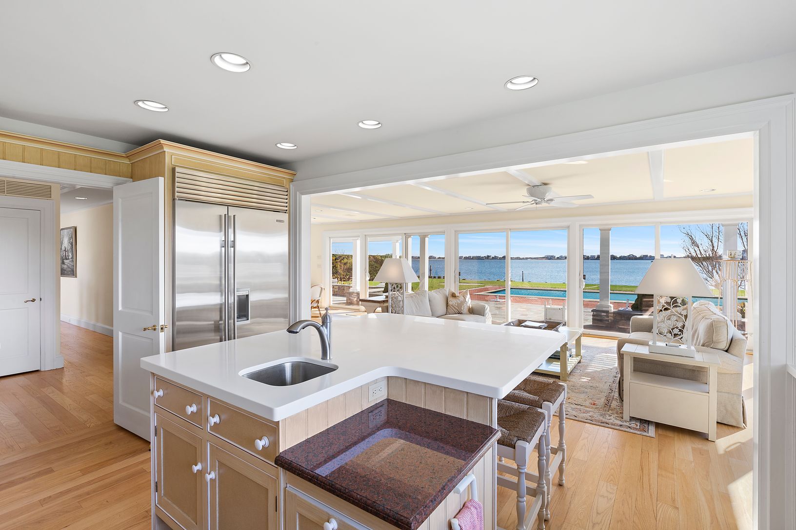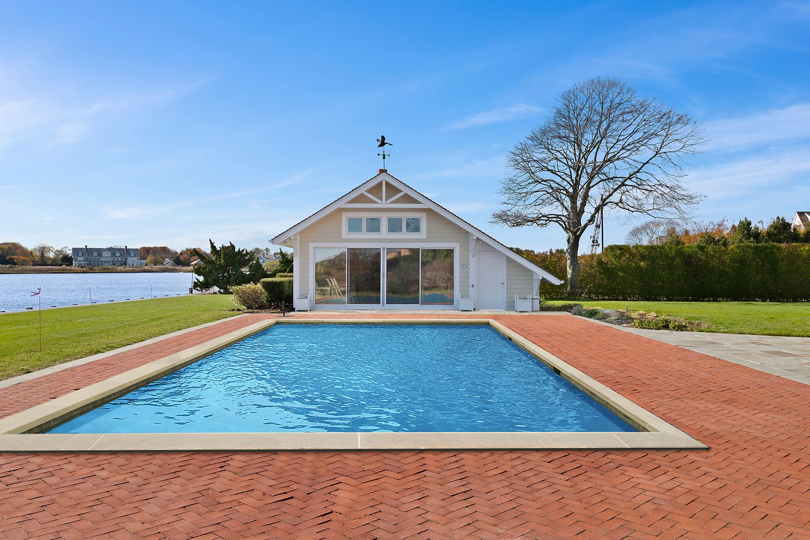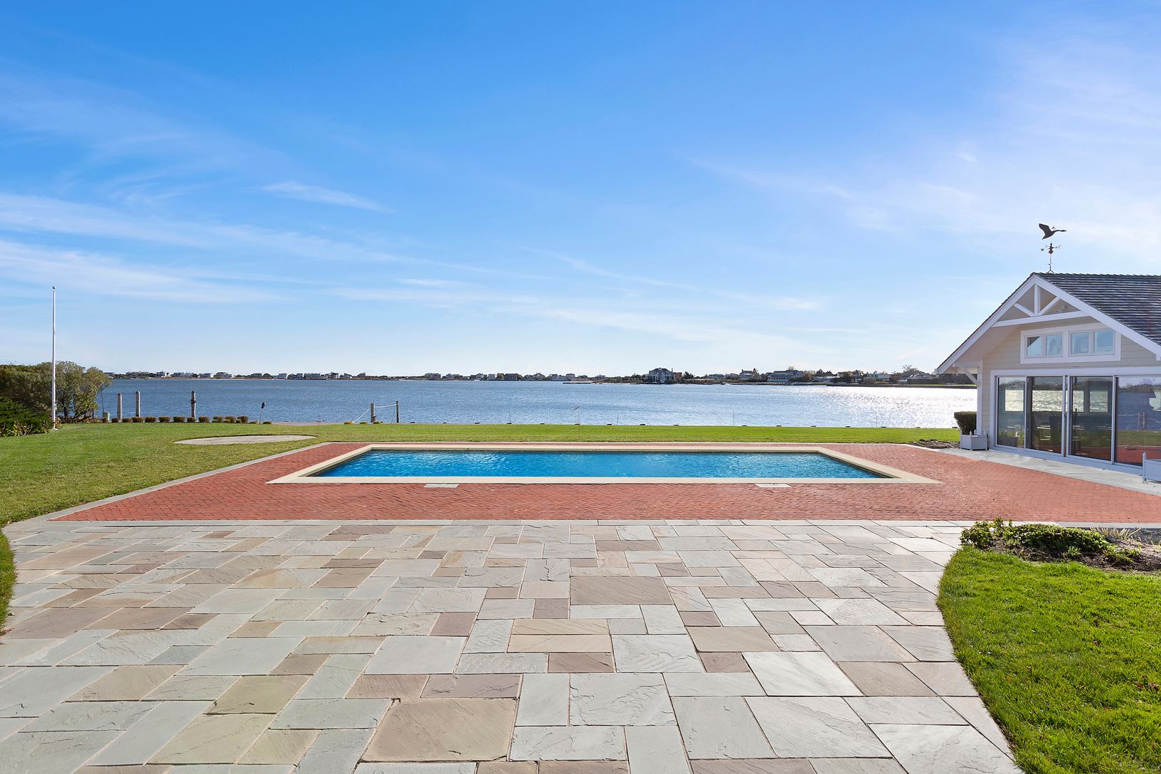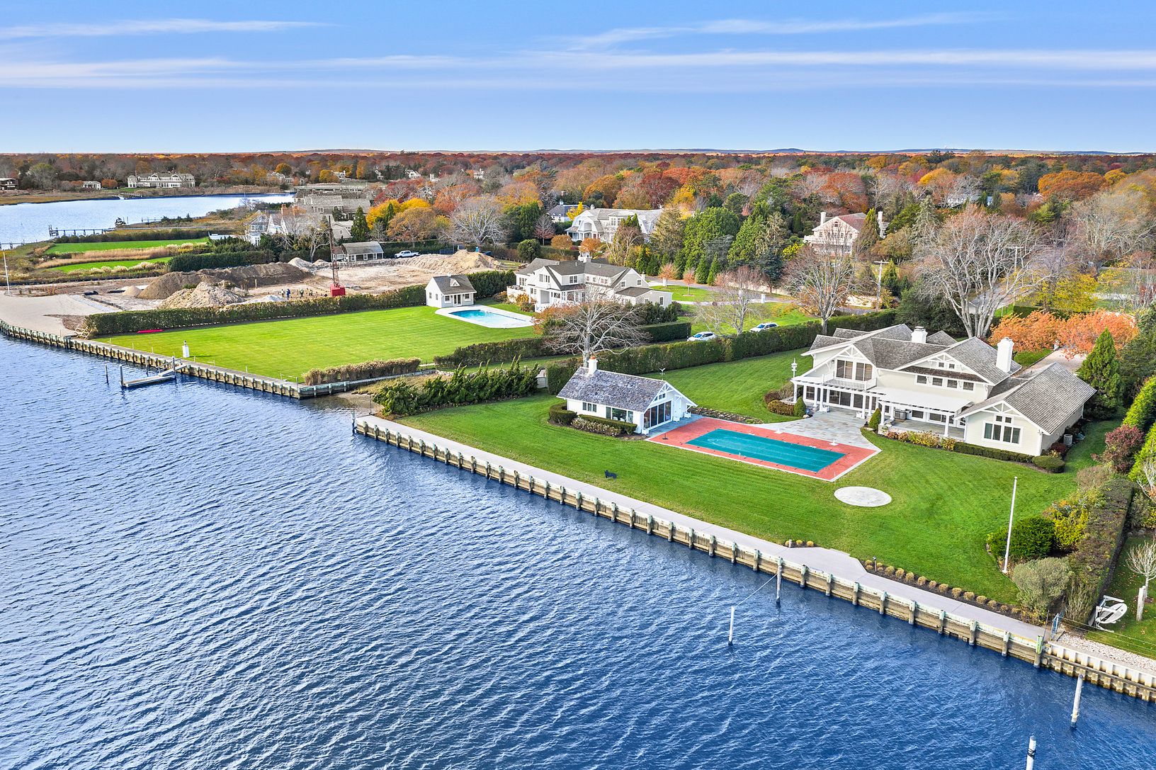 Sun-splashed and spacious! Over an Acre of Bulkheaded property in the most sought after and private enclave in Quiogue. Heated Gunite Pool, Oversized Pool-Guest House with kitchenette & full bath and Floating Dock. Water, water Everywhere! Spectacular Views from Living room, Dining room, Morning room and Kitchen. 4 En suite Bedrooms including First and Second Floor Masters, both with Exceptional Views. Library, Home Office, Media Room, 2 p