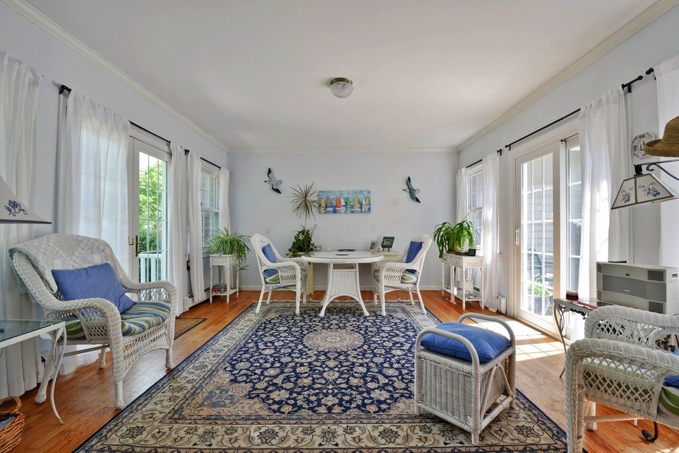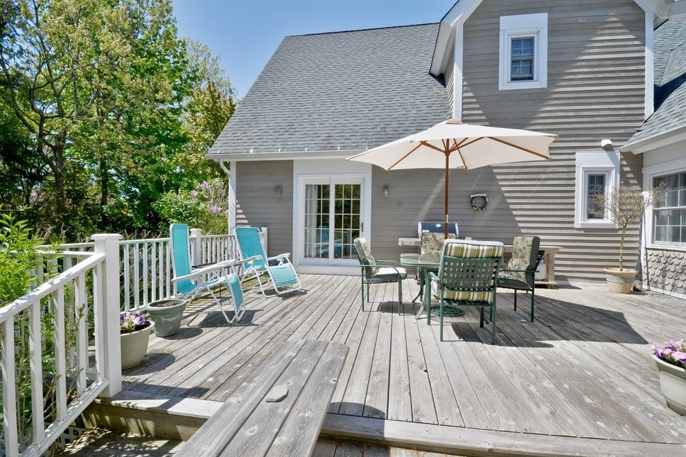 This welcoming home has a living room with coffered ceiling and white brick fireplace, a generous size dining room and a wonderful stainless and granite kitchen with an exceptionally large dining area. A first floor master suite opens to an expansive and private sunning deck. Also on this level is a sunroom whose French doors open onto a large dining deck. Upstairs there are an additional two bedrooms with a full bath. Above the two car ga