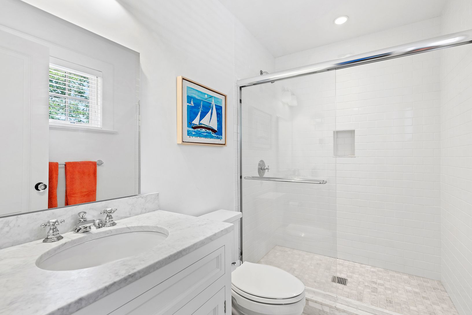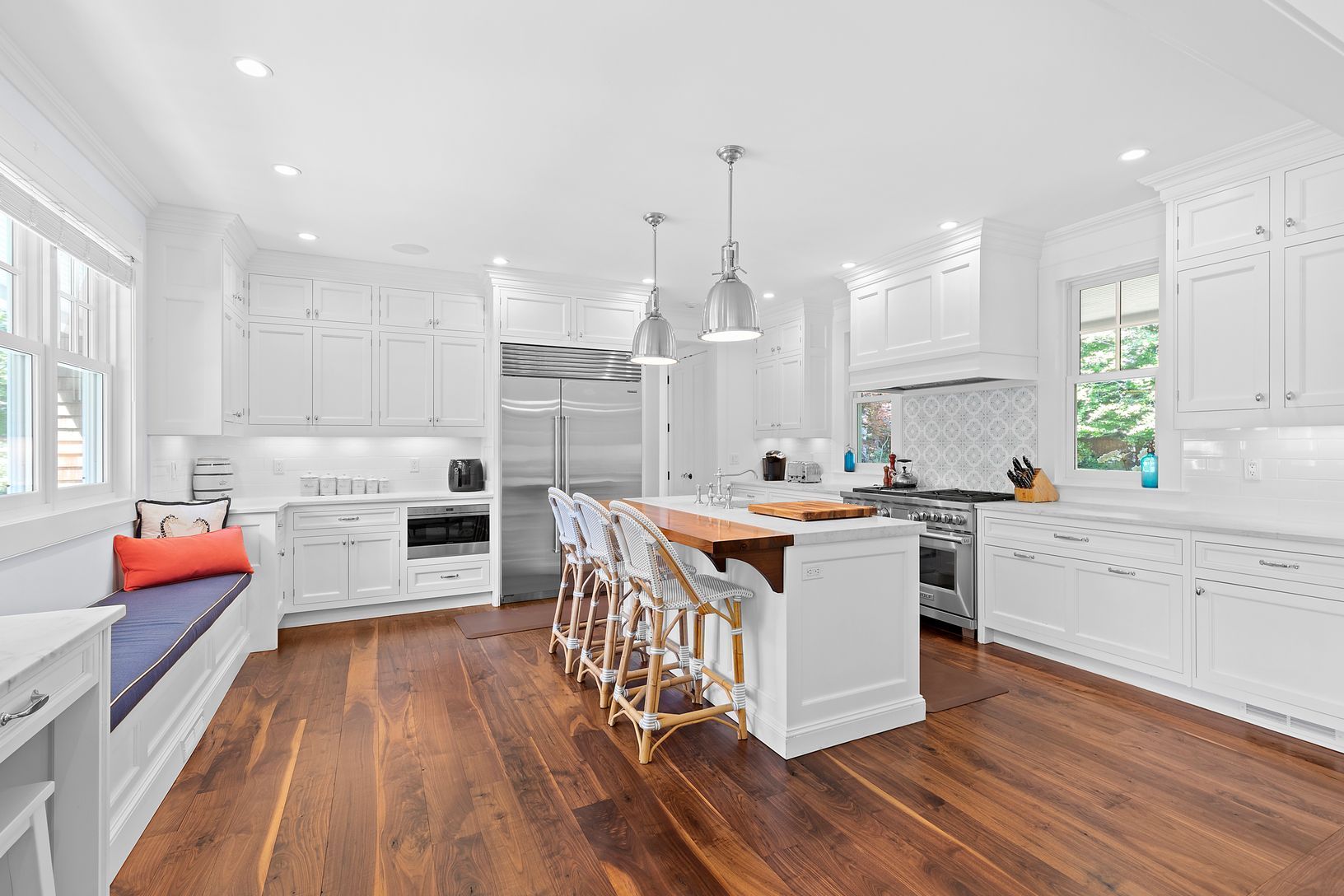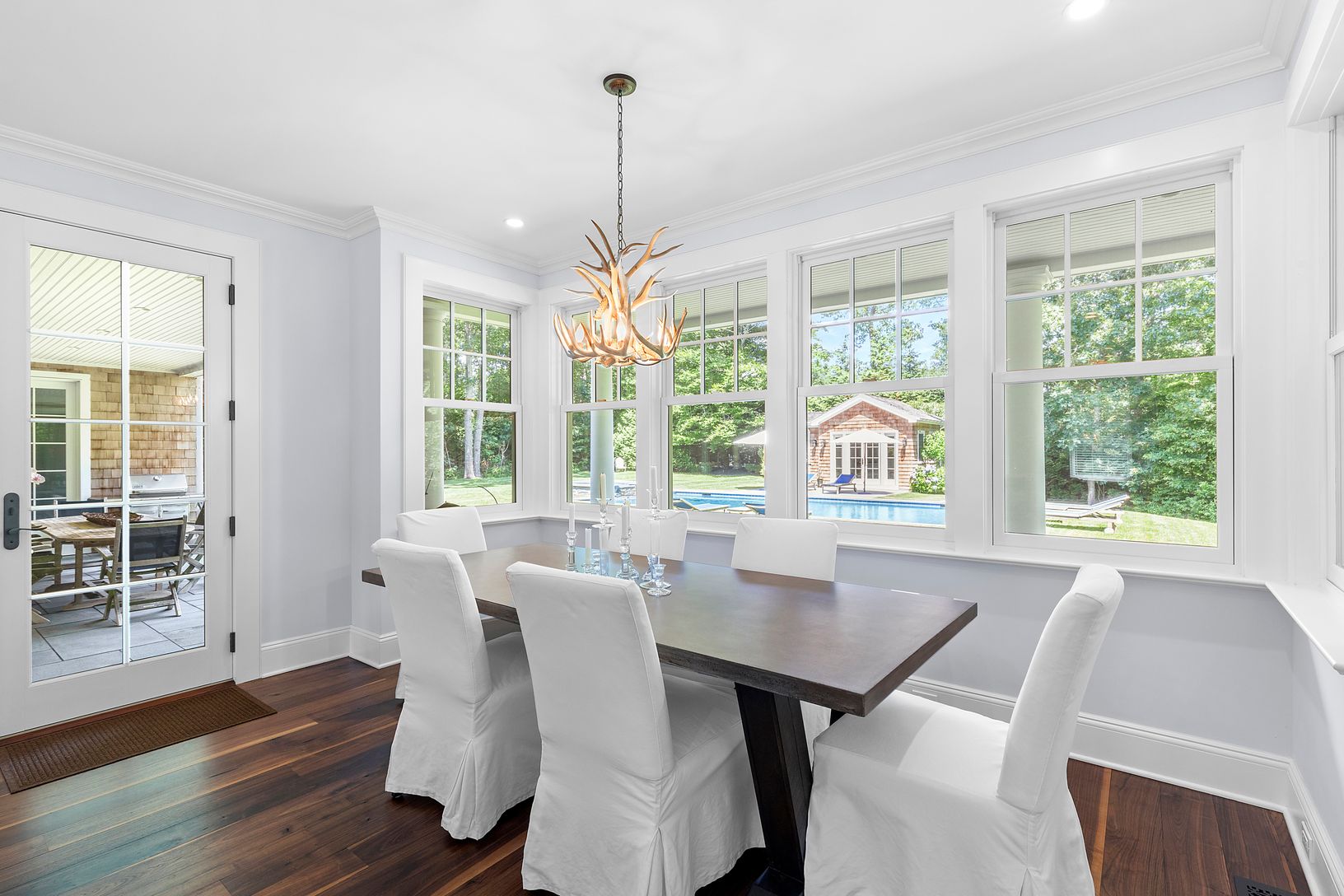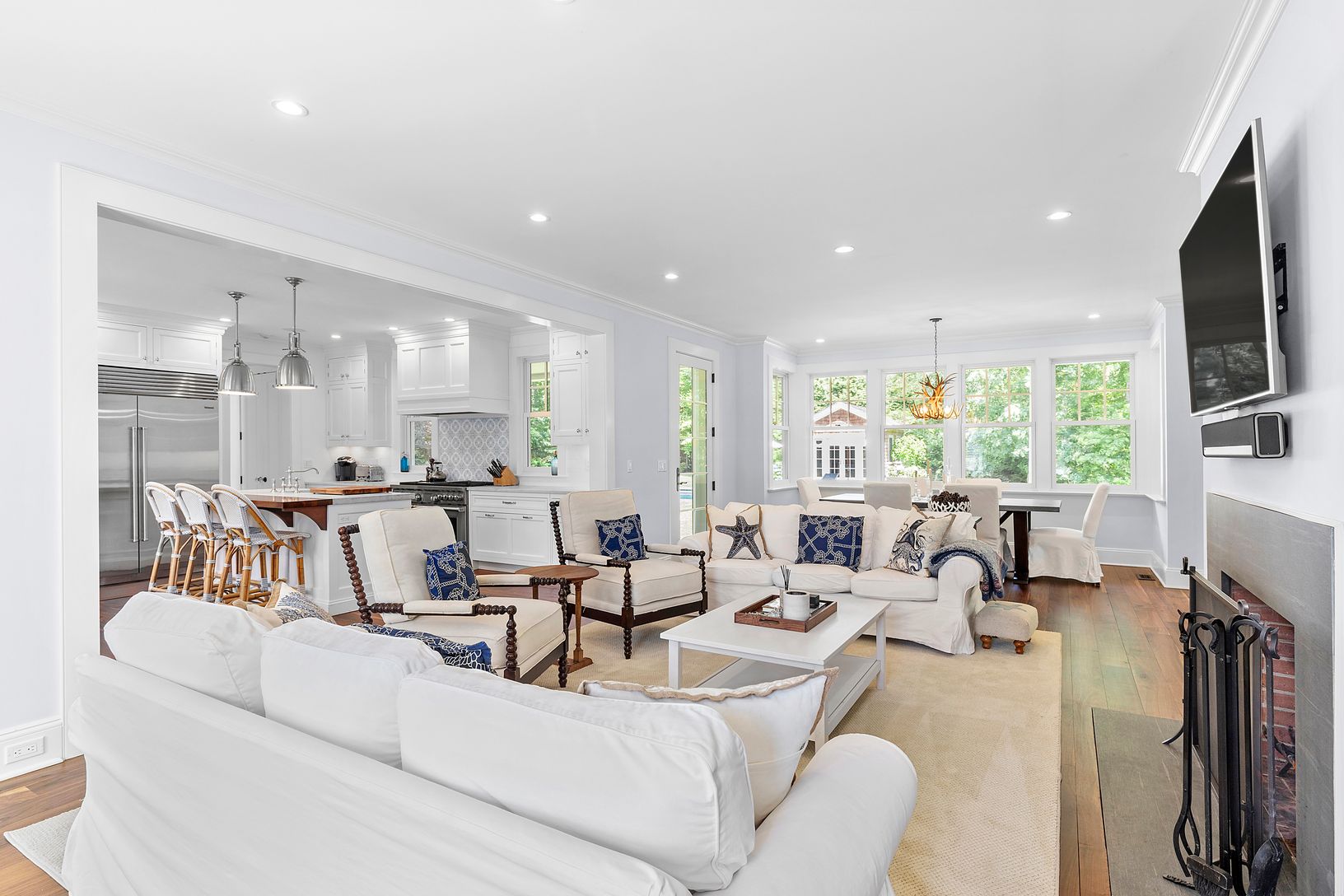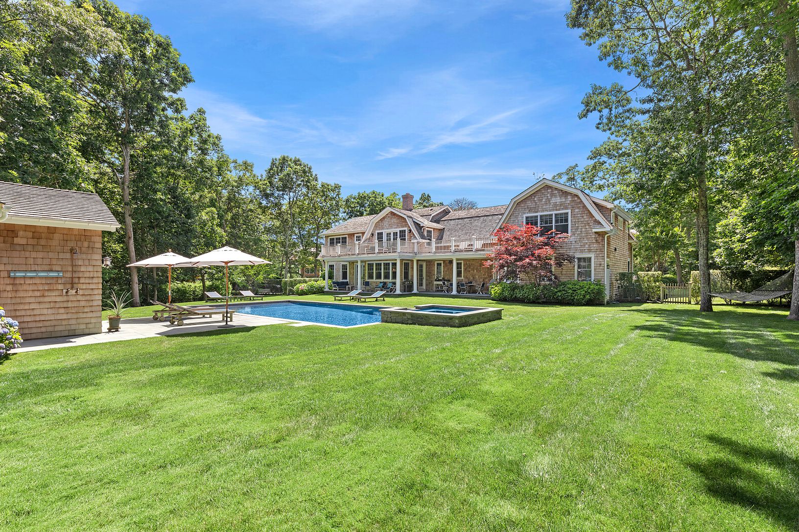 This beautifully designed and impeccably furnished home offers a large open living and dining space with wood-burning fireplace. French doors open to a covered patio that overlooks the heated pool and pool house. There are six bedrooms, including one on the first level, six full baths and two half baths. A fully finished lower level has a game room, bar and media lounge plus a bedroom and bath. The property includes everything you need for sum