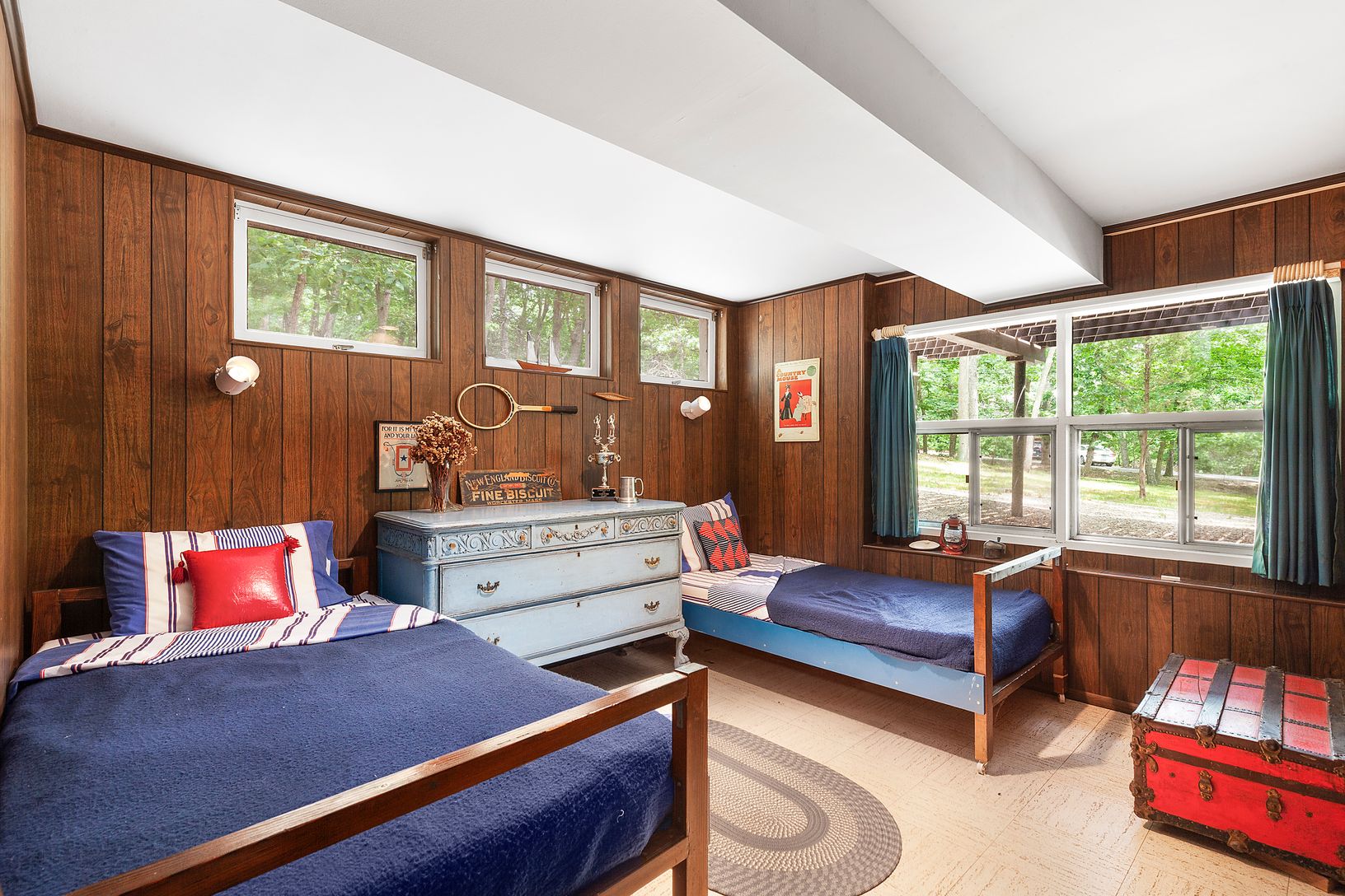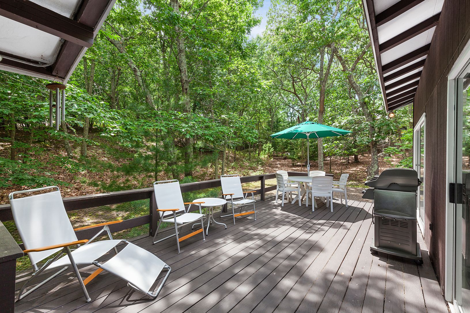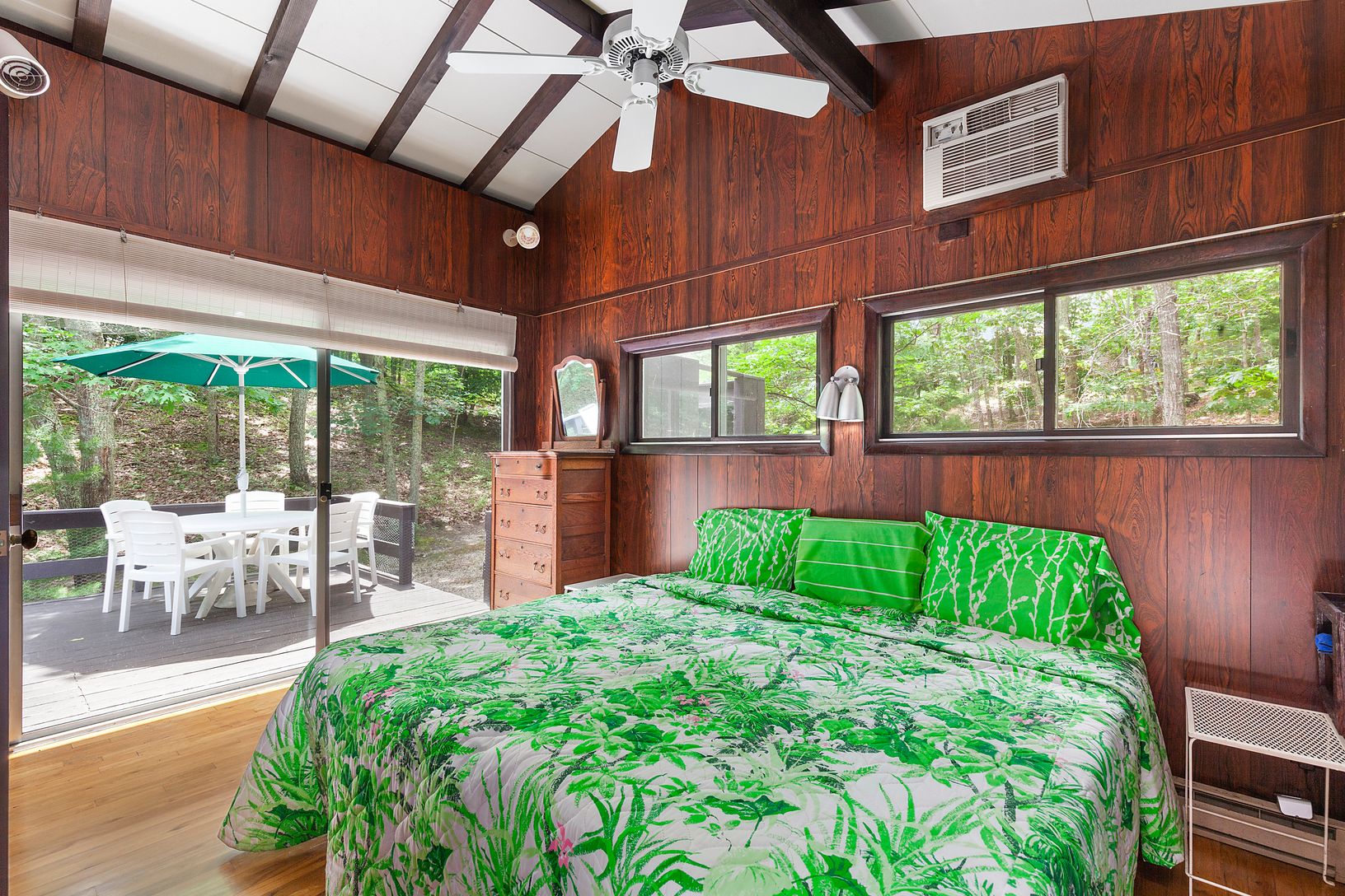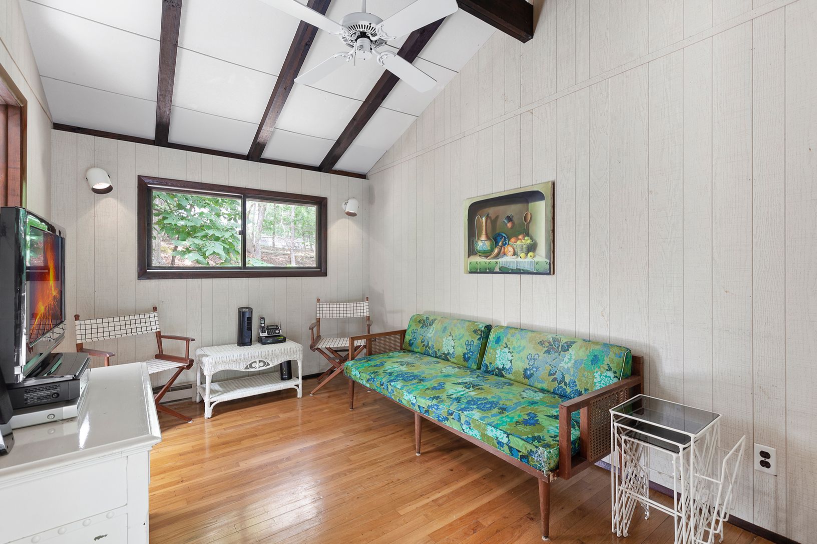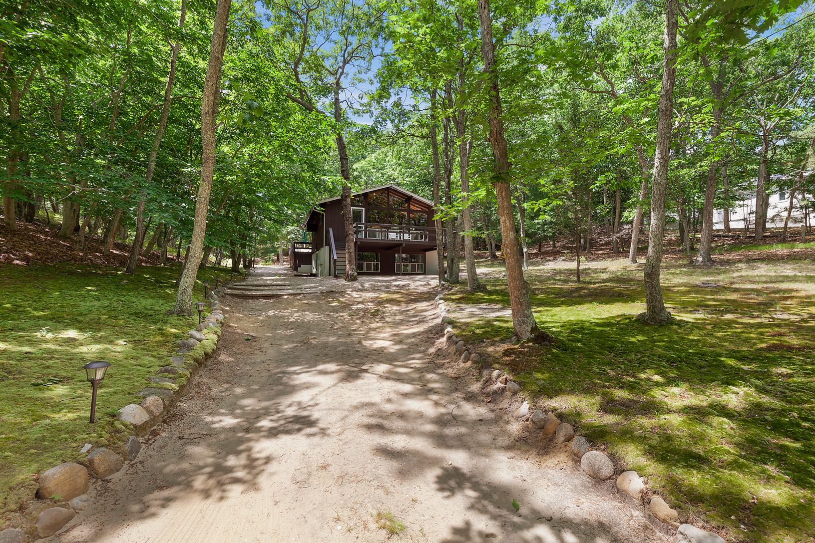 Located in a water community is this perfectly maintained home. The house is Classic A-Frame with 4 bedrooms and 2 Baths, large living room with floor to ceiling glass bring in natural light. The Living room has a wood burning stove, hardwood floor and exposed beams in the ceiling. The master bedroom is en-suite with sliding doors leading outside. There is a large deck and outdoor showing. The house has room for a pool and to expand.