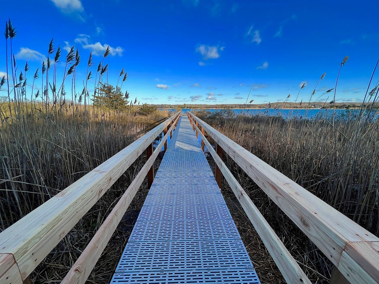 Perfectly located in front of water access in the historic and private Hampton Waters community in East Hampton, unwind at this stunning original Mid-Century home. This freshly renovated two story, four bedroom, two bath house was built with white oak floors, beamed ceilings with skylights, and antique details for a luxurious yet charming feel. It features an expansive living area with floor to ceiling windows, wood burning stove, and an orig