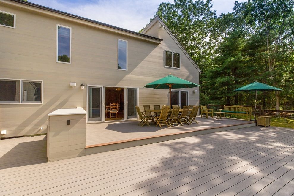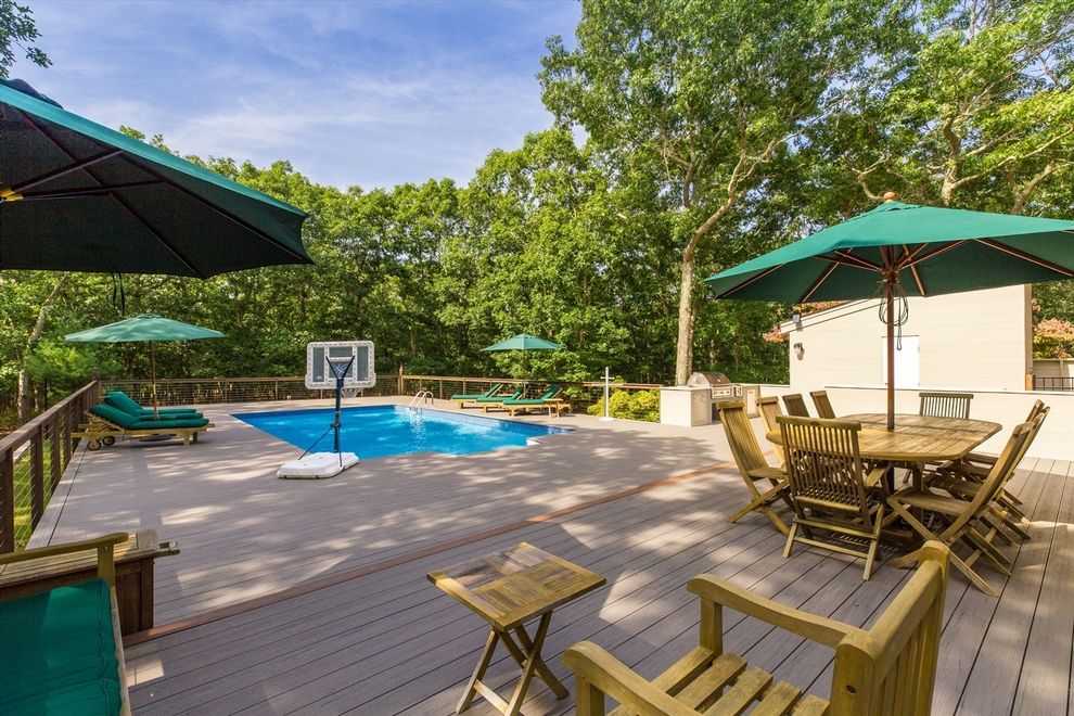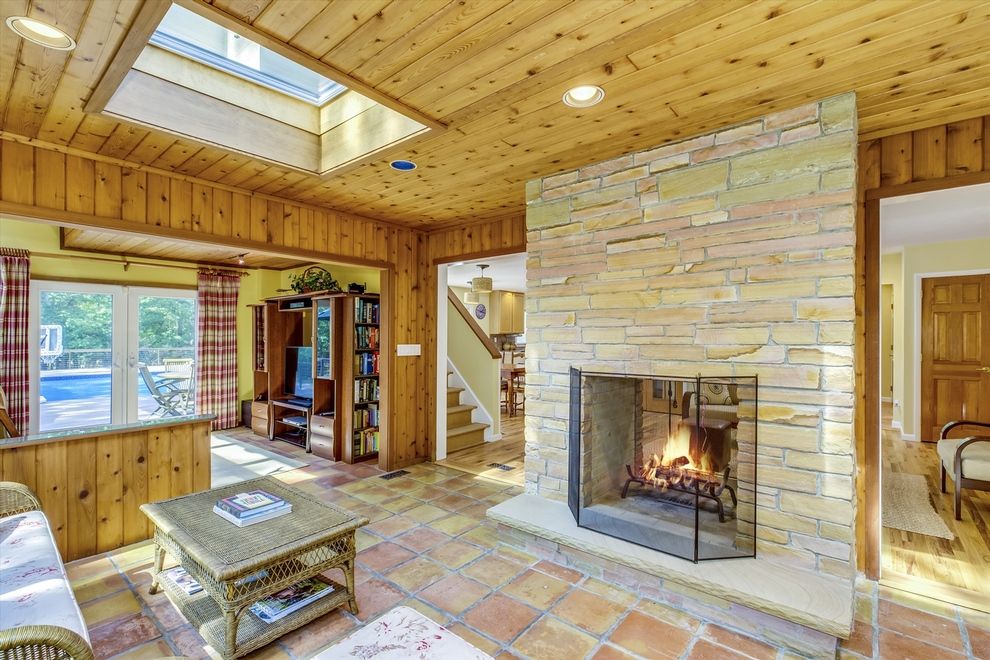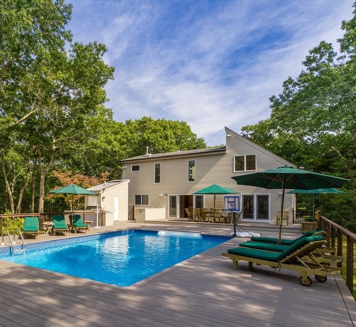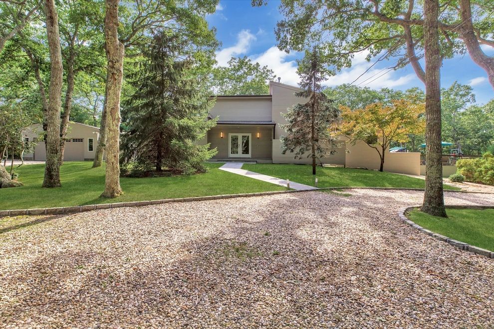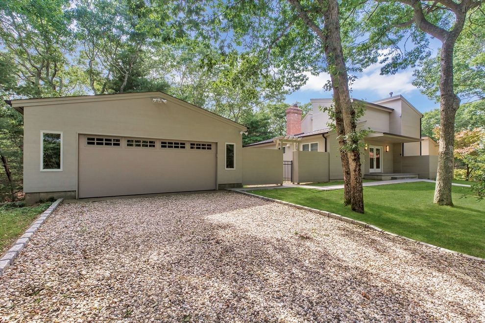 Curb appeal in East Hampton with lots of eye-popping details and everything one needs are found inside this one-of-a kind home at 1 Short Lane, surrounded by 1.9 acres of pristine woods. Gracious living space with a most desirable, open plan provide the perfect escape from a hectic lifestyle. Double-sided fireplace opens into the living room and a bright four-season den that also opens up to the pool area. Dining area and renovated kitchen are