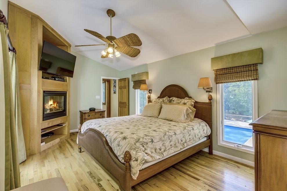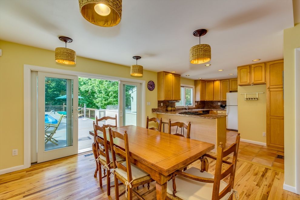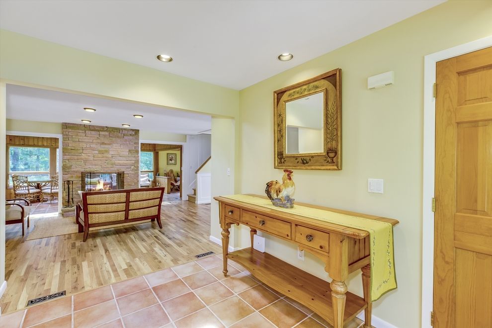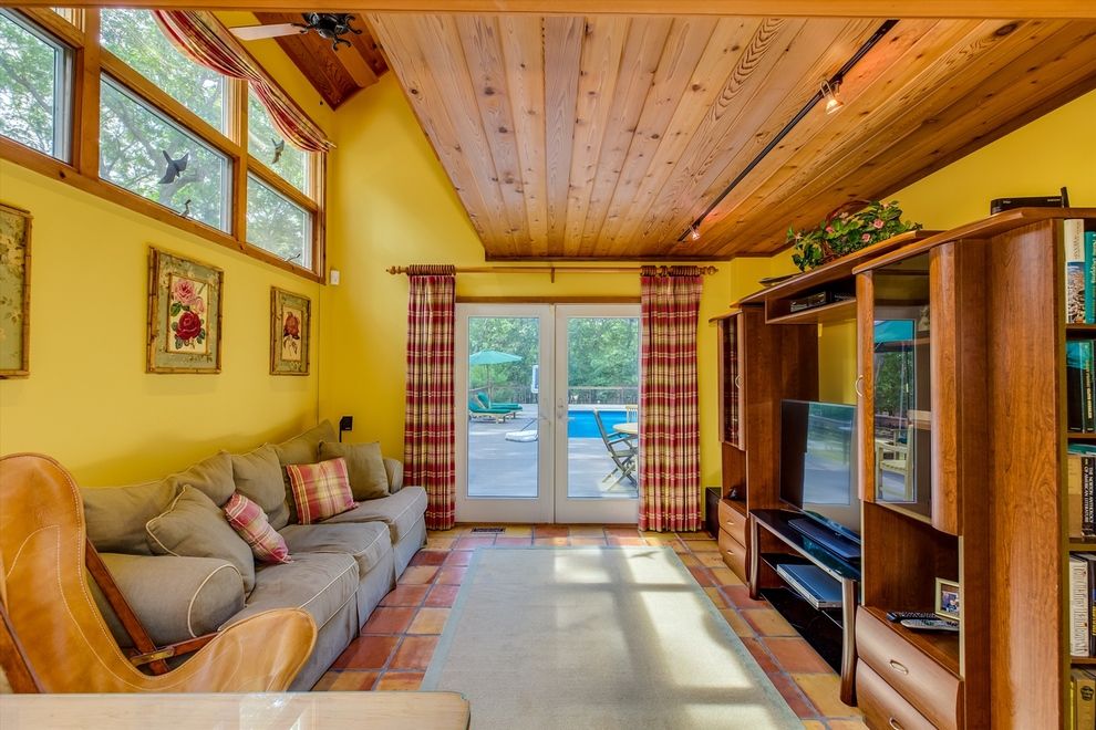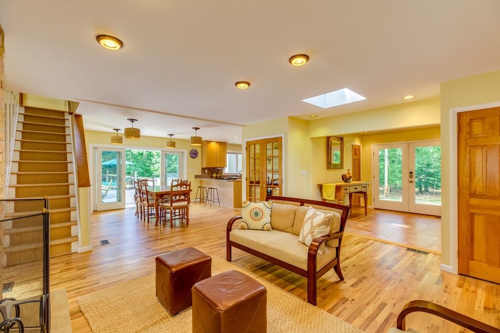 Curb appeal in East Hampton with lots of eye-popping details and everything one needs are found inside this one-of-a kind home at 1 Short Lane, surrounded by 1.9 acres of pristine woods. Gracious living space with a most desirable, open plan provide the perfect escape from a hectic lifestyle. Double-sided fireplace opens into the living room and a bright four-season den that also opens up to the pool area. Dining area and renovated kitchen are