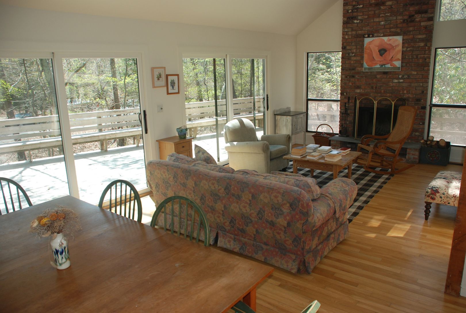 With Three Mile Harbor within view, turn onto a small private street with a cul-de-sac. This wonderful contemporary is lovingly cared for. It is sunny all day long. There is plenty of room for a 20X40 pool, and is surrounded by huge decking, great for gatherings. The master bedroom is on the first floor and overlooks the private wooded half acre acre property.