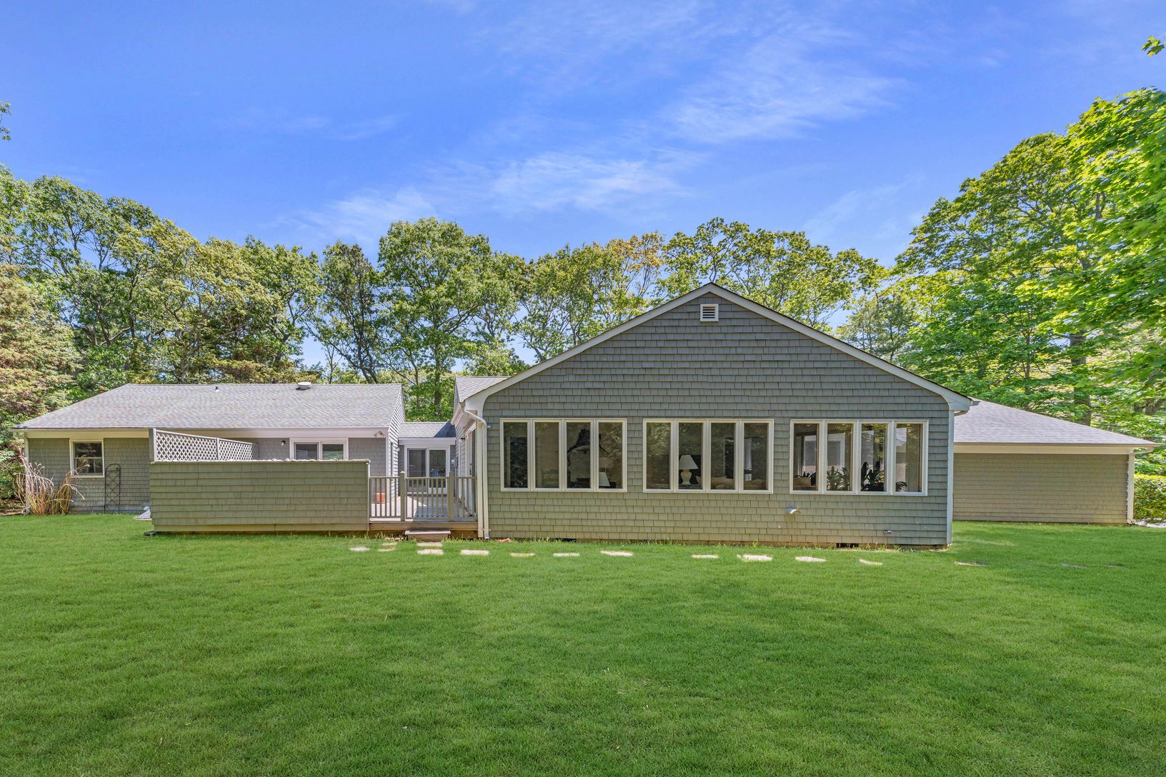 Lovely Quogue Village home offers one-level living at its finest! Light filled kitchen flows seamlessly to open floor plan living/dining room with fireplace and fabulous 4 season sun room with French doors that lead to your private deck. Primary bedroom with en-suite bath and large walk-in closet/dressing room. 3 family bedrooms all with great closet space and 2 additional full baths. Additional office/flex space. Situated on a flat .69 acre