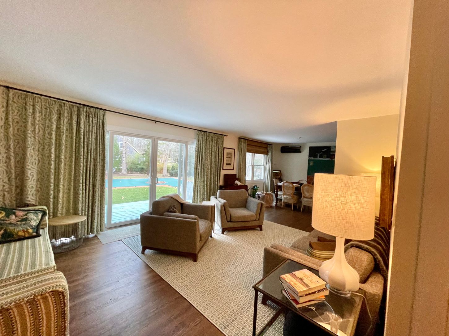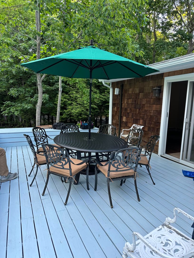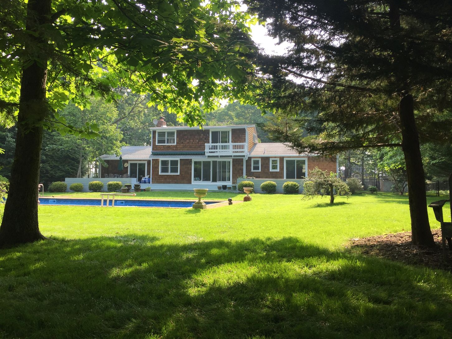 A true summer oasis located minutes from Menhaden Beach. This 4 bedroom 2.5 bath has been recently renovated and refurnished. New windows, doors and floors. New eat-in kitchen with stainless steel appliances, new furniture/linens and new first floor bathroom with large walk-in shower. In addition to the main living room, there is a family room/den with fireplace, and a billiard room in the basement. The resurfaced tennis court, large fenc