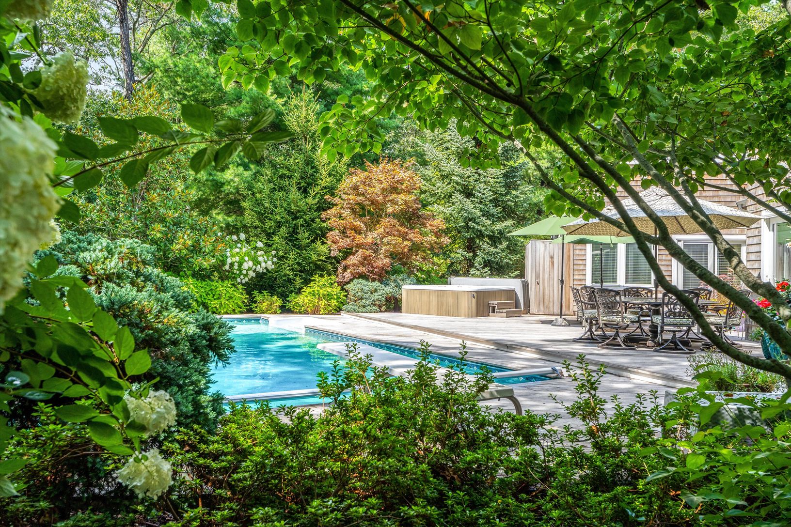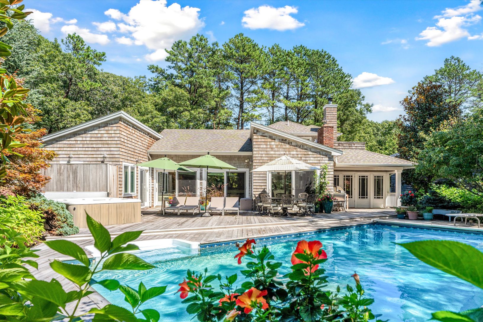 Situated on a secluded cul-de-sac in the village of Quogue, this 4 BR/3 BA Contemporary with pool and spa offers both privacy and proximity to everything Quogue has to offer. All the rooms on the main floor have soaring ceilings, including the sunny living room, enormous dining room, and spacious media room with built-in surround sound. The brand-new kitchen has an attached den with fireplace, as well as an adjacent three-season screened-in po