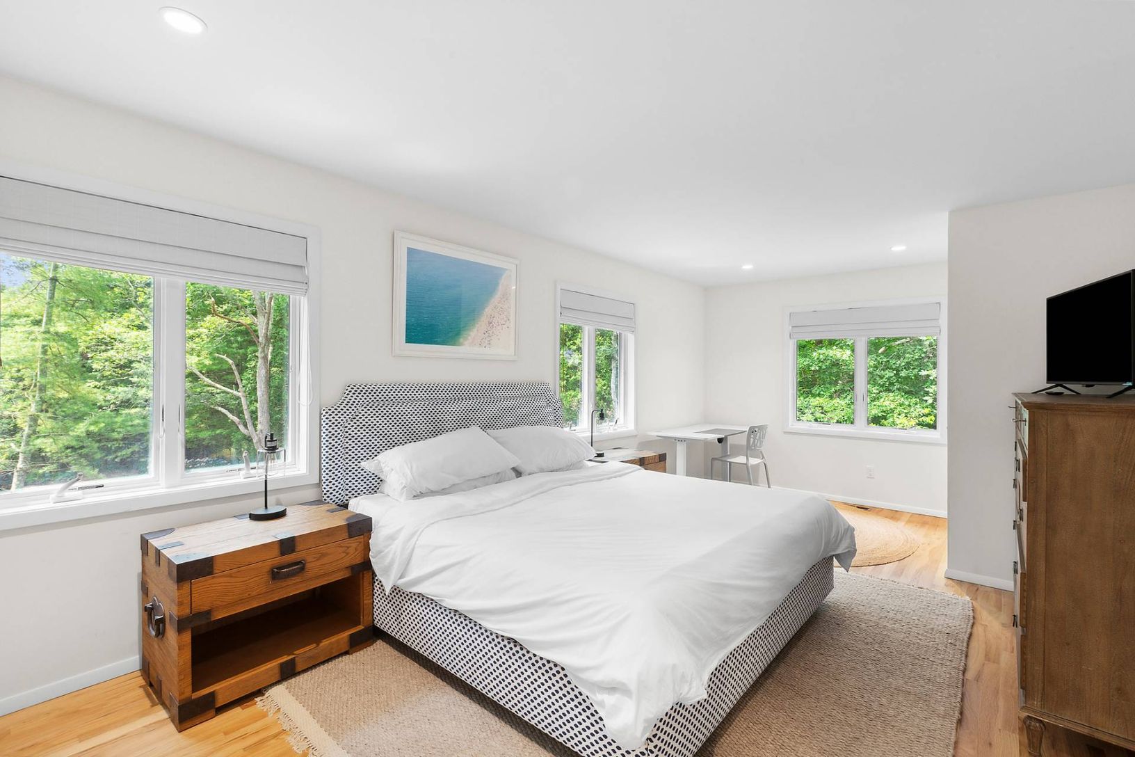 Located south of the highway on a quiet cul-de-sac in East Hampton Village is a recently renovated mid-century modern home. The 5 bedroom / 5 bathroom property is fully fenced and gated, and sits on a nearly 1-acre lot. The large ipe deck overlooks the fully fenced heated, gunite pool and hot tub that is surrounded by hydrangeas. Additional features include a beautiful and welcoming garden, high ceilings, large windows with sliding doors to bo