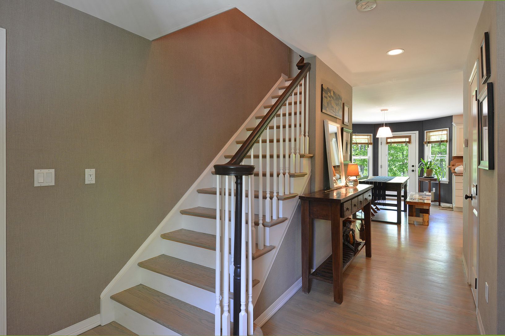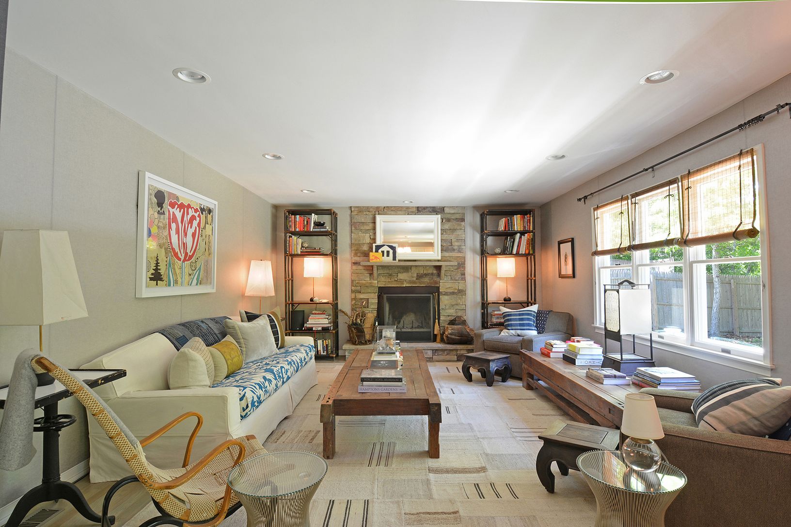 Large, open rooms with high ceilings, exquisite details including a chef's range, oil rubbed bronze hardware, luxurious casually elegant wall coverings and a fabulous flow for an easy yet graceful lifestyle. Entrance hall to open plan living room, with flagston