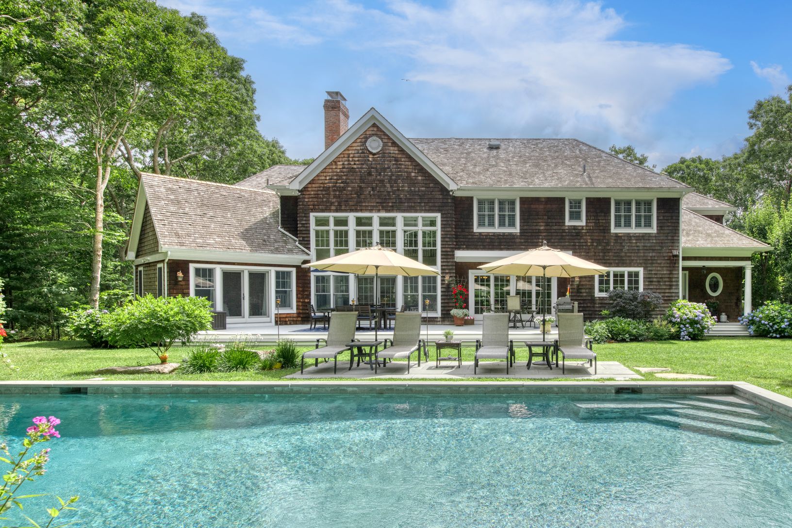 Minutes to East Hampton Village, ocean beaches and restaurants located at 10 Dering Lane, East Hampton. This classic traditional home offers five ensuite bedrooms, with a masters on both floors. There is large eat in kitchen, soaring two story living room with fireplace and formal dining room for family summer fun. Completing the home is a beautiful private 2 acre property with a heated gunite pool, large deck and perennial gardens. Attached 2