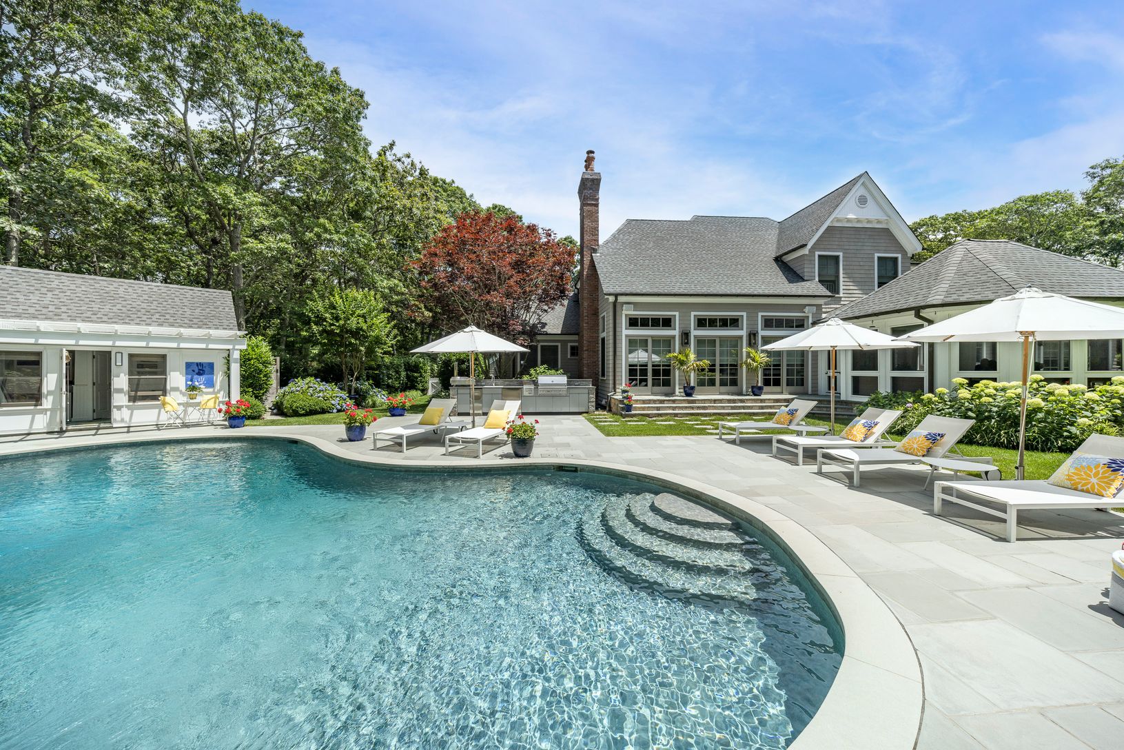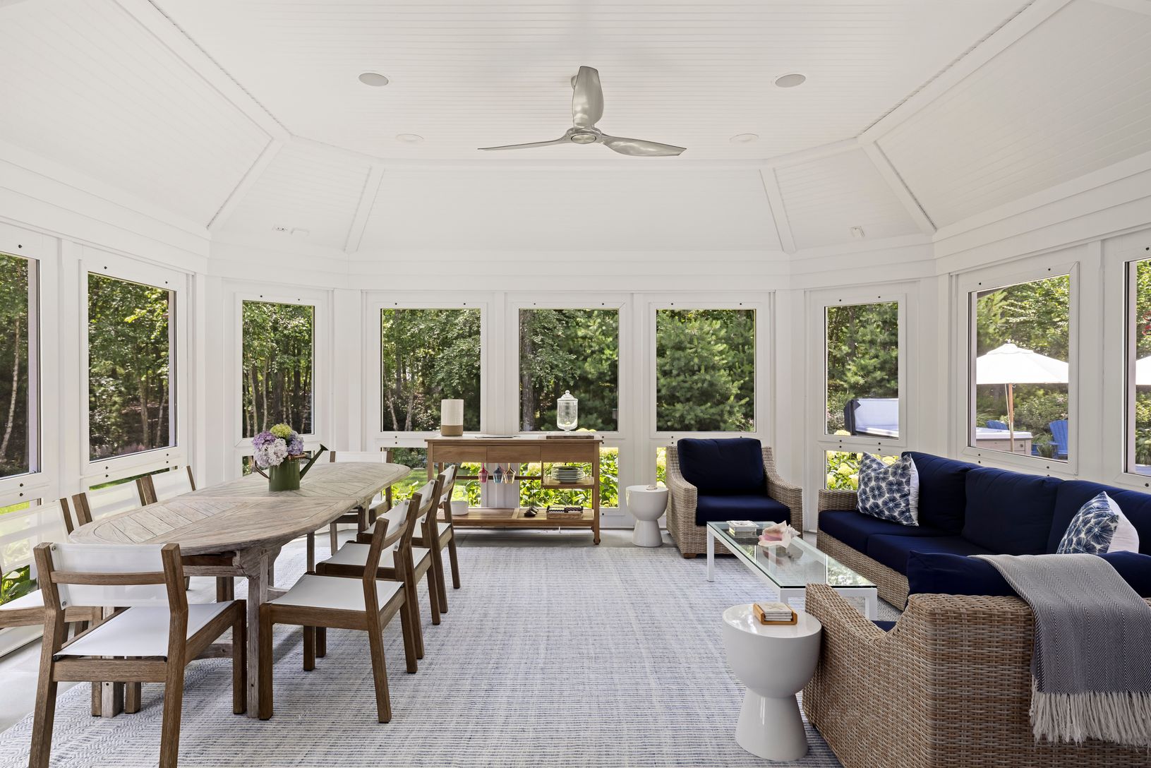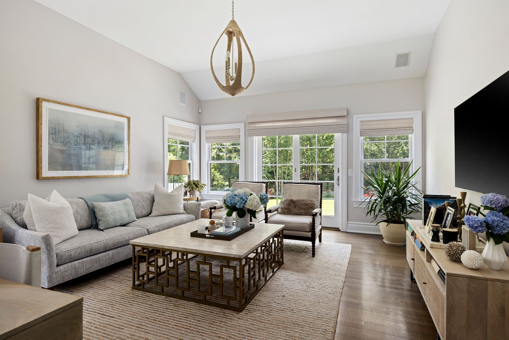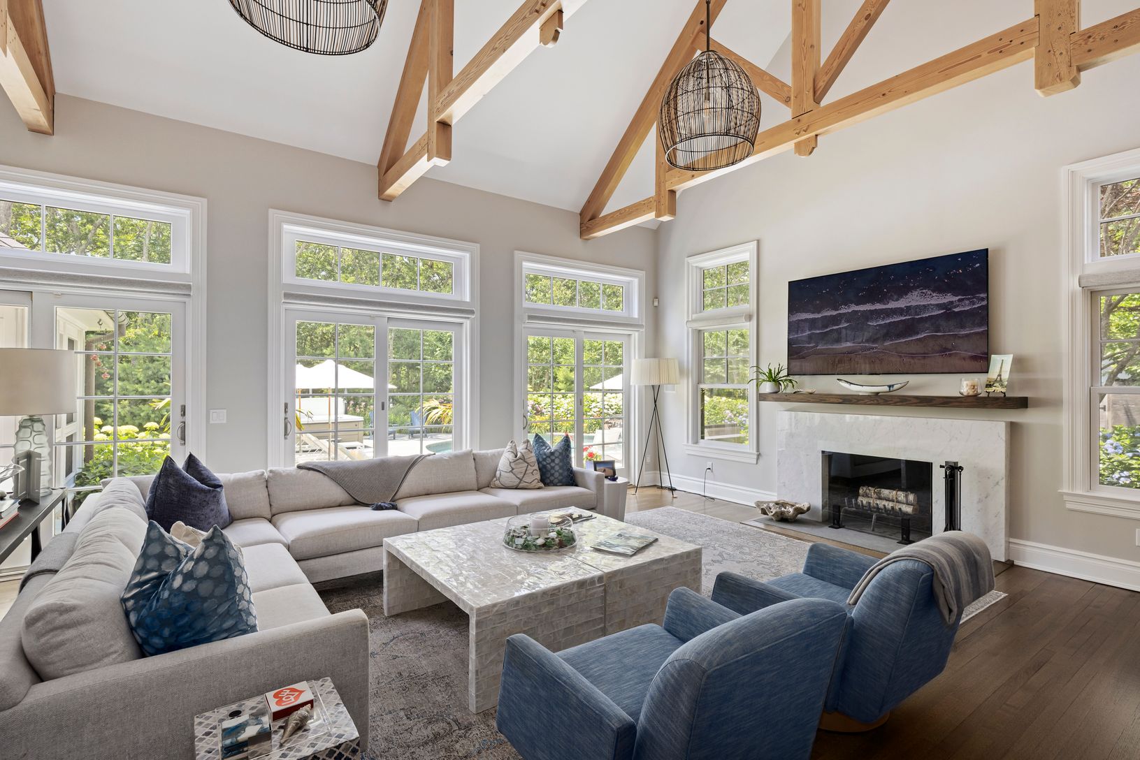 Nestled in the serene landscapes of Amagansett, this exquisitely renovated custom home offers approximately 5000 +/- sq ft of luxurious space, harmoniously blending comfort and elegance. Upon entering, you are greeted by an expansive great room, where soaring ceilings create an airy atmosphere and a stunning wall of glass sliders bathes the space in natural light. A cozy wood-burning fireplace adds a touch of warmth and intimacy, perfect for g