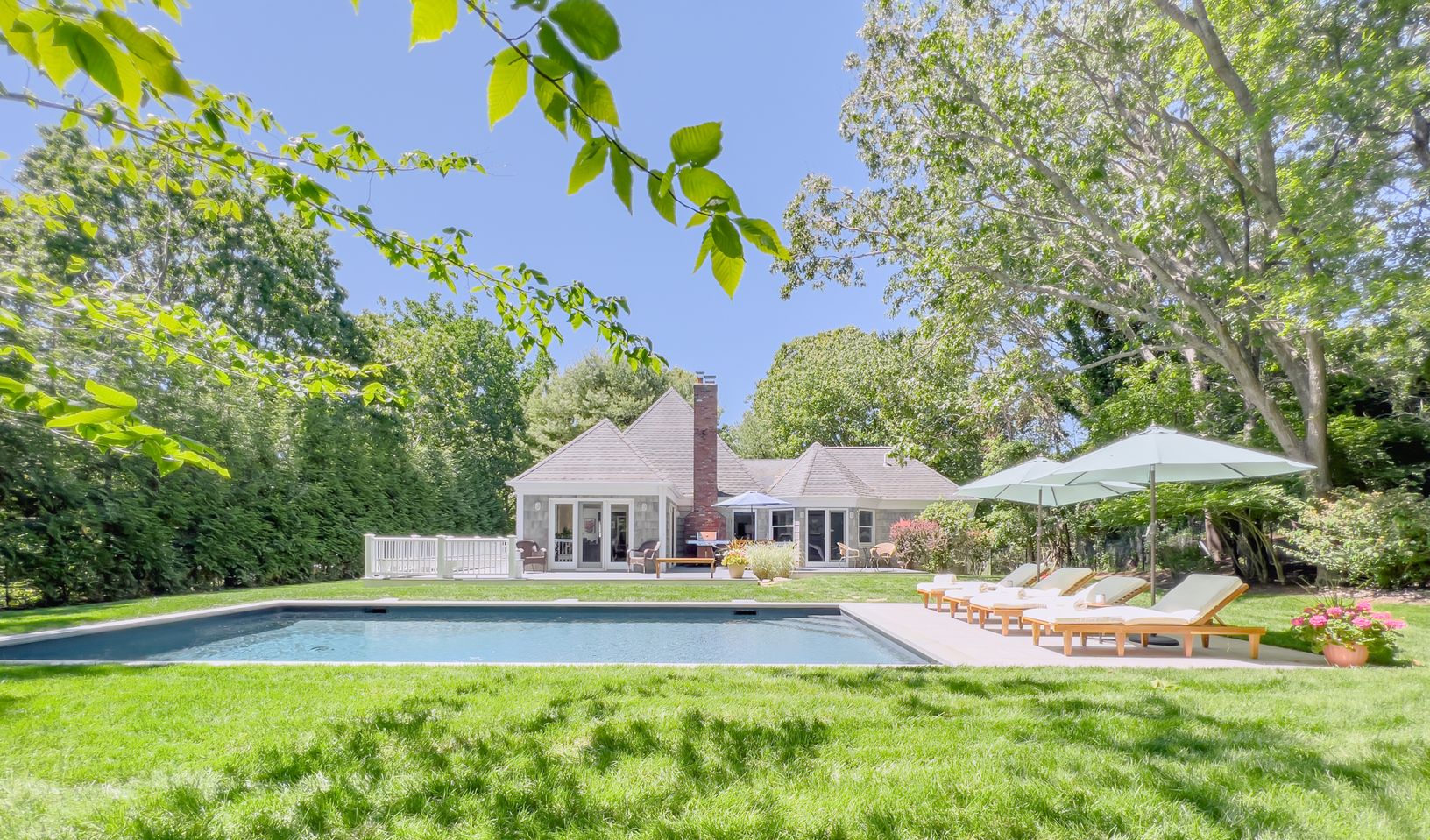 2022 fully renovated one-level Southampton Smart House! Be the first to spend your Summer in this stunning new rental listing. This house features three bedrooms -an en-suite primary bedroom (King) with Jacuzzi and two additional guest bedrooms ( one queen and 2 twins or a full) with a shared bath, open living room with cathedral ceiling, Hisense 120" 4K smart Laser TV and fireplace, dining room with