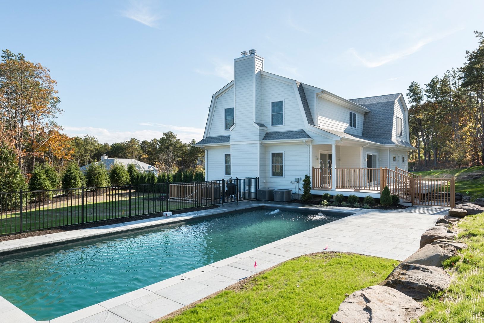 Privately nestled on a landscaped shy acre at the end of a cul-de-sac, this brand new four bedroom, four bath postmodern in Quiogue Woods offers an open 2,800+/- sq. ft. floor plan with vaulted ceilings, modern kitchen, hardwood floors, large master suite, finished basement with large recreation room and bath. In-ground pool and only 2.5 miles to the ocean in Westhampton Beach.