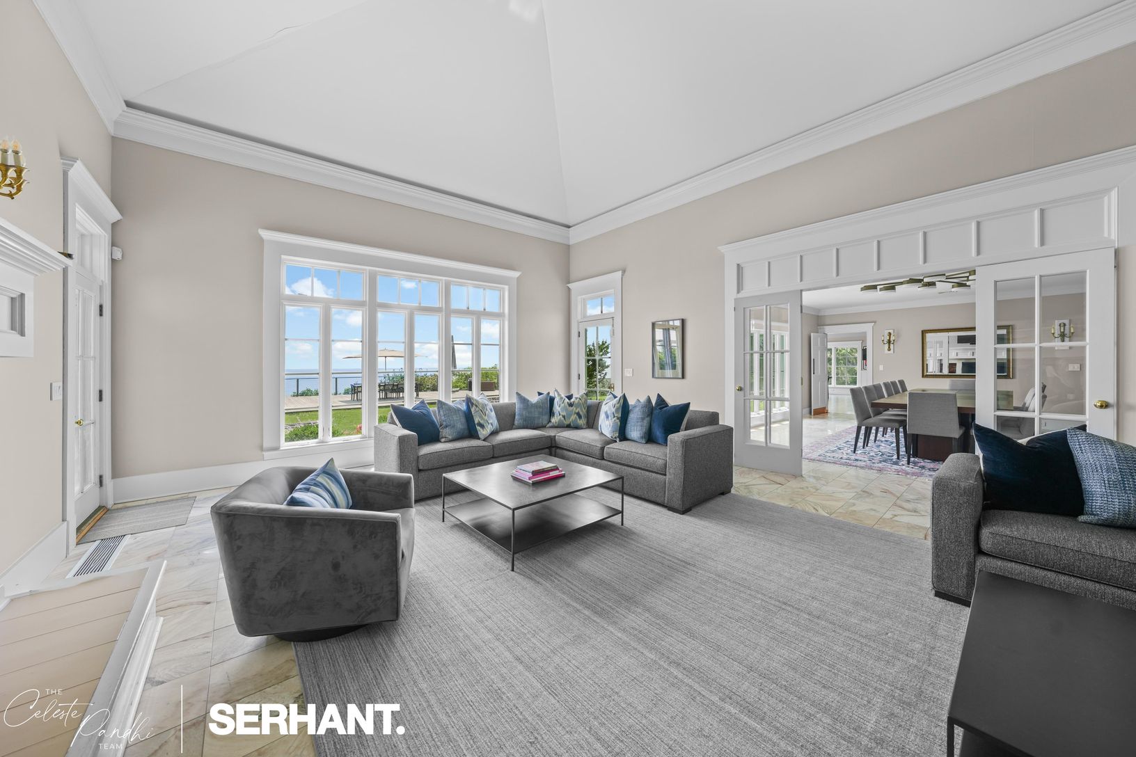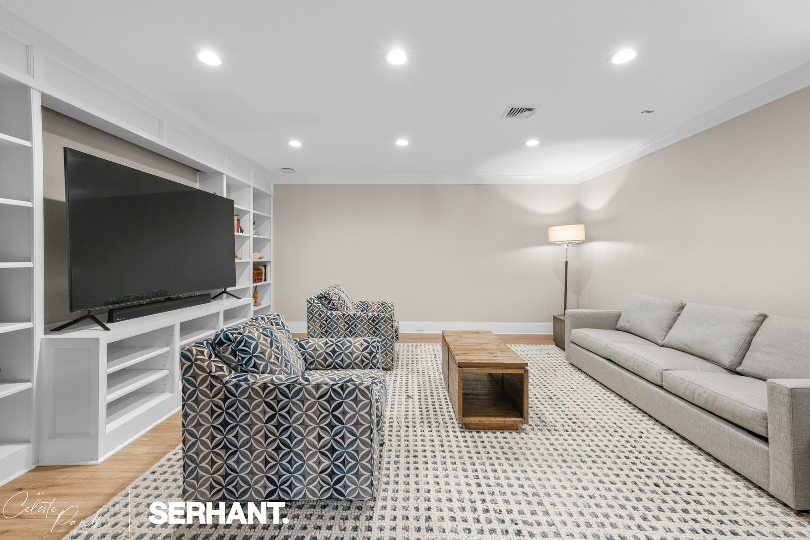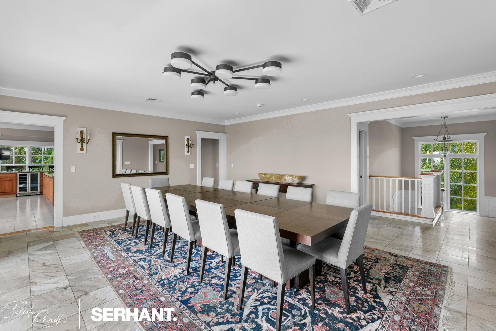 The ground level welcomes with a gracious foyer, media lounge, game room, gym, and three bedrooms — including a bunk room ideal for guests — along with