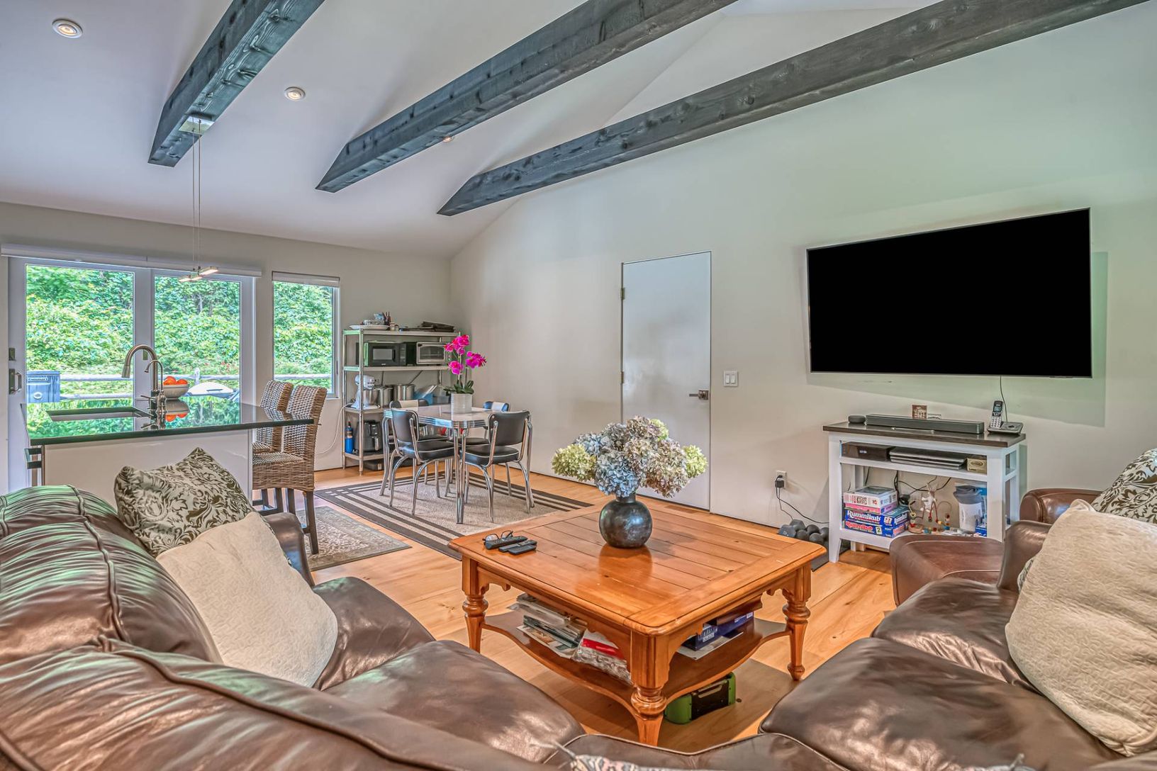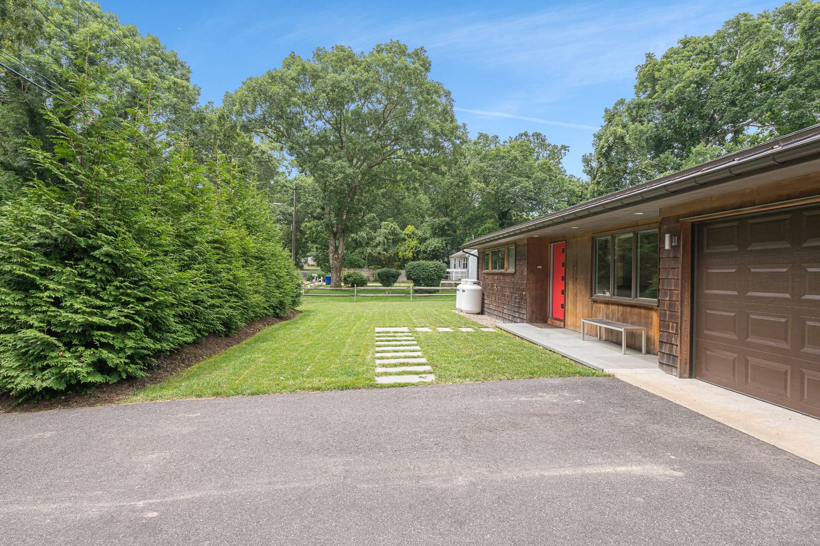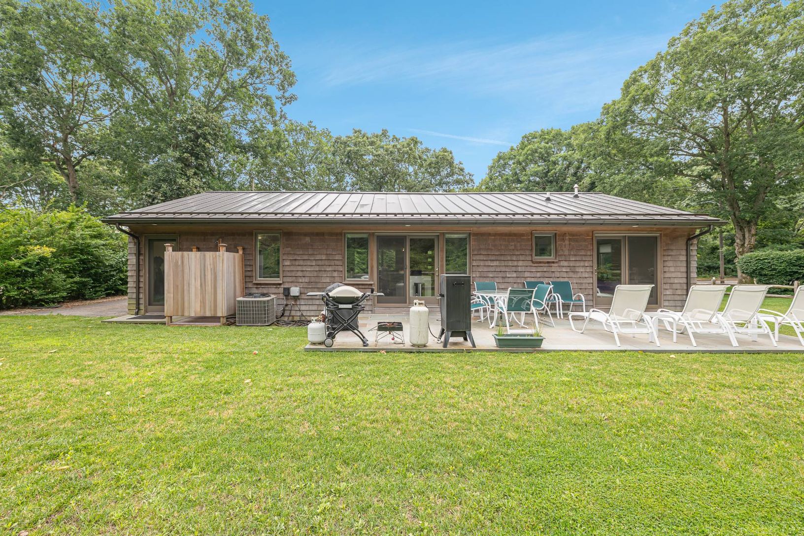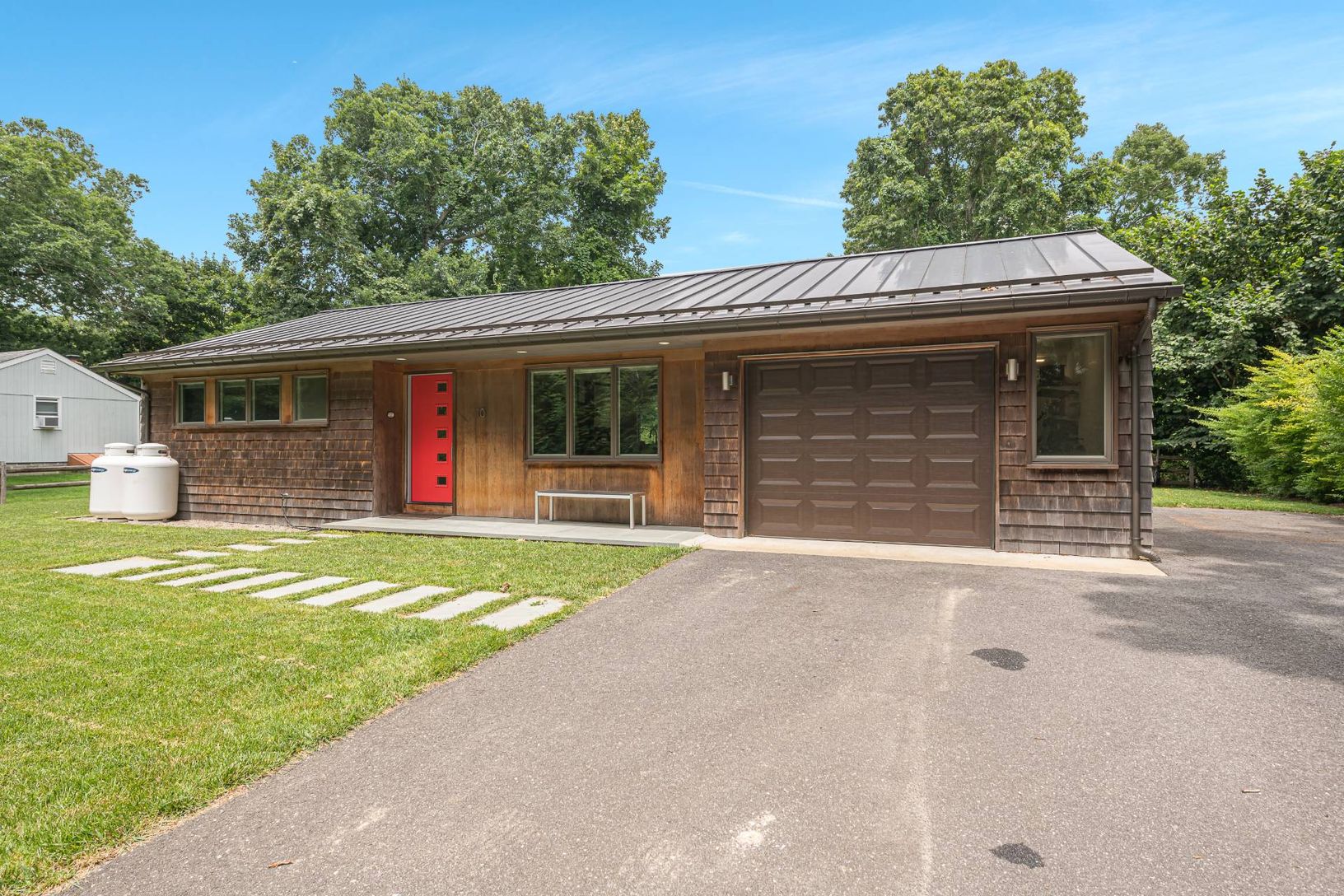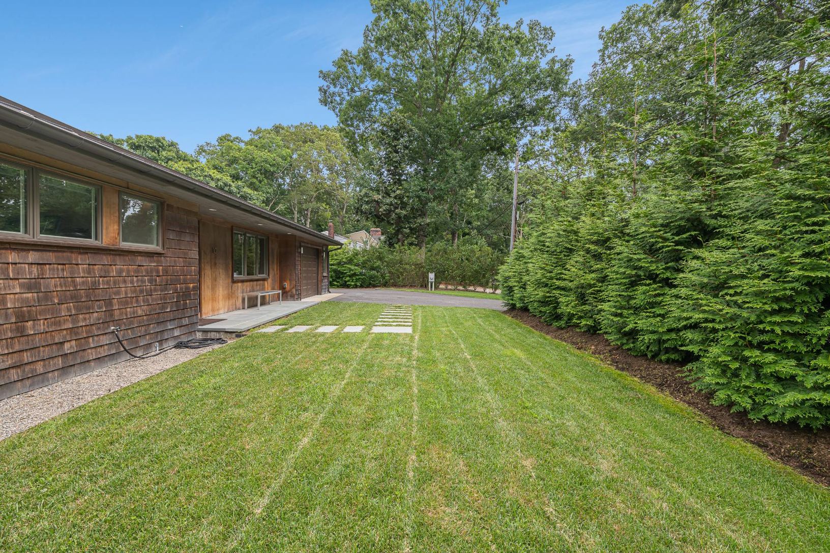 This lovely two bedroom, two bath home is a stone's throw from East Hampton Village and enjoyed a gut renovation inside and out in 2018 which included all infrastructure. Open living areas with wide pine floors include open living room, dining & kitchen with island seating, granite countertops and vaulted ceiling; glass doors open to a rear stone patio. A primary suite includes a radiant-heated bath with shower and modern pedestal vanity.