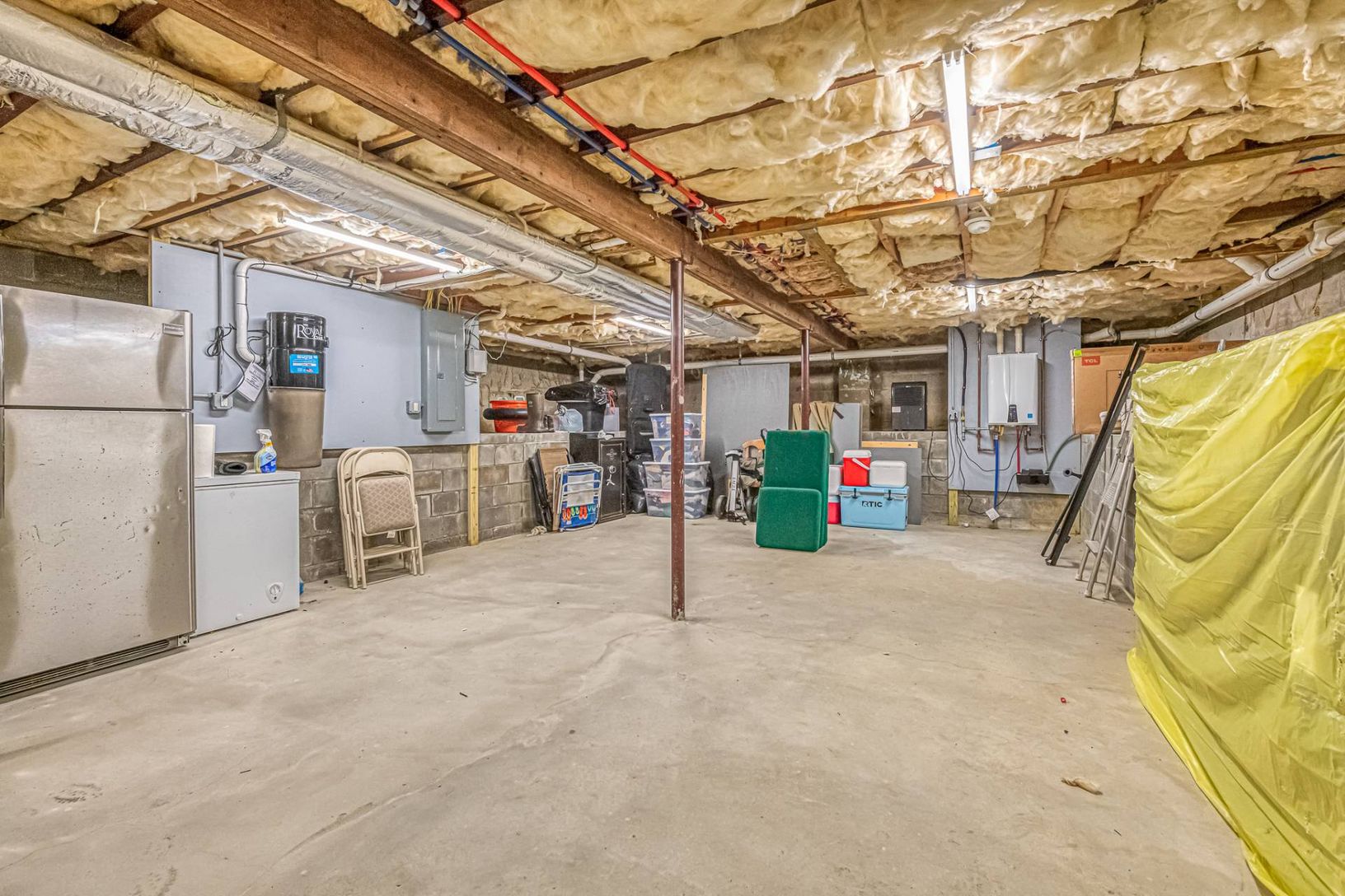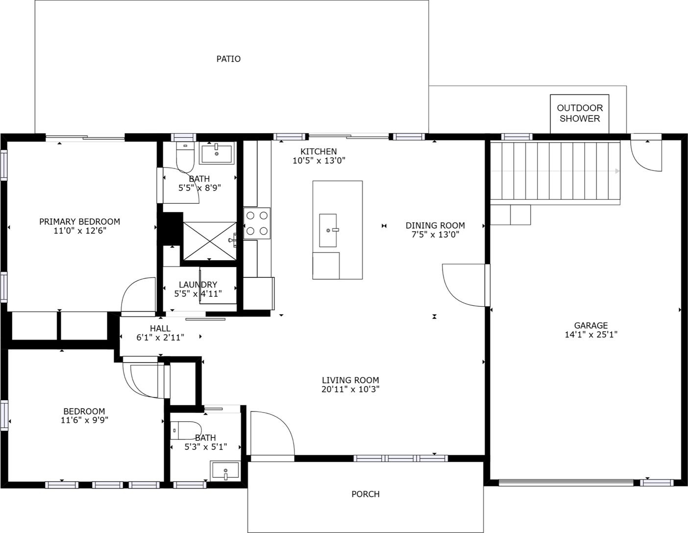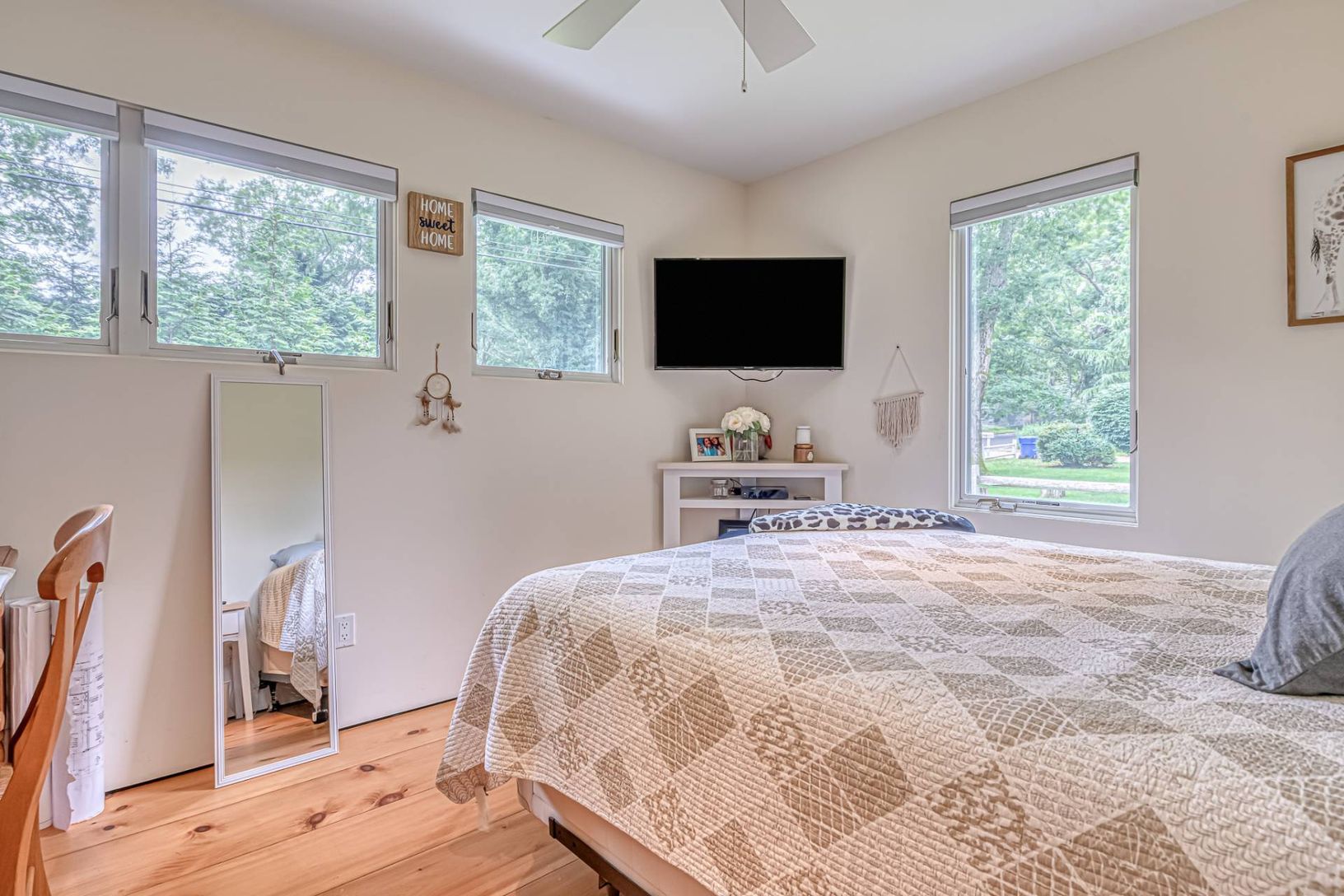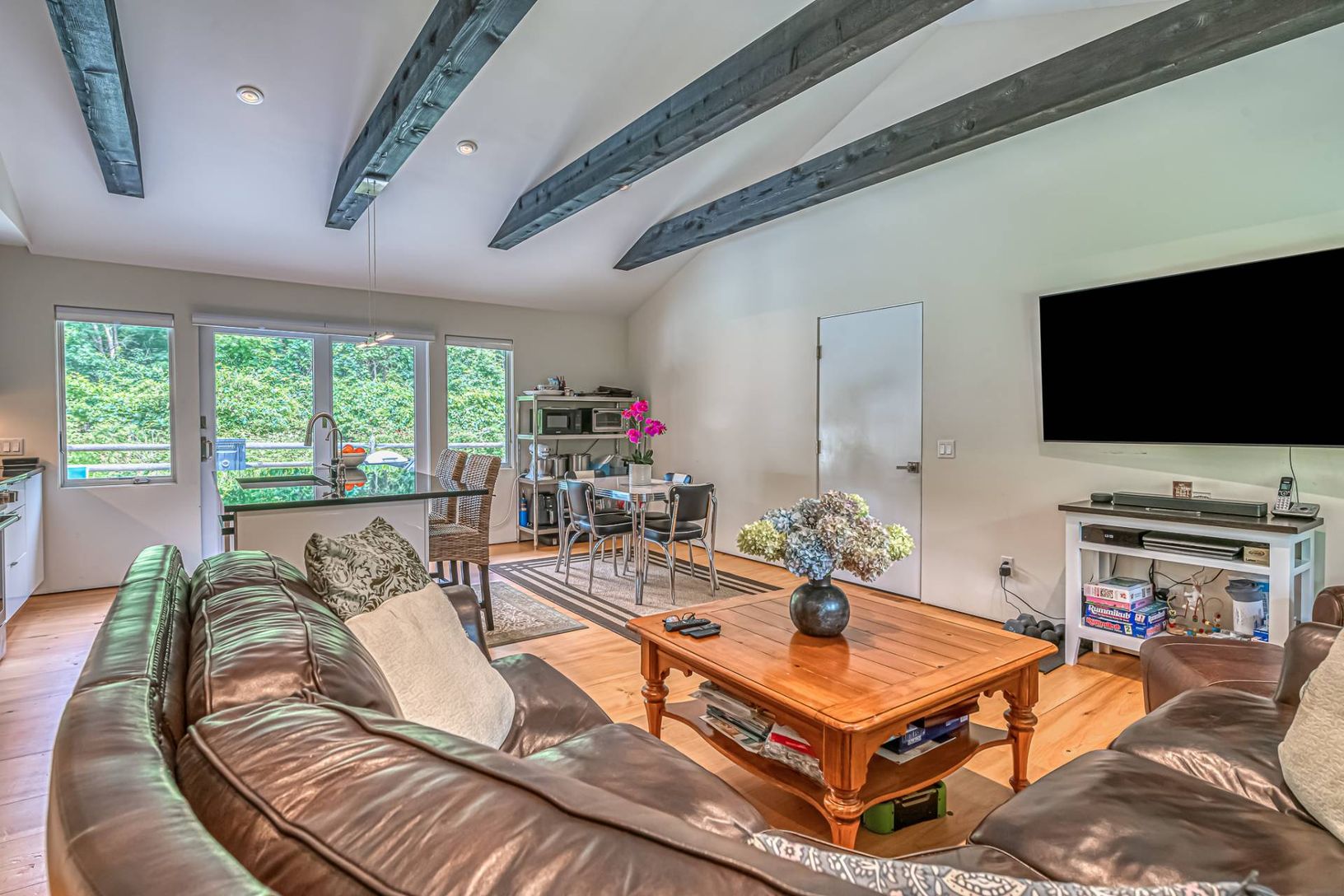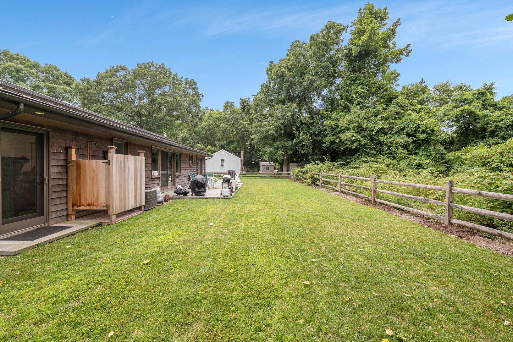 This lovely two bedroom, two bath home is a stone's throw from East Hampton Village and enjoyed a gut renovation inside and out in 2018 which included all infrastructure. Open living areas with wide pine floors include open living room, dining & kitchen with island seating, granite countertops and vaulted ceiling; glass doors open to a rear stone patio. A primary suite includes a radiant-heated bath with shower and modern pedestal vanity.