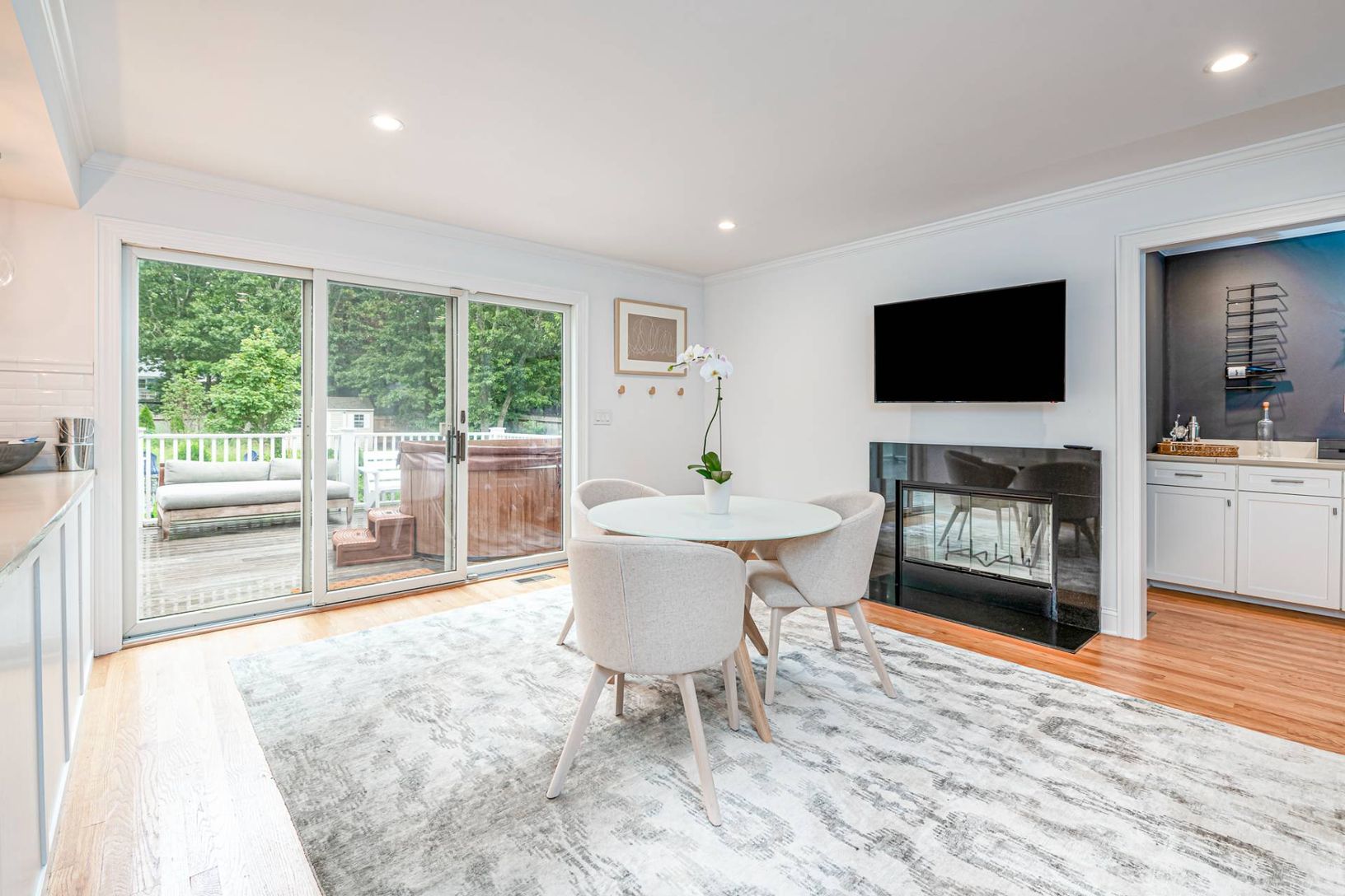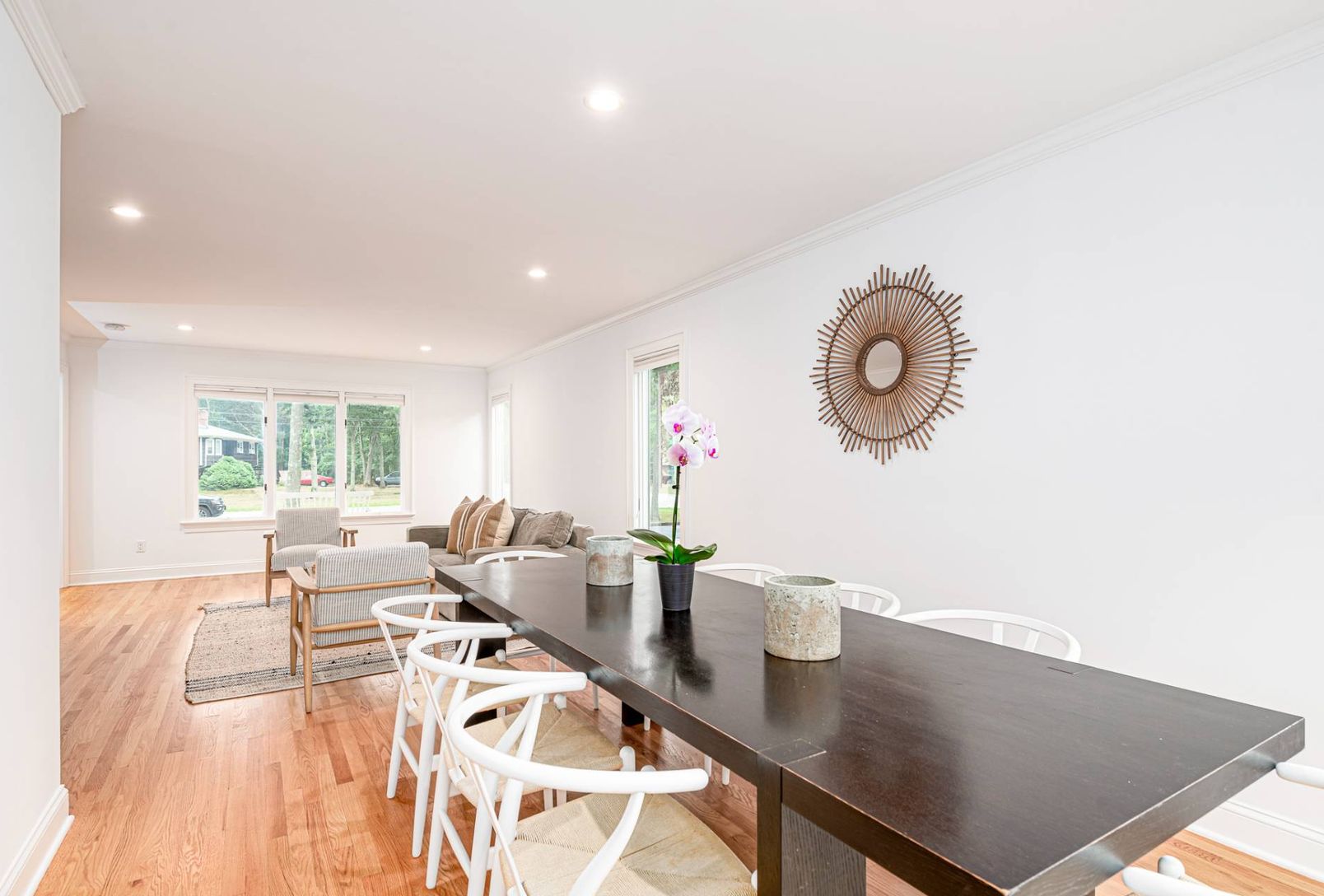 This stunning home is nestled in a tranquil setting in East Quogue and has been recently renovated with modern touches. Set on a generous 1/2 acre lot, the home boasts cedar shake siding and a charming cobblestone-edged circular driveway, creating a welcoming curb appeal. Inside, the home has been thoughtfully expanded into a full 4 bedroom, 3 full and 1 half bath residence. The entry foyer leads to abundant closets and a spacious living room