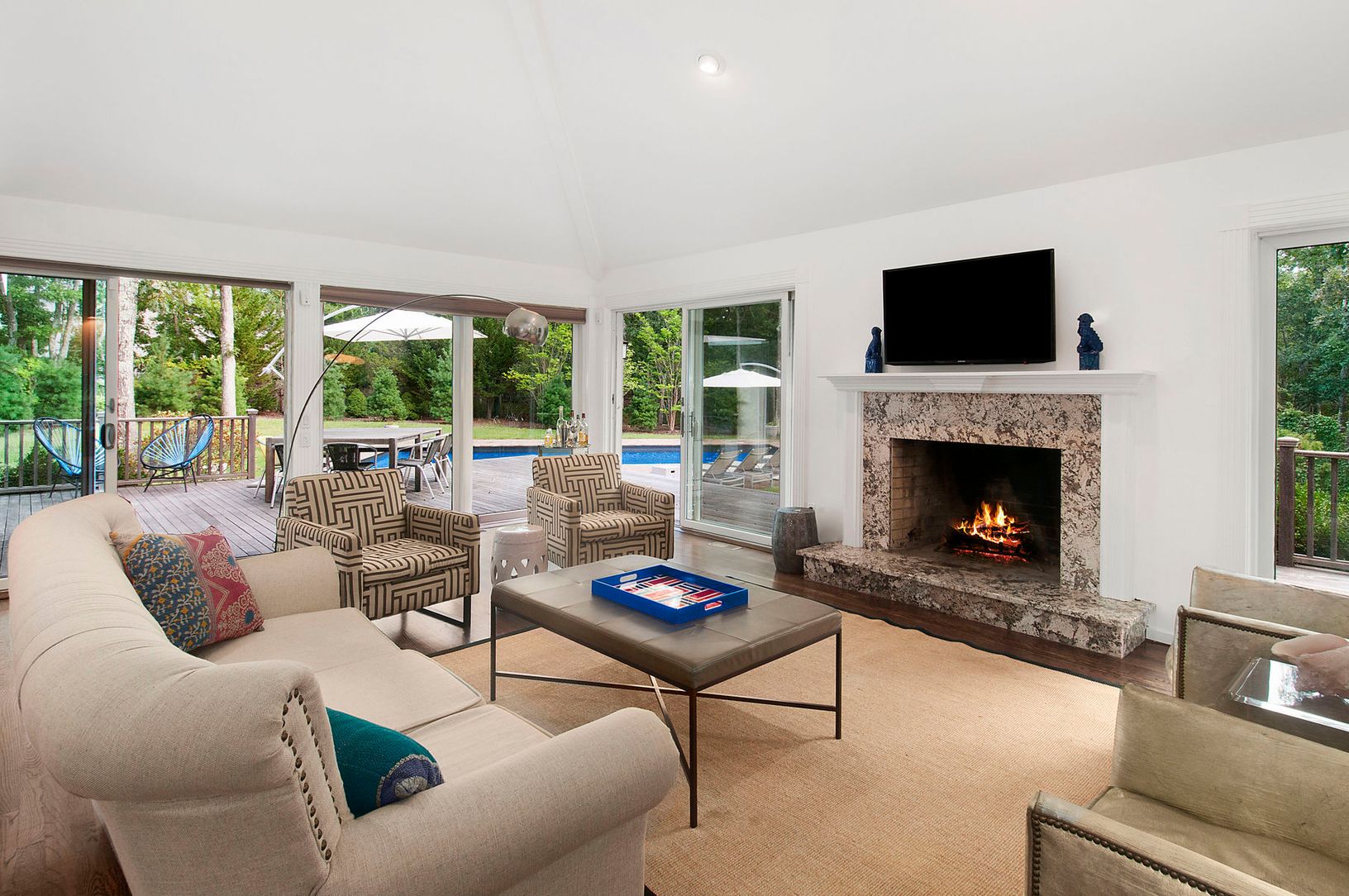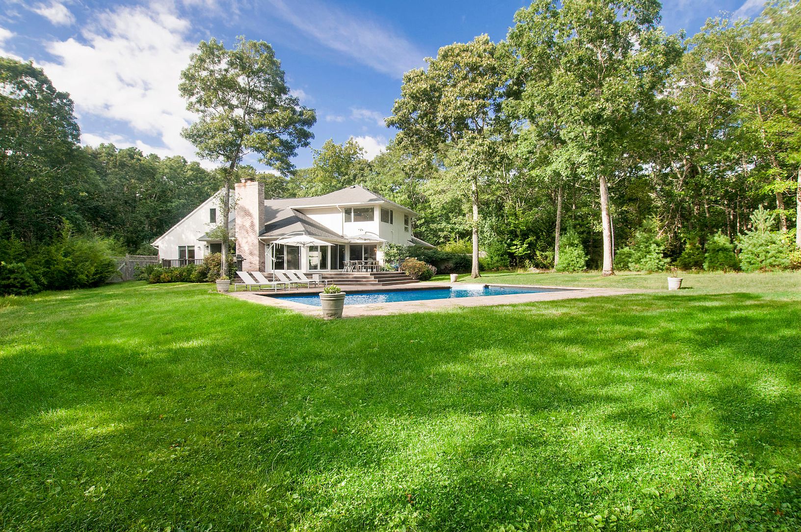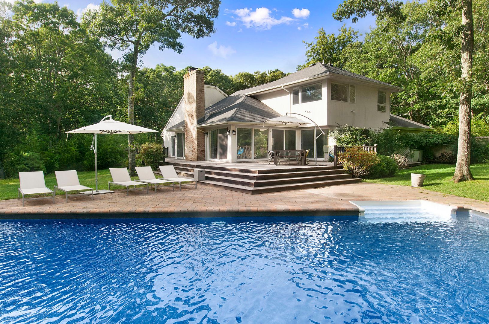 This bright, airy contemporary home has 4 bedrooms, 4 baths, heated pool, and is full or privacy, situated on 1.39 acres in the Hands Creek Farm section of East Hampton. Dining and living rooms flow effortlessly onto the large deck and pool area making this the perfect spot for entertaining and good times. The gourmet kitchen is beautifully designed with xxx countertops and all high end stainless steel appliances including extras such as a 6 b