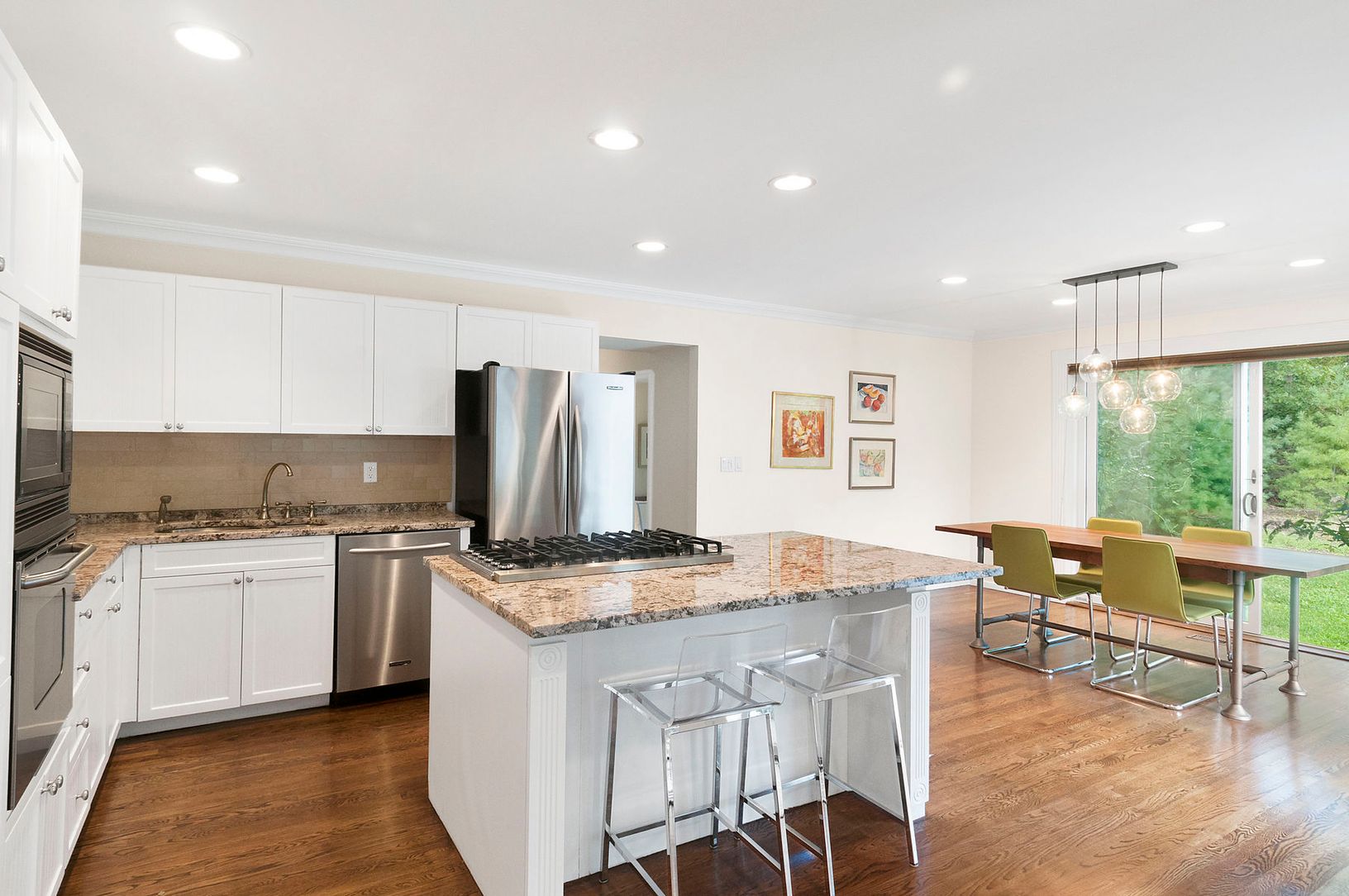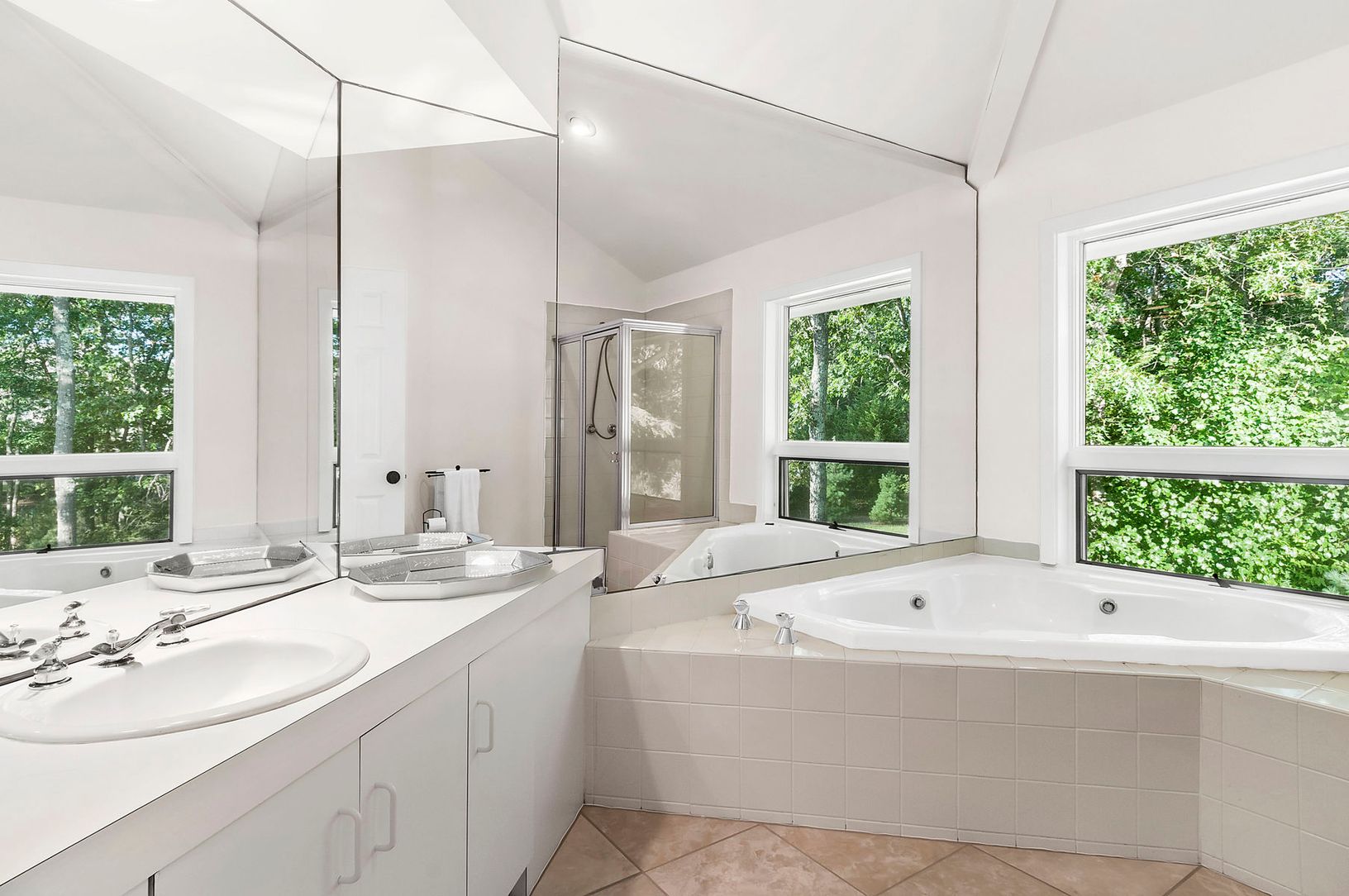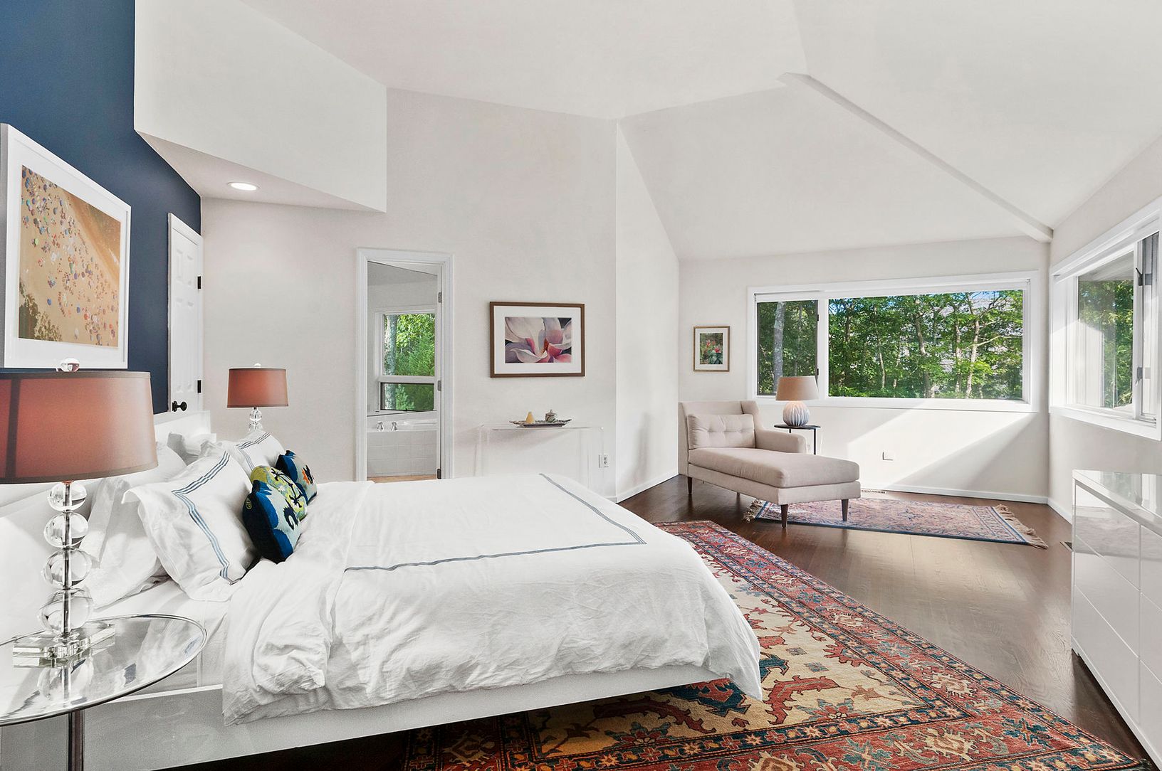 This bright, airy contemporary home has 4 bedrooms, 4 baths, heated pool, and is full or privacy, situated on 1.39 acres in the Hands Creek Farm section of East Hampton. Dining and living rooms flow effortlessly onto the large deck and pool area making this the perfect spot for entertaining and good times. The gourmet kitchen is beautifully designed with xxx countertops and all high end stainless steel appliances including extras such as a 6 b