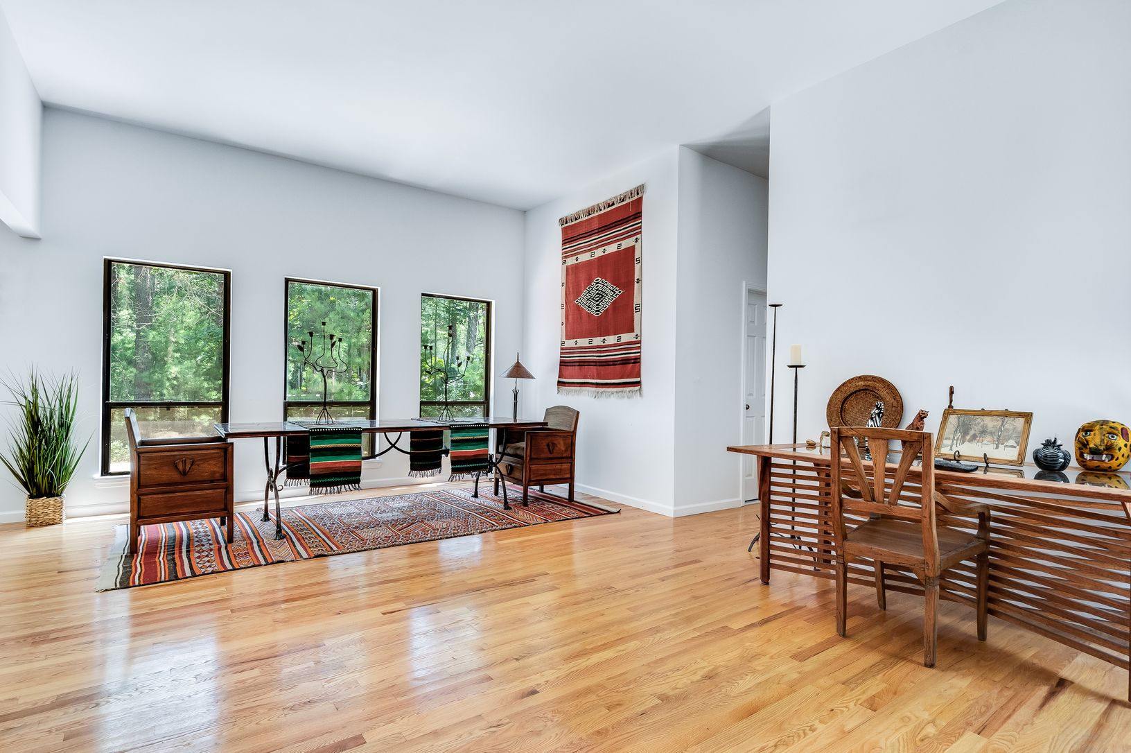 This one level contemporary on a pin-drop quiet cul-de-sac in the Northwest Woods section of East Hampton sits on a lushly treed .92 acre lot. All the rooms have extra high ceilings and 3/4 length floor-to-ceiling windows which allow amazing light to flow into the house at all times of the day. The HUGE living room features a woodburning fireplace and windows galore. The kitchen is open and bright with stainless steel appliances and easy acces