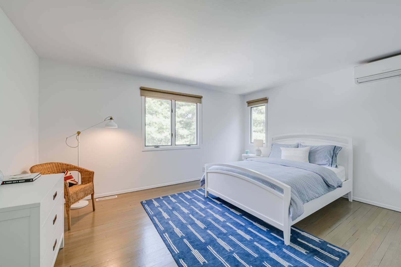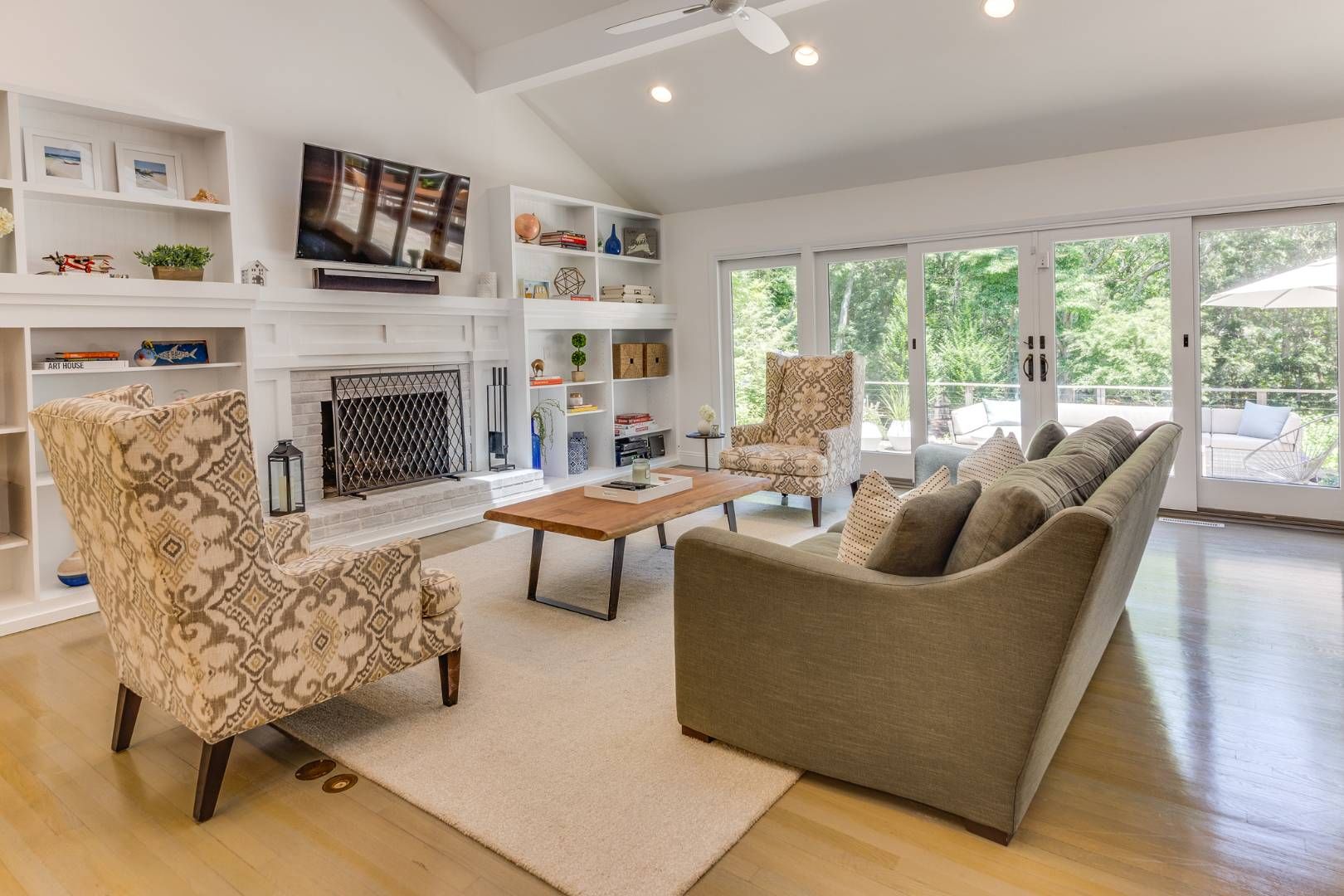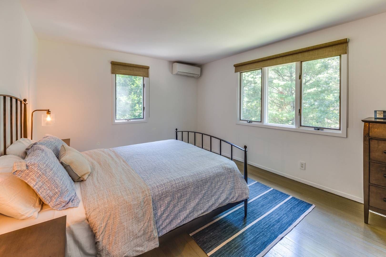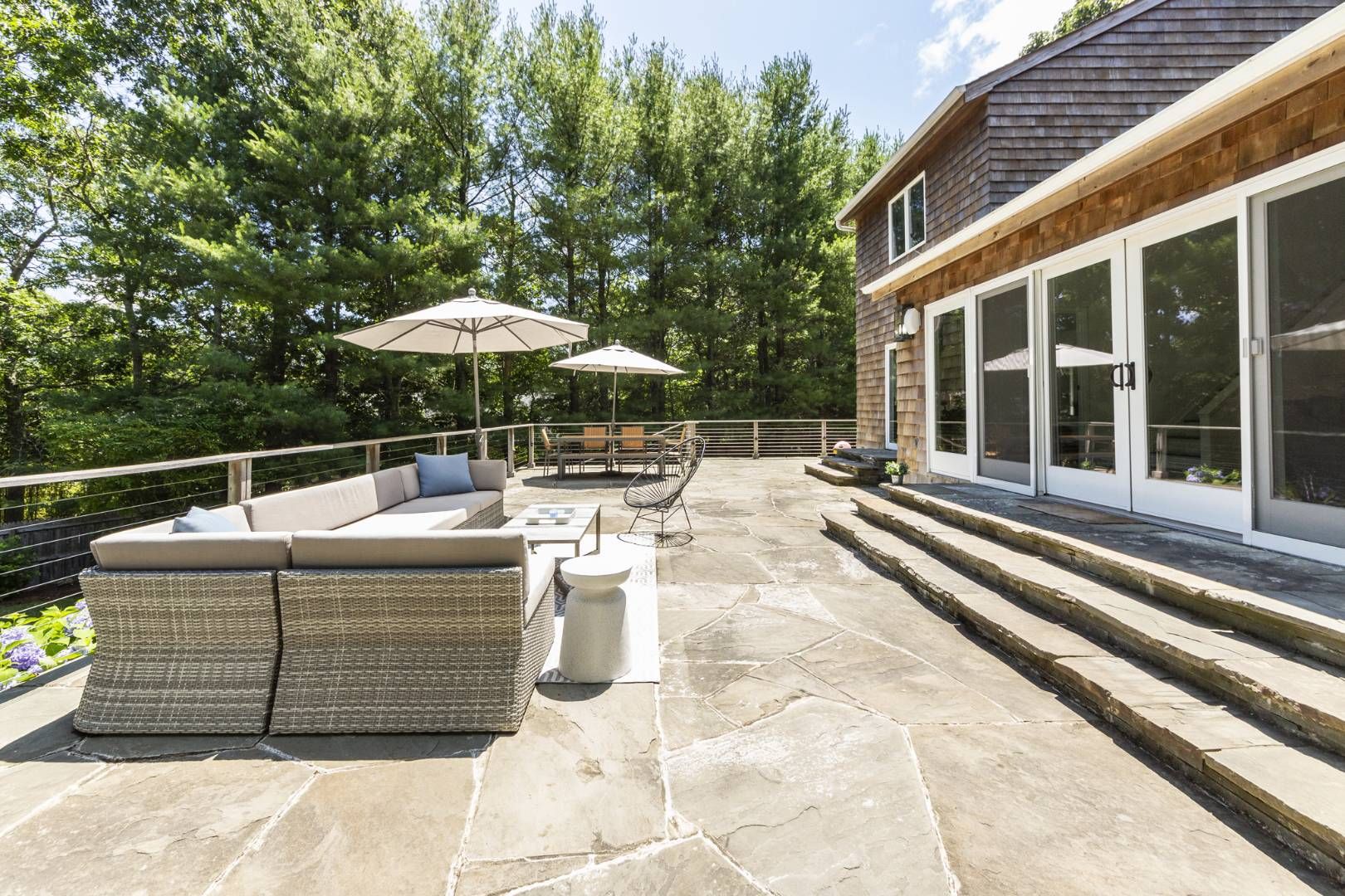 Set back on over a half an acre of property within the desirable Hands Creek Harbor enclave of East Hampton's Northwest Woods, this stunning Modern Saltbox brings new meaning to year-round living on the East End. Invigorated with neutral tones throughout, the focal point of the house is its light-filled great room, with a white brick wood-burning fireplace surrounded by open shelving, skylights overhead and a wall of glass that opens out to th