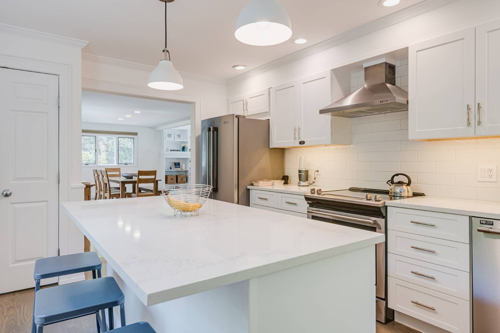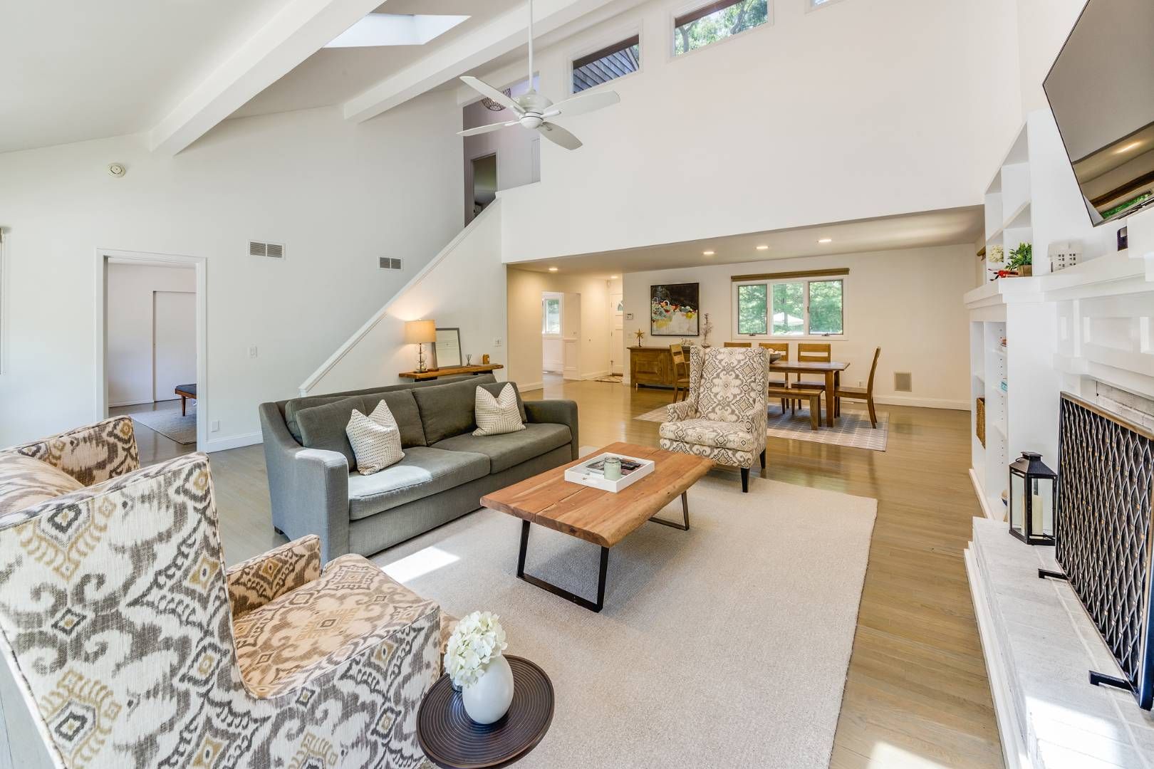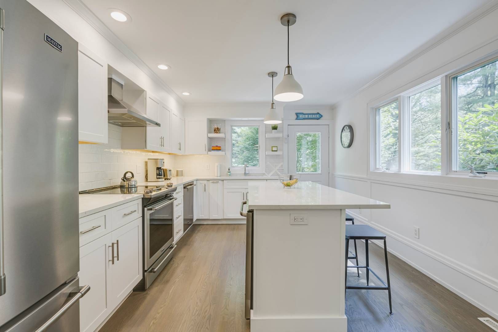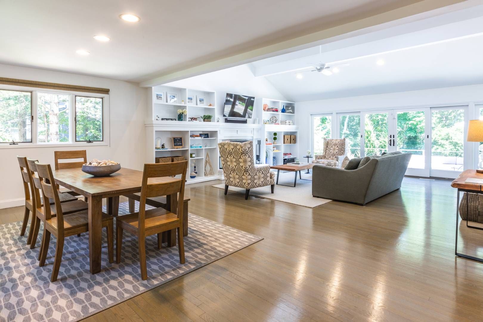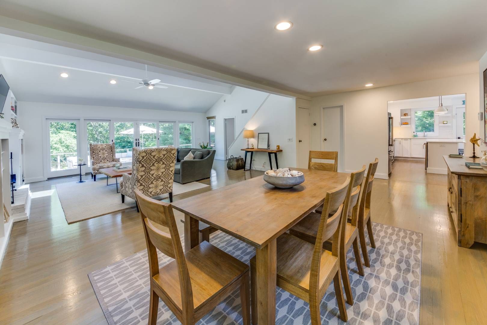 Set back on over a half an acre of property within the desirable Hands Creek Harbor enclave of East Hampton's Northwest Woods, this stunning Modern Saltbox brings new meaning to year-round living on the East End. Invigorated with neutral tones throughout, the focal point of the house is its light-filled great room, with a white brick wood-burning fireplace surrounded by open shelving, skylights overhead and a wall of glass that opens out to th
