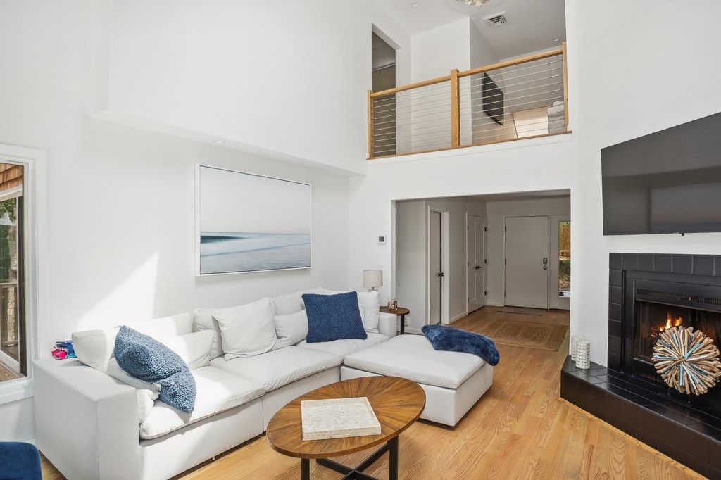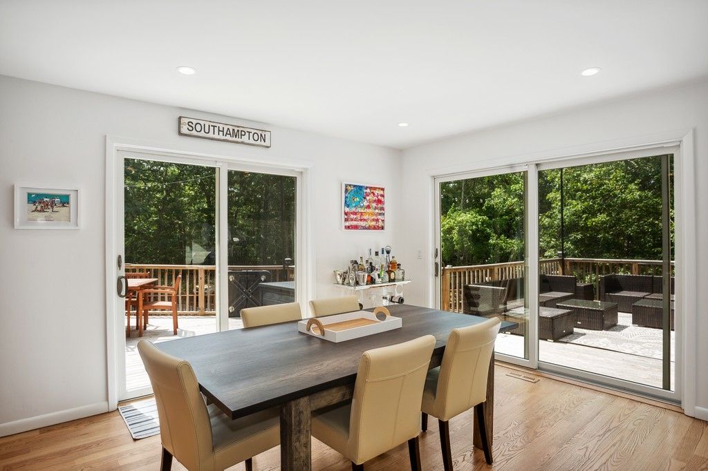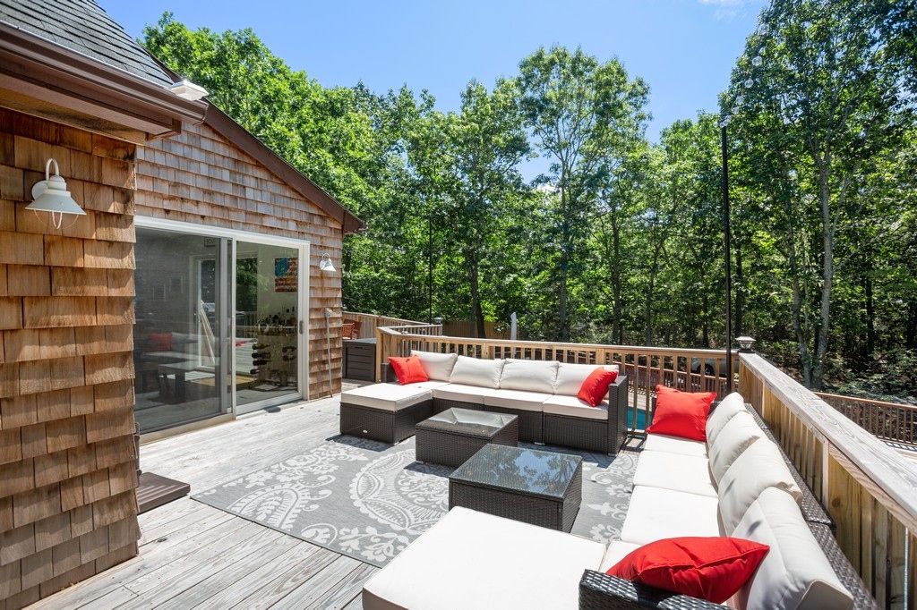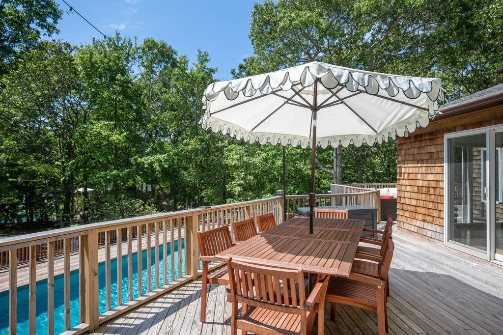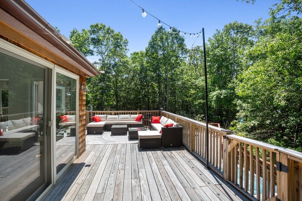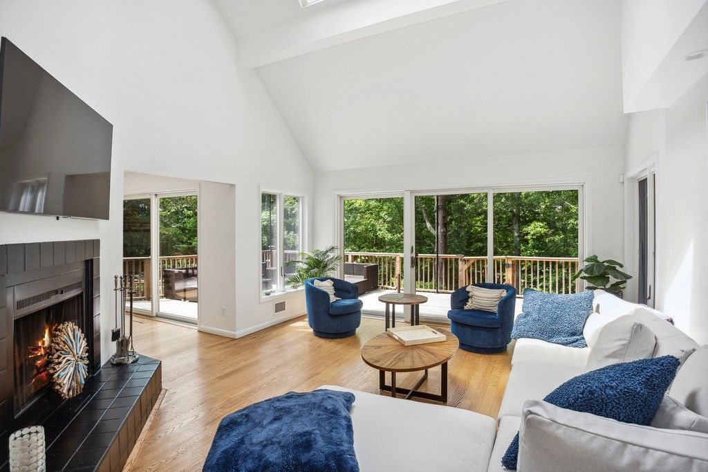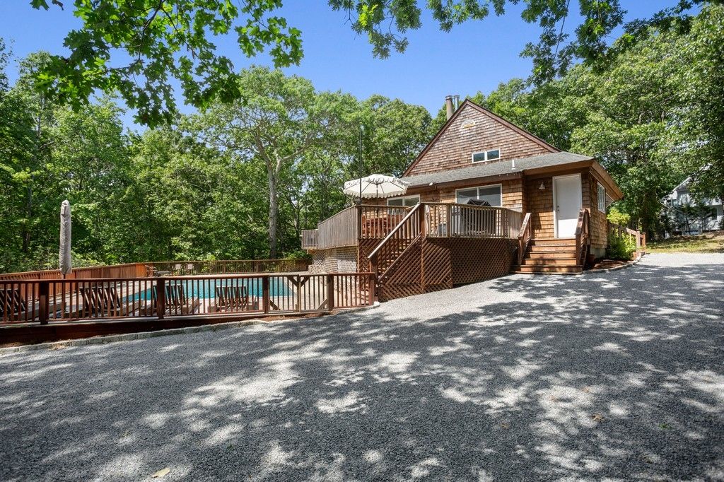 Located in lovely Whalebone Landing Peconic Bayfront Community, with private community beach and tennis, sits this lovely, bright renovated 3 bedroom and 2.5 bath home on 1.07 acres. Tons of outdoor deck space surrounds the updated and heated 18'x36' pool and hot tub. Newly paved driveway with both asphalt and oil and stone. Step into this very bright living room with double height ceiling and skylight. Open flow dining room that leads to the