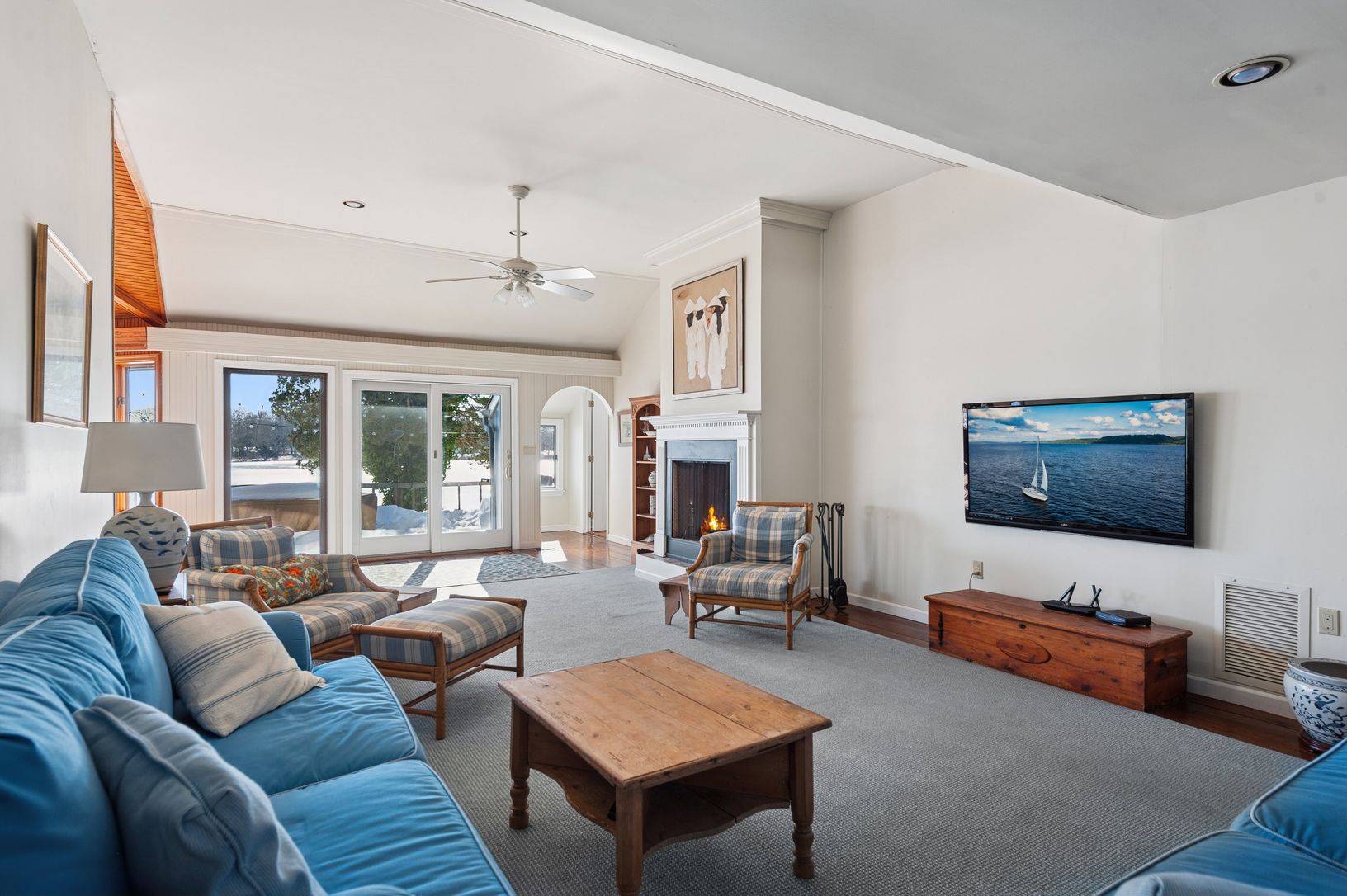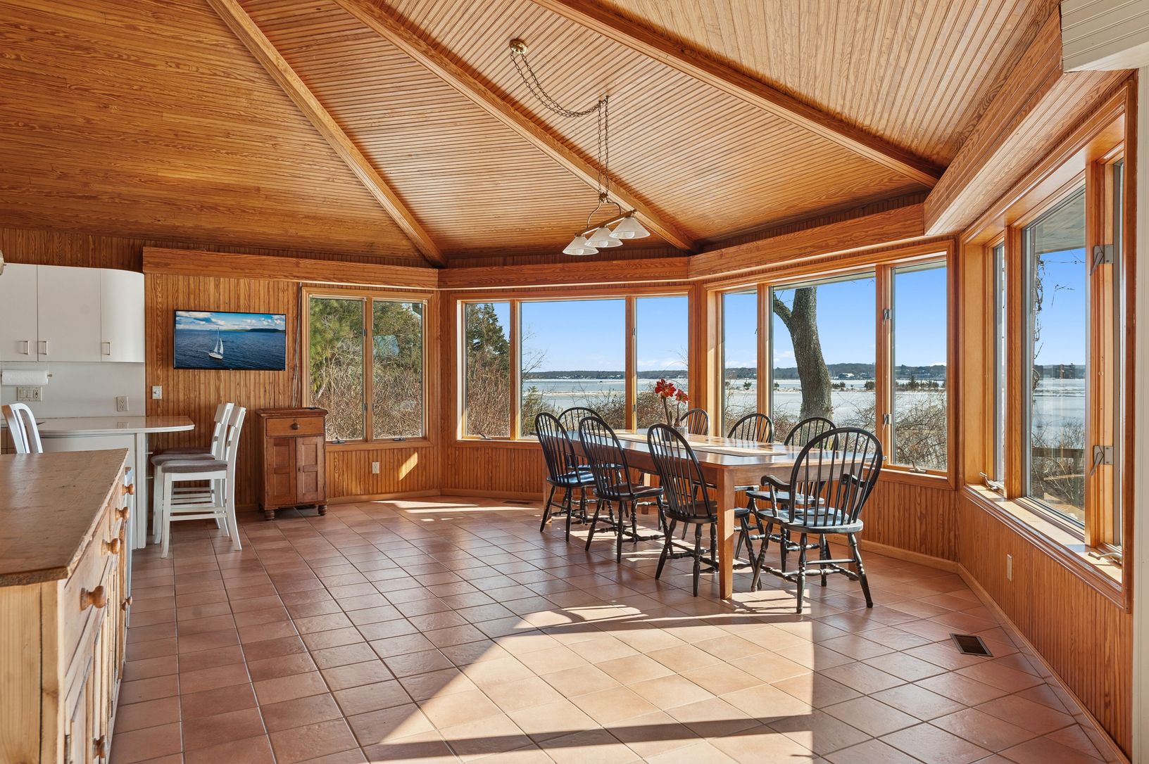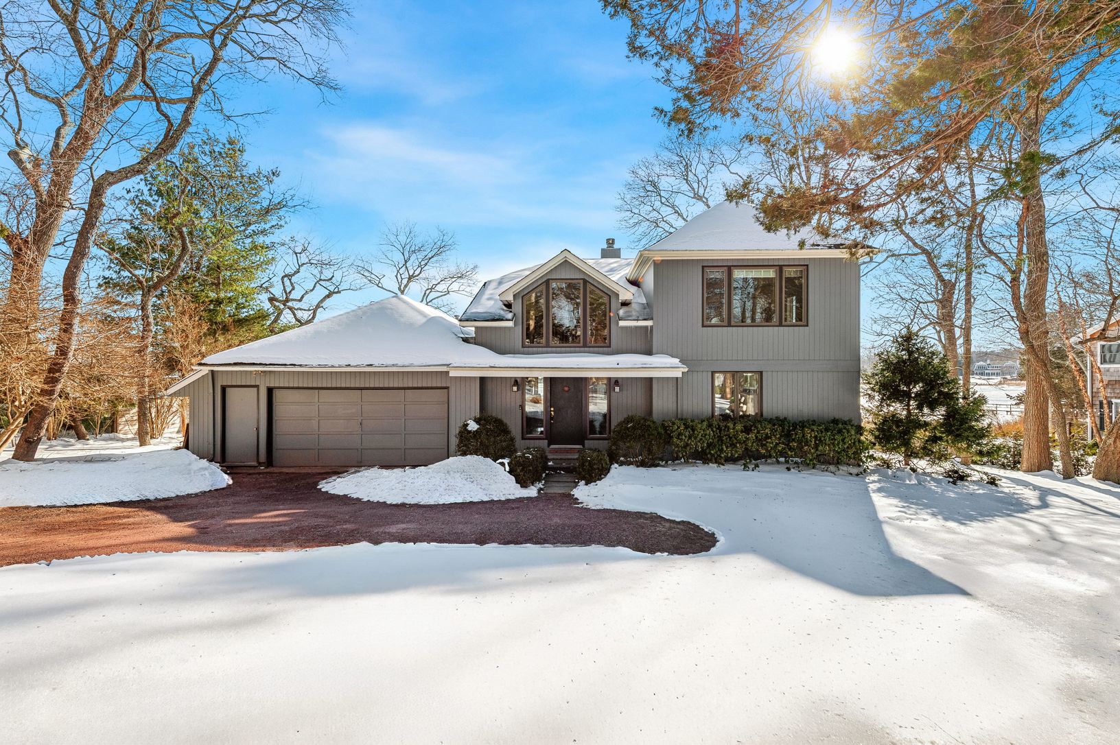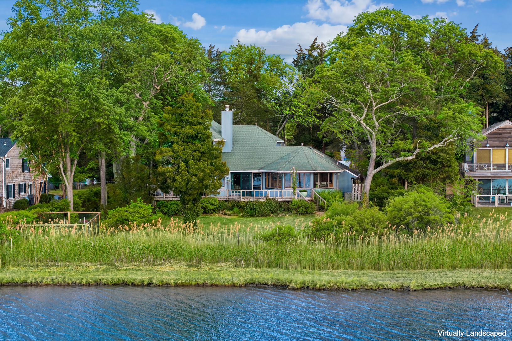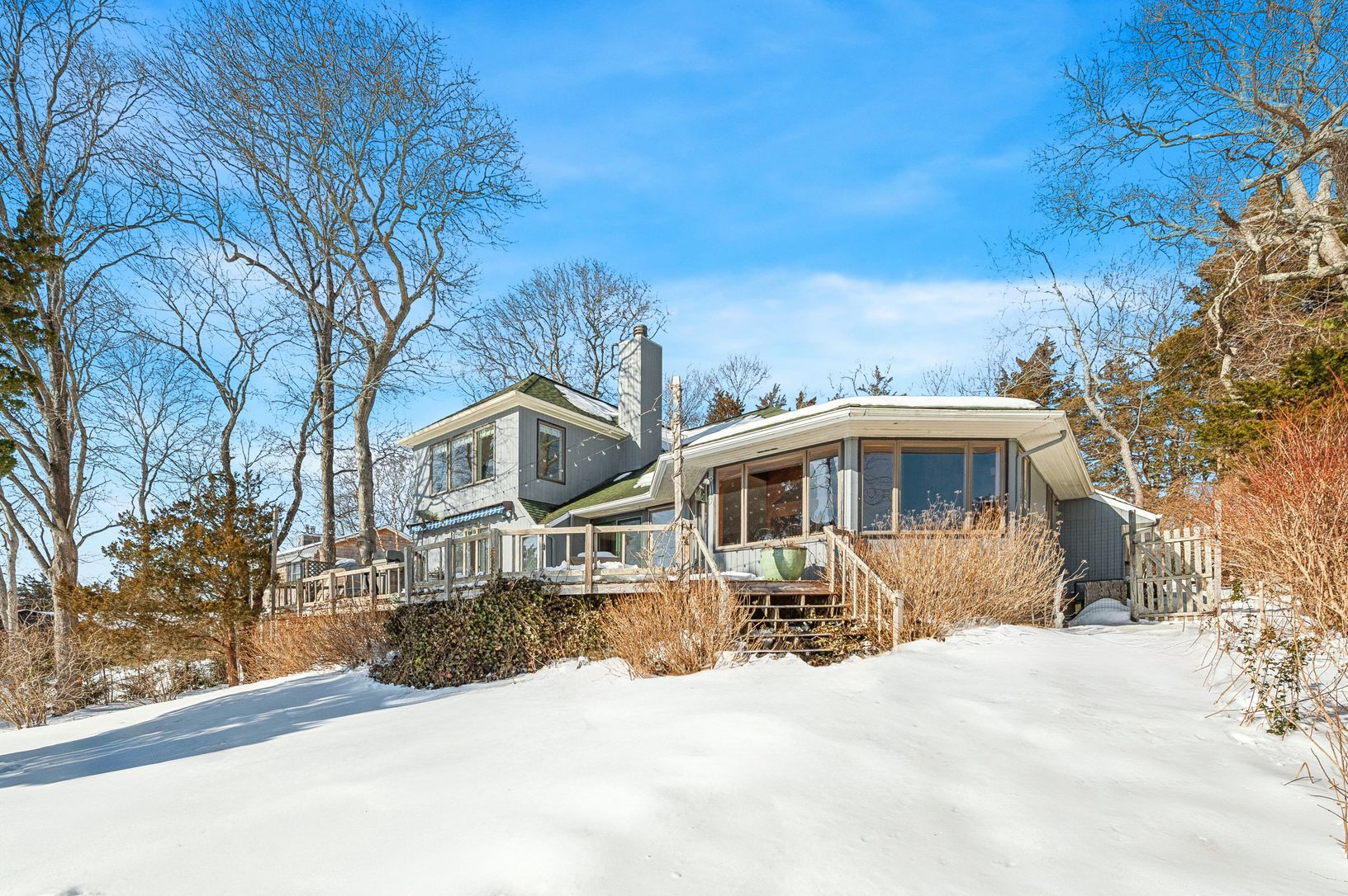 On Great Pond in North Haven's Bay Haven community, just minutes from Sag Harbor Village, this 5-bedroom, 3-bath waterfront home sits on .56 acres with approximately 103 feet of frontage, offering open water views and tidal access to Sag Harbor Bay. The setting is quiet and protected, with the house well positioned to capture the water. Principal living spaces open to a broad waterside deck, framed by mature landscaping that provides privacy a
