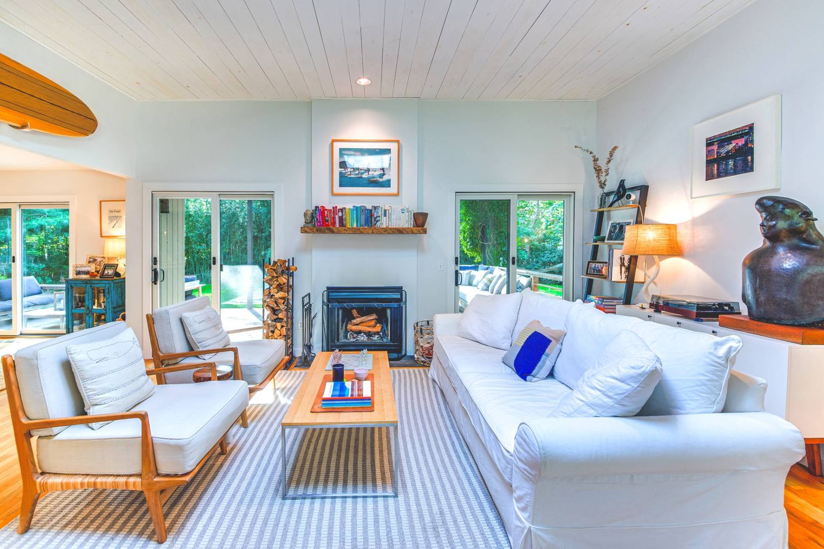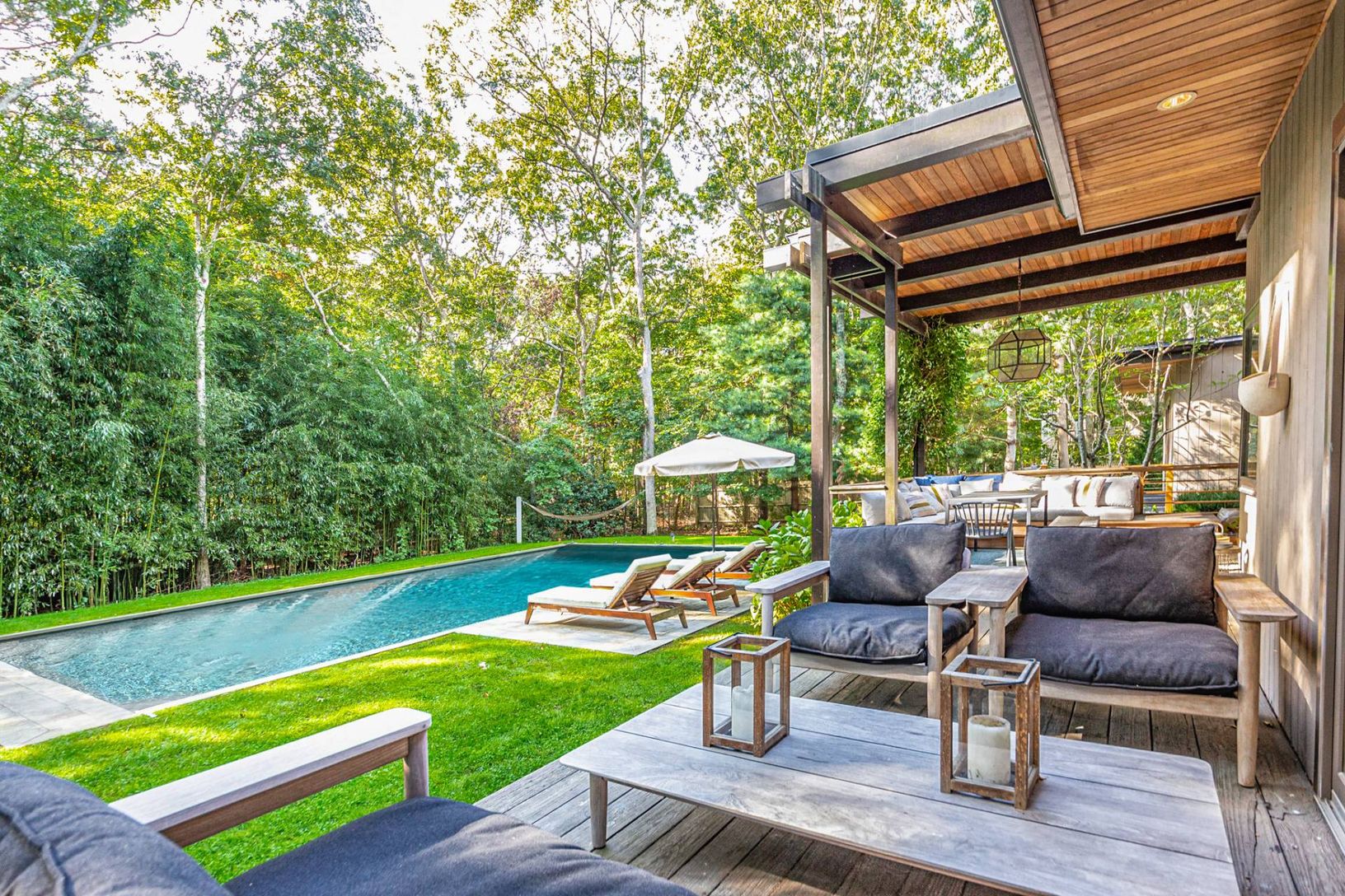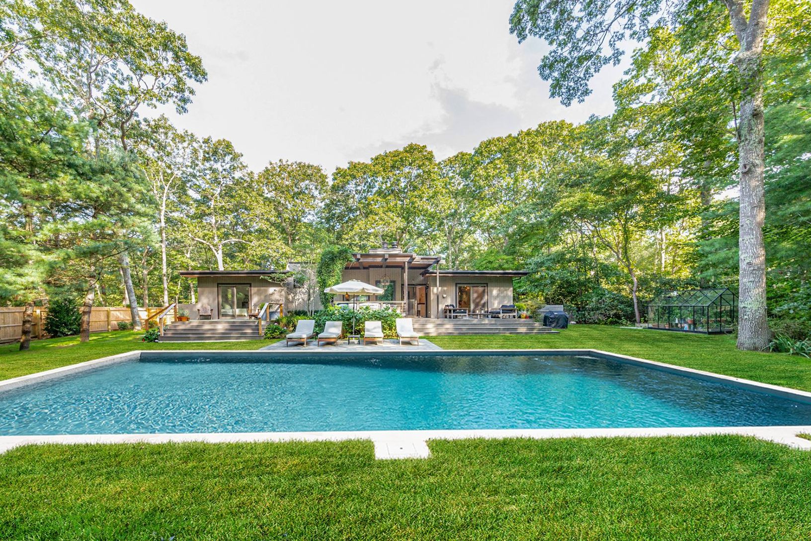 10 Stokes Court is a peaceful and idyllic property located within minutes to Amagansett and East Hampton. This chic 4 bedroom, 3 bath contemporary has it all. An open and bright floorpan with 4 bedrooms, 3 baths, heated pool, office, gym, sauna and more. The large 1st floor master suite opens up to its own sitting area overlooking the rear yard, perfect for an early morning coffee or evening cocktail. The outdoor dining area naturally flows fr