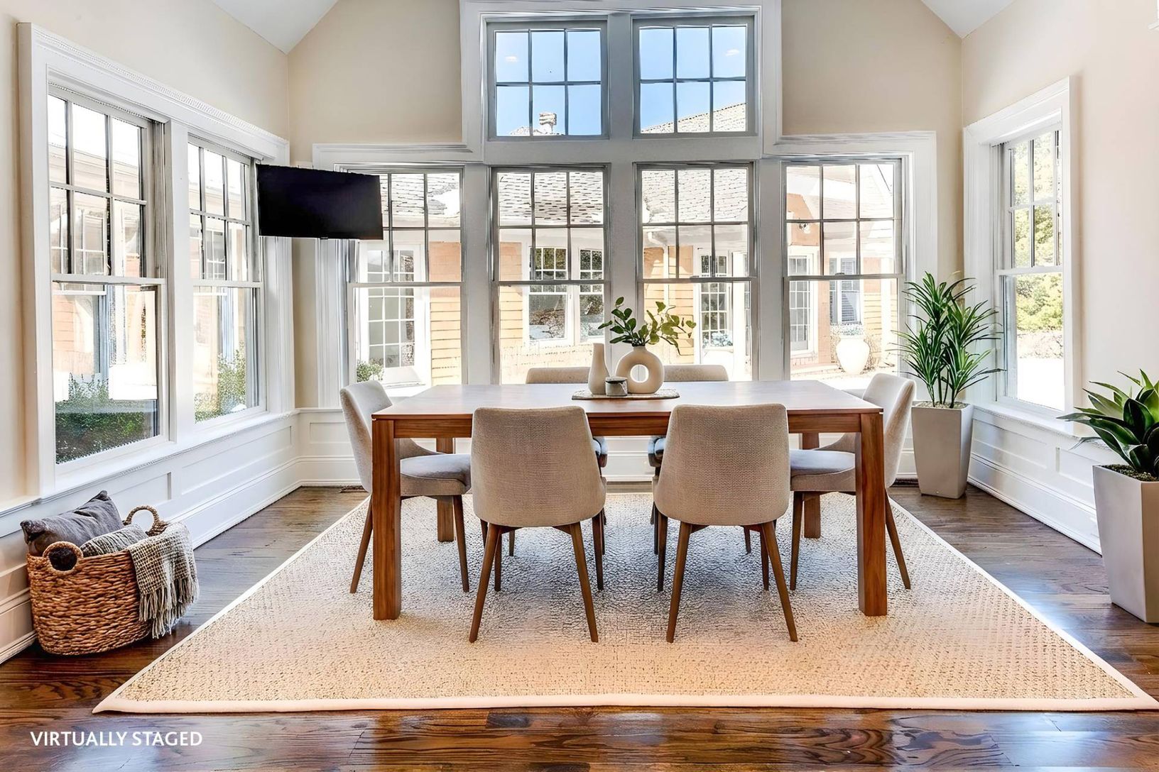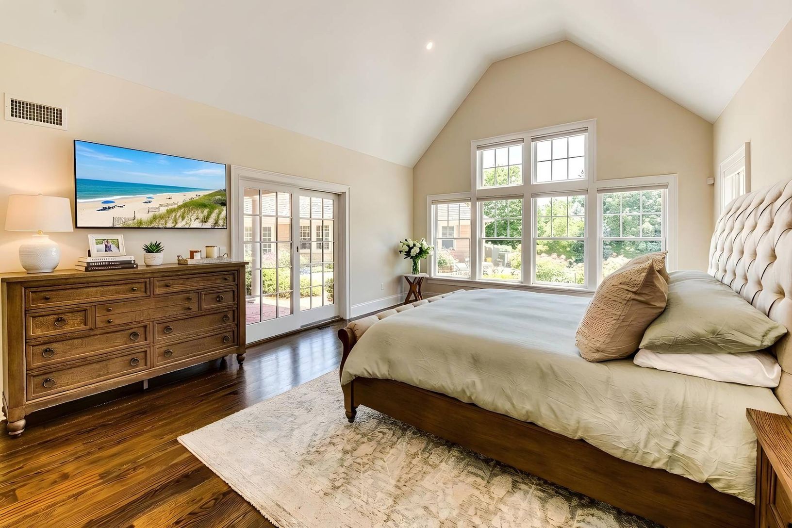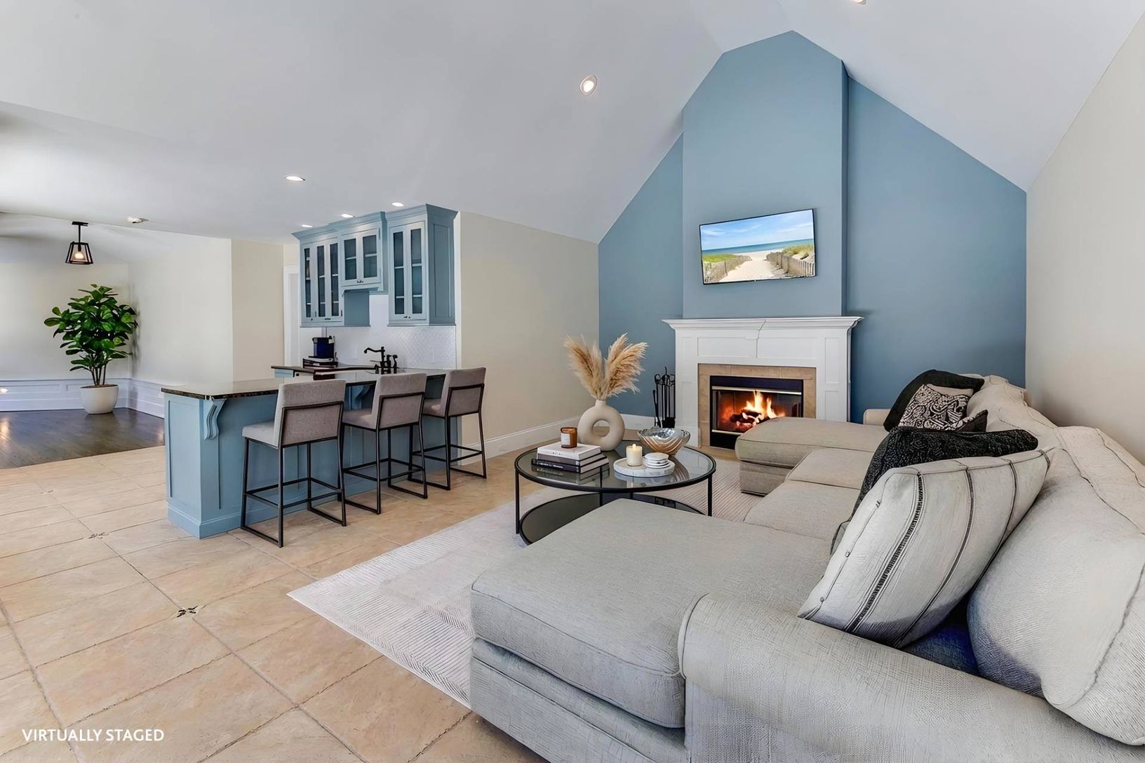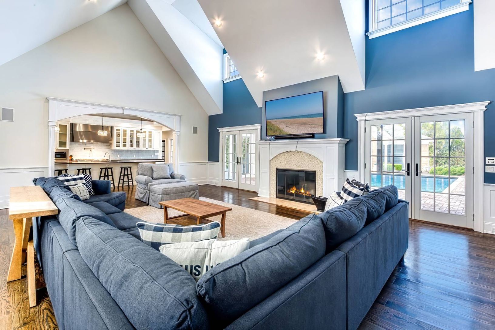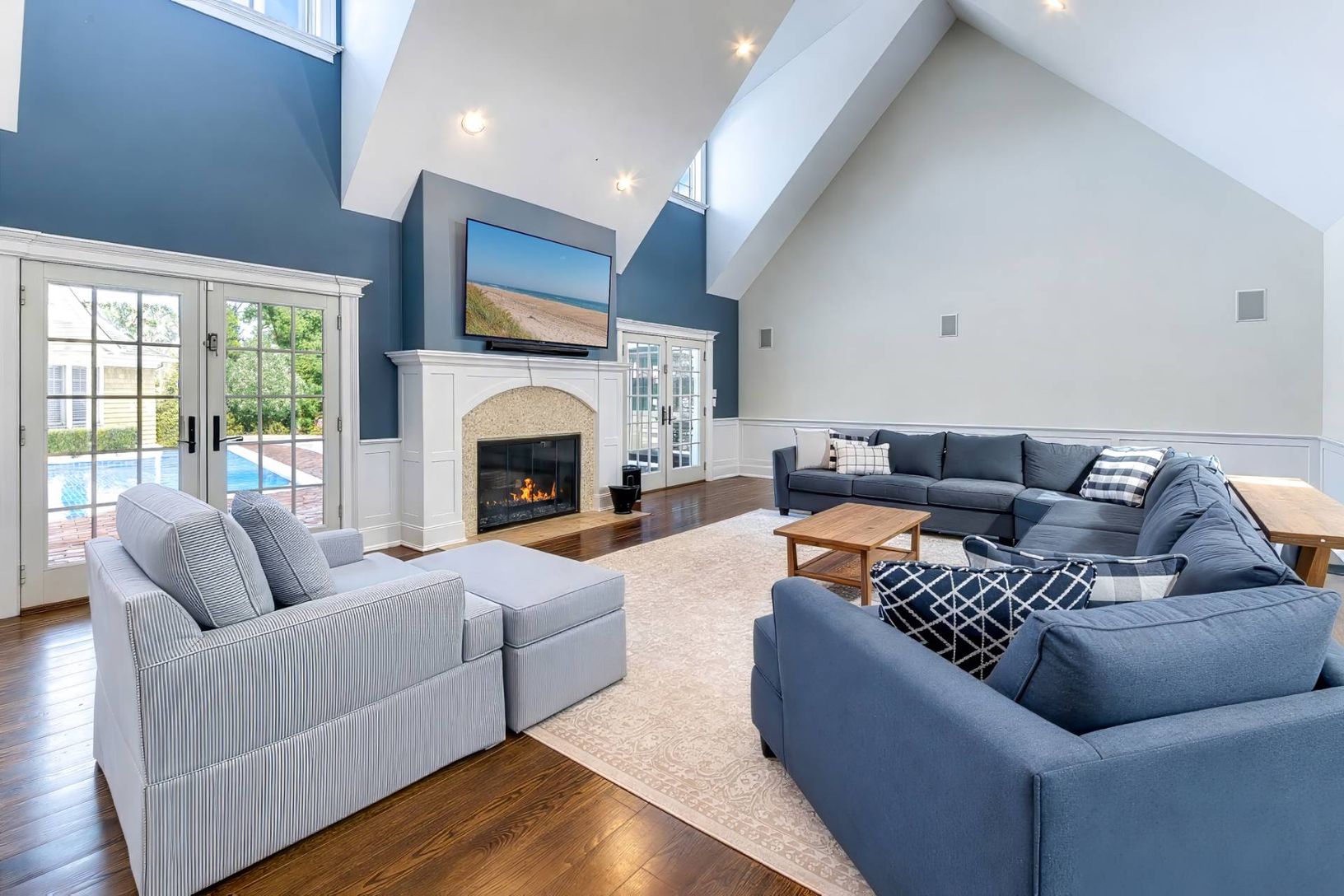 Set on a shy acre in a prime Shelter Island location, this beautifully refreshed Hamptons-style shingled home offers over 5,000 sq. ft. of elegant, light-filled living space - nearly all on one level. Under new ownership and featuring updated interiors and décor, this is the first time being offered as a summer rental. A grand vaulted foyer leads into a striking living room with a wood-burning fireplace that opens seamlessly to the outdoor cou