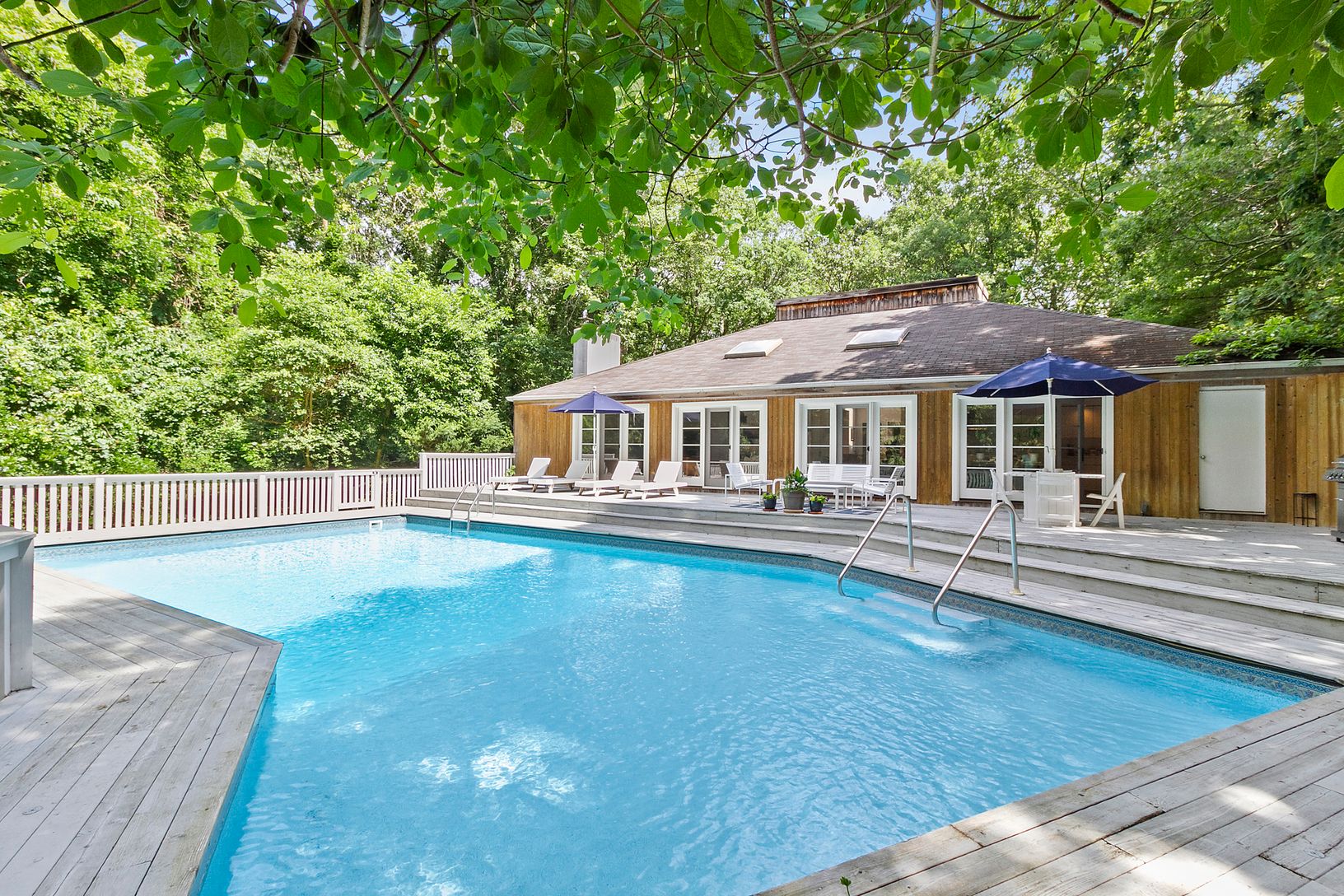 Just listed and won't last, located moments to the Village of East Hampton and Main Beach. This sleek one level home has an open floor plan with a fireplace and vaulted ceilings to let in the light opens to an expansive deck and sunny pool. The kitchen has just been upgraded with stainless steel appliances and works beautifully to serve to the dining area or onto the deck for outdoor entertaining. The first floor master suite has plenty of clo
