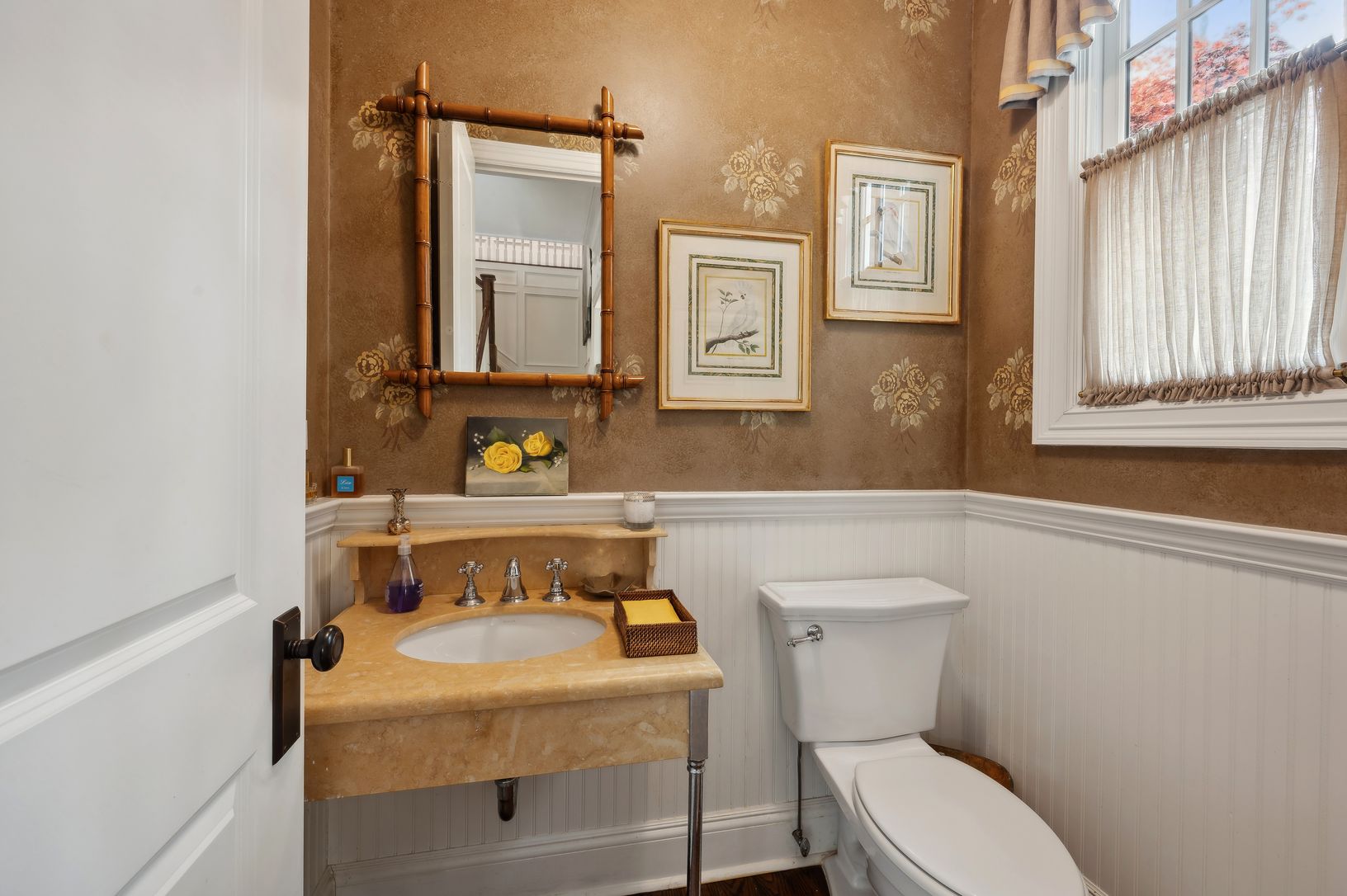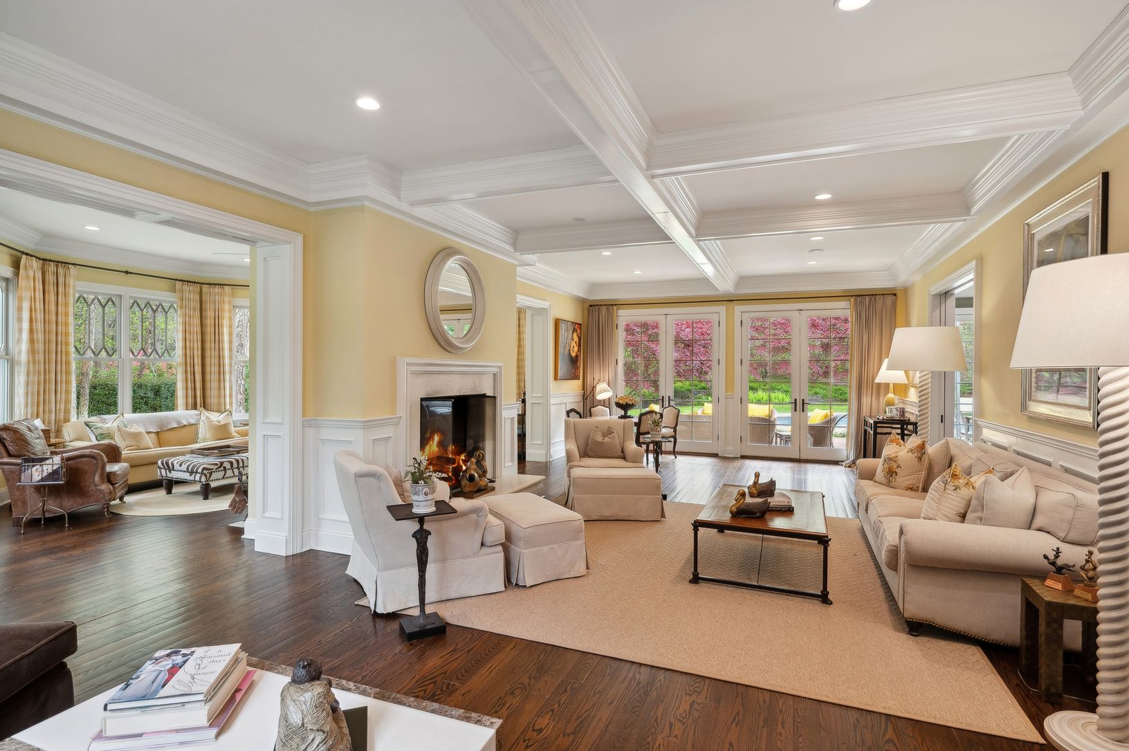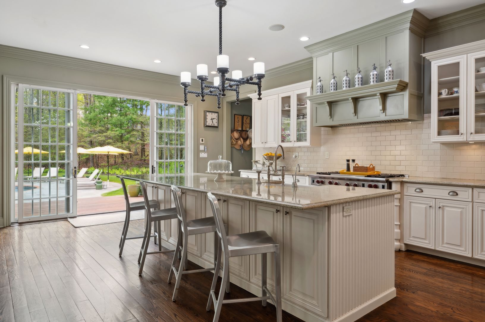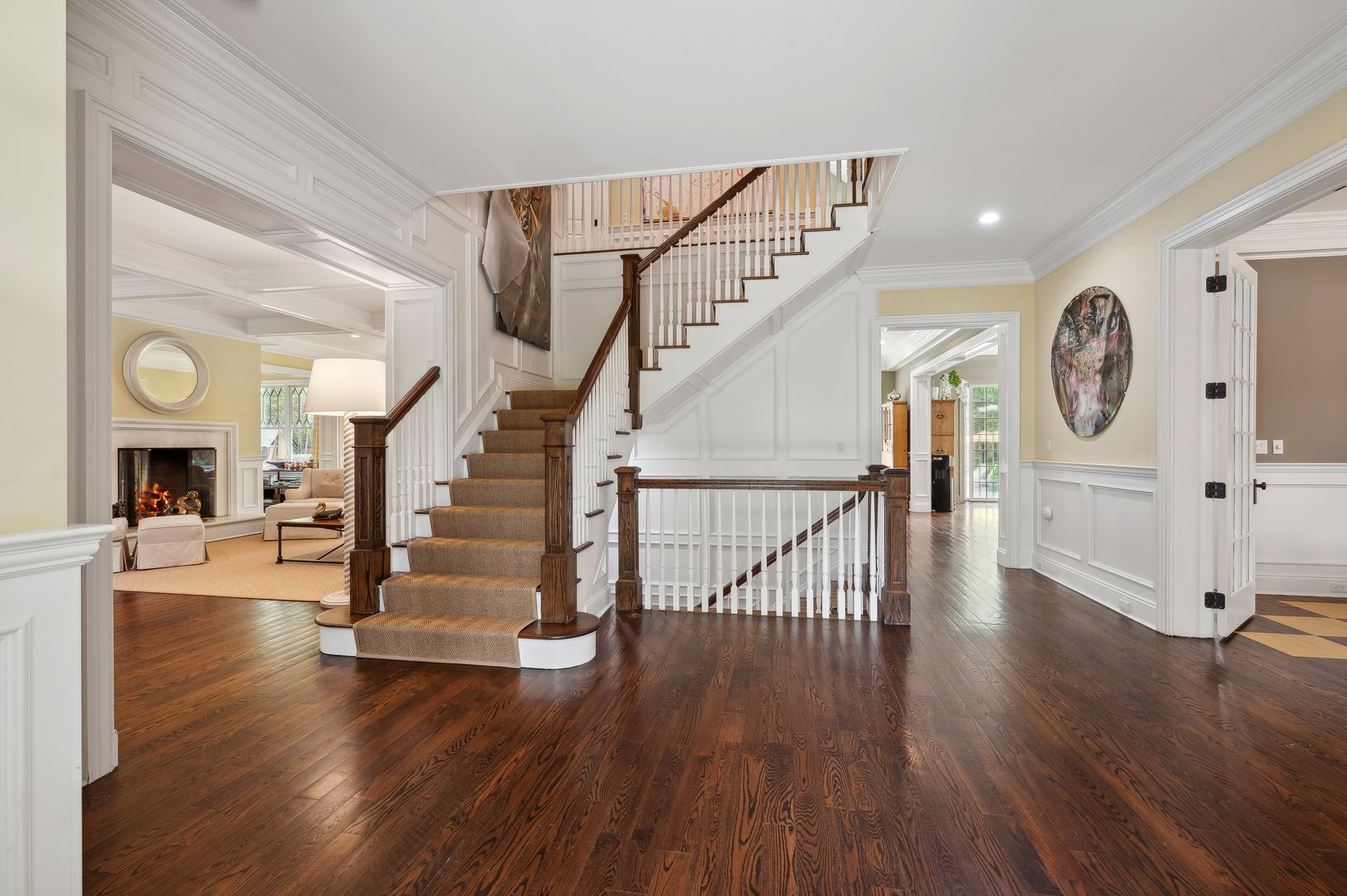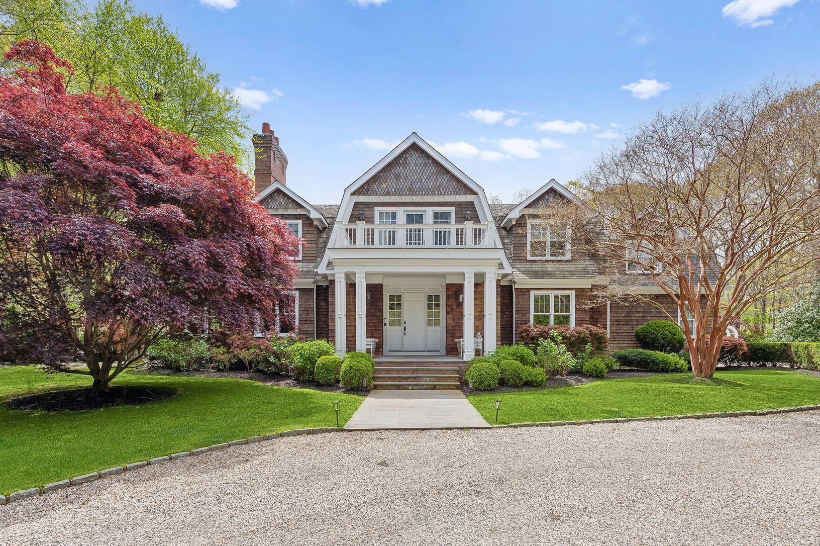 Down a long, gated driveway, this Farrell built Gambrel-style home greets you with timeless design nestled in a park-like setting. The double-height foyer with raised paneling leads to gracious first floor spaces that flow easily from one to another. The sun-drenched living room with adjoining study is flanked by windows and French doors and offers a two-sided, wood-burning fireplace. The great room with breakfast nook and casual seating area
