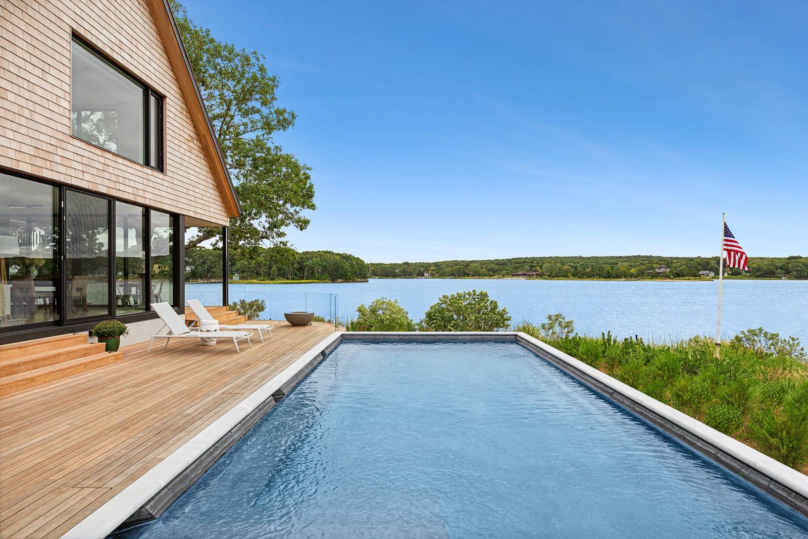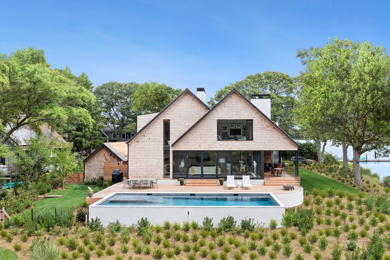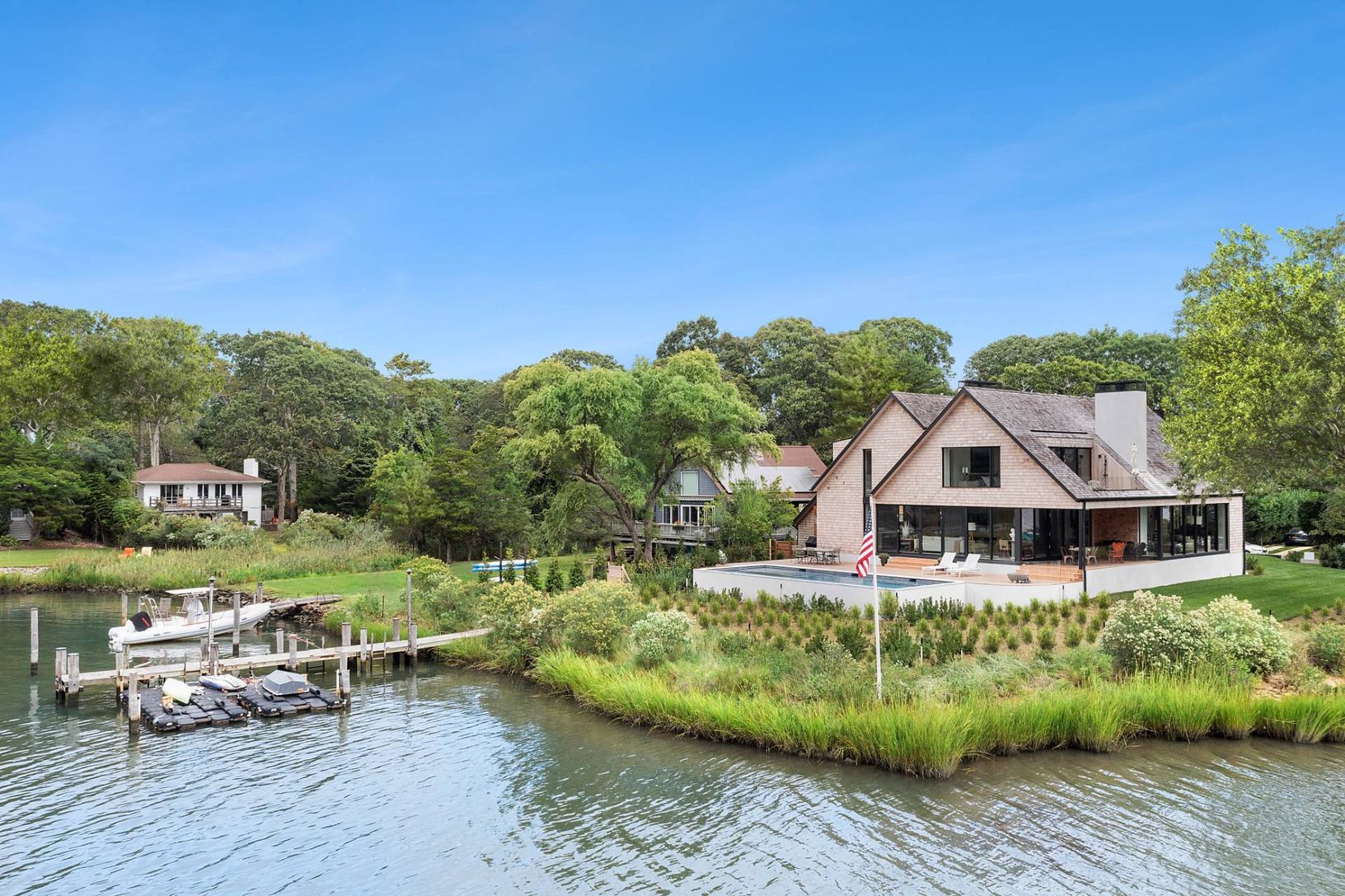 Discover luxurious waterfront living in the heart of Sag Harbor Village with this newly completed property. Designed by renowned Blaze Makoid Architects, built by Edler Construction, and tastefully curated by interior designer Mark Schryver, this exceptional residence boasts 270-degree views over Sag Harbor Cove, delivering unparalleled panoramic beauty from nearly every angle. Positioned on 0.6 acres in the Redwood neighborhood, the property
