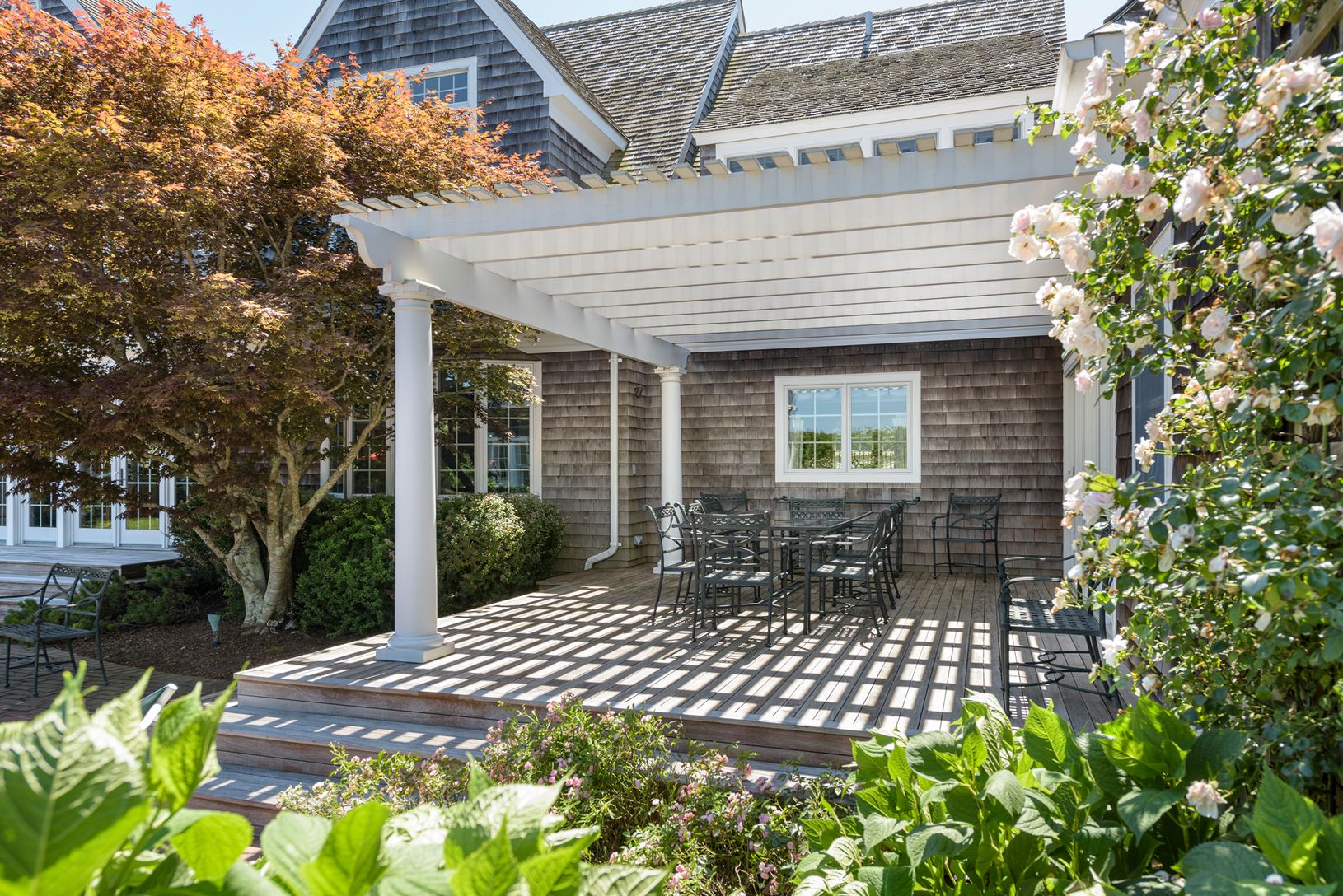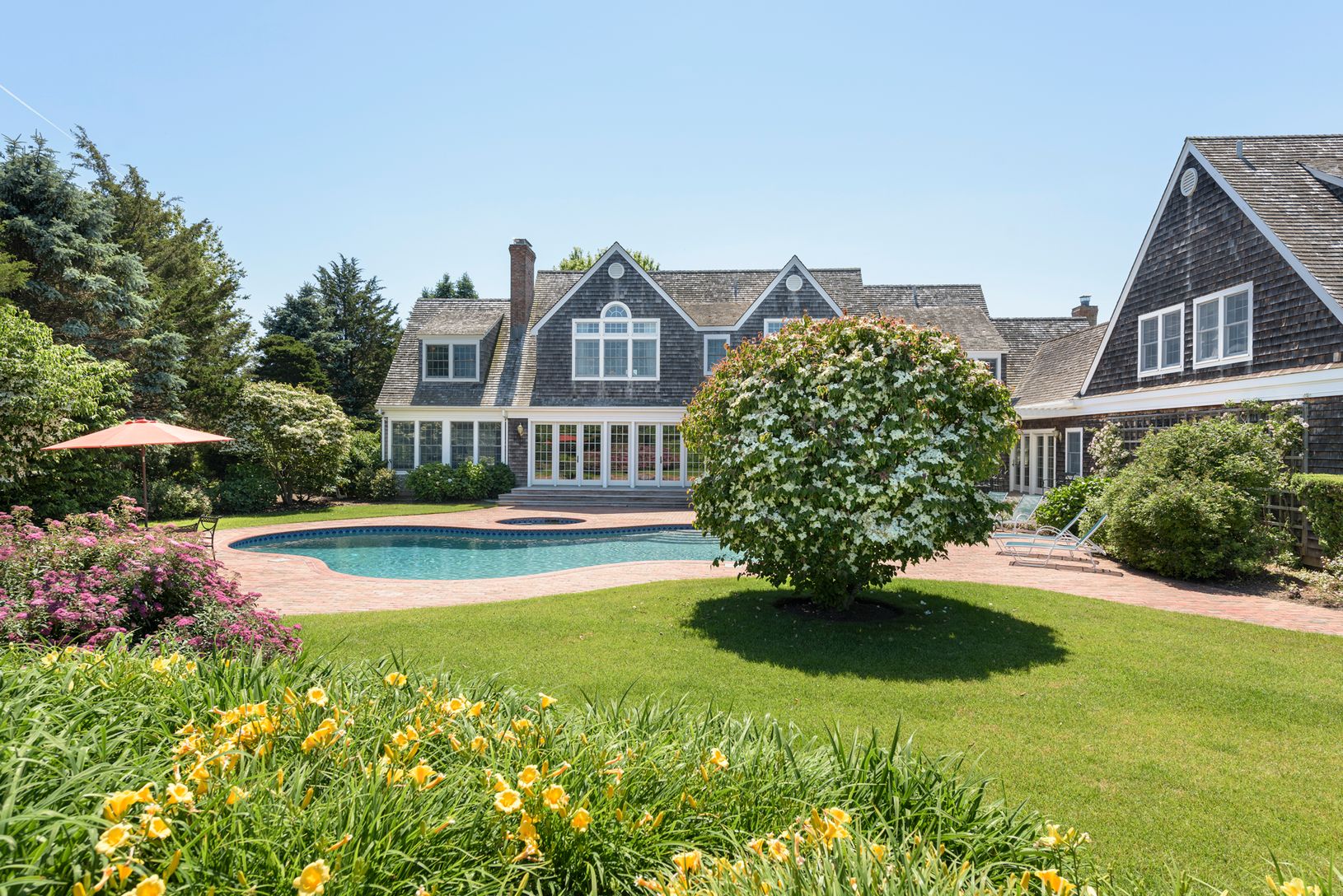 Situated on a highly desirable, private and quiet cul-de-sac in Sagaponack south of the highway, this light-filled, custom, shingled traditional on 1.5+/- acres offers 6,100+/- sq. ft. of living space. Thoughtfully crafted, exceptionally well maintained, the home is beautiful just as it is but is also flexible and adaptable. There are currently six bedrooms, all en suite, six full and two half baths. The entry foyer leads to a great room with