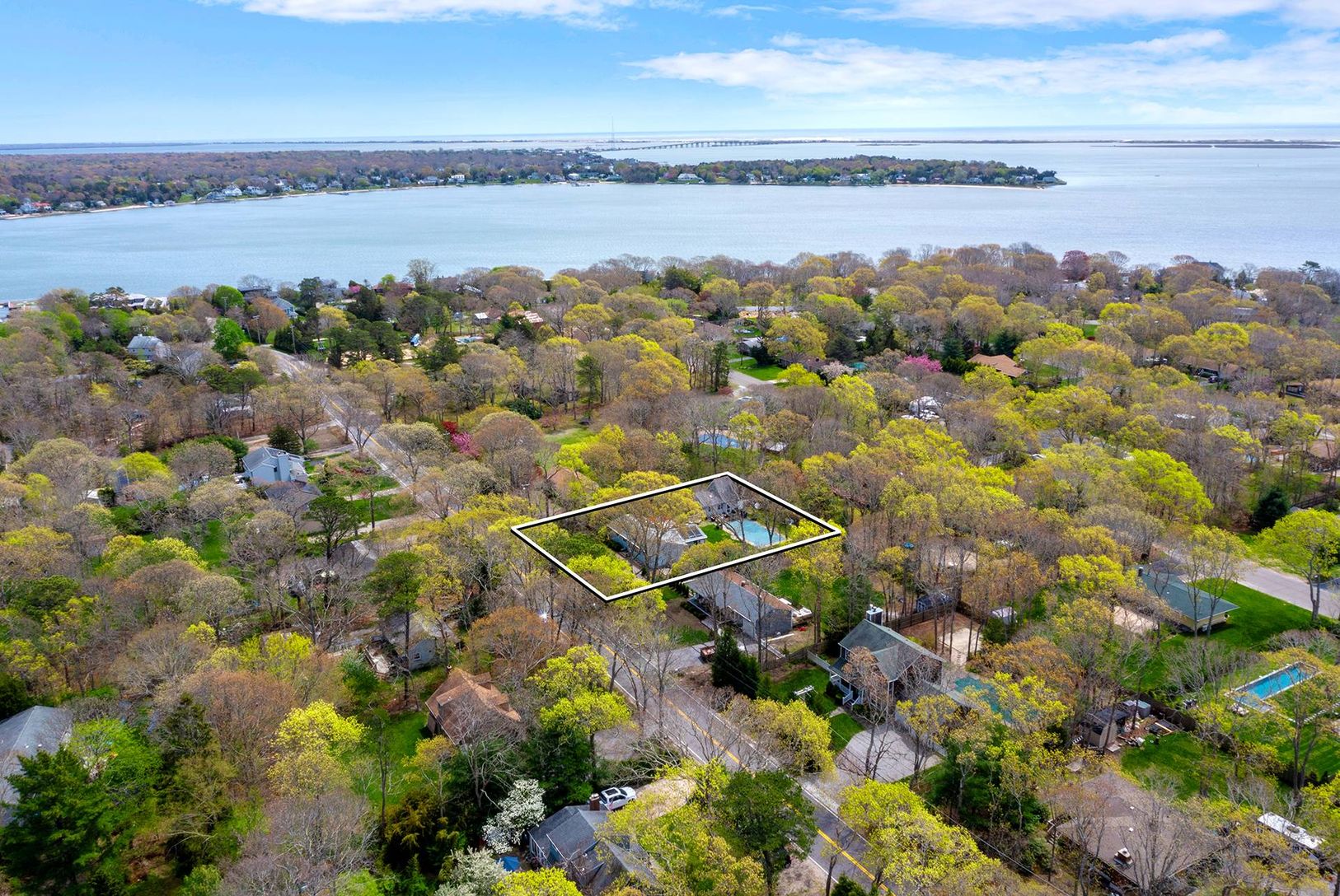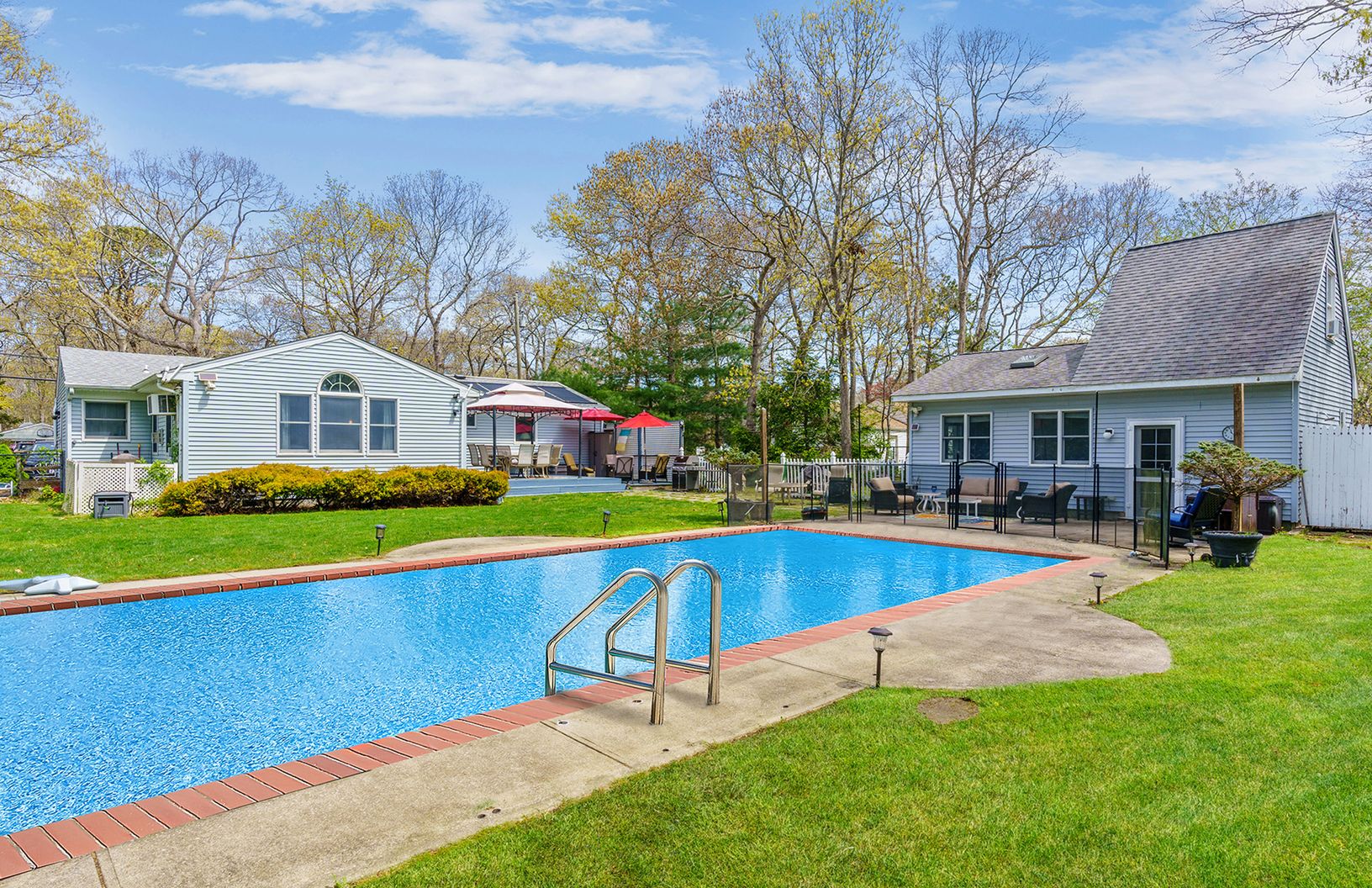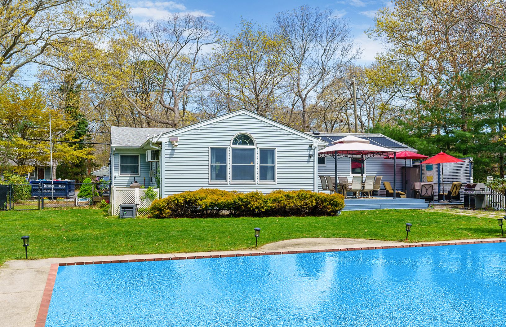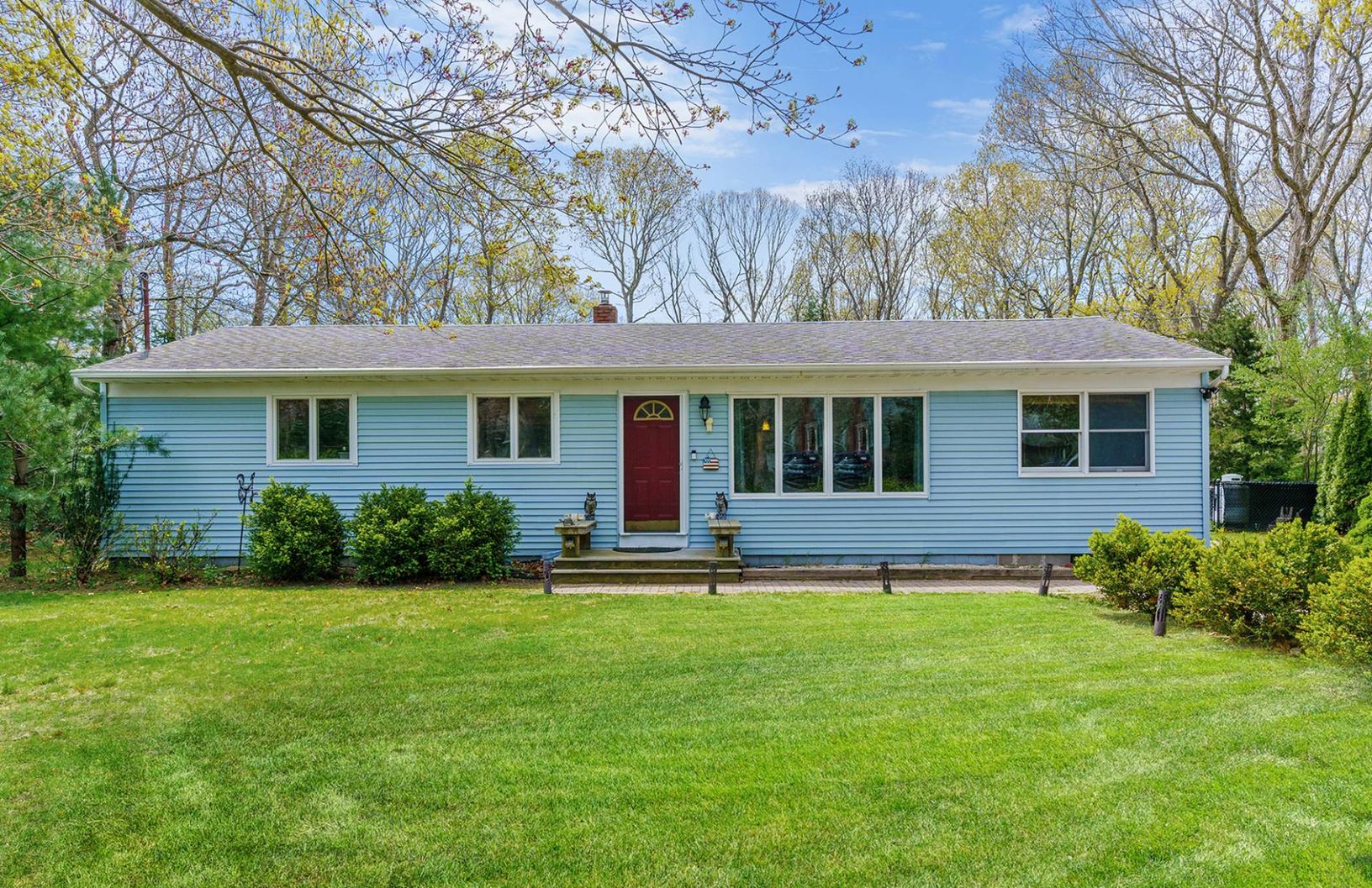 Beautifully-appointed clapboard 2 bedroom + den, 2 full bath ranch house south of the highway and less than 1 mile to Squires Beach and the Tiana Shores Association Beach Club, which offers members tennis, pool and so much more. The park-like property includes a resort-like 18'x 36' solar heated pool, a legal 20'x 25' cottage/pool house complete with a sky-lighted high ceiling grand family room, a full