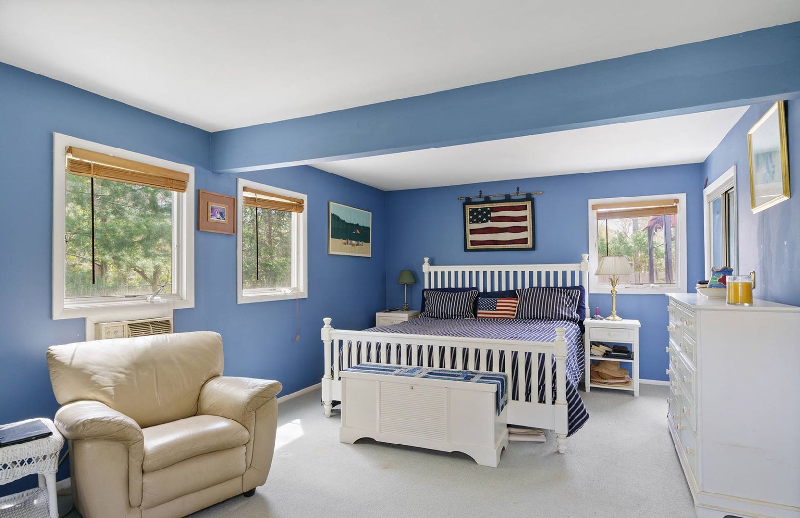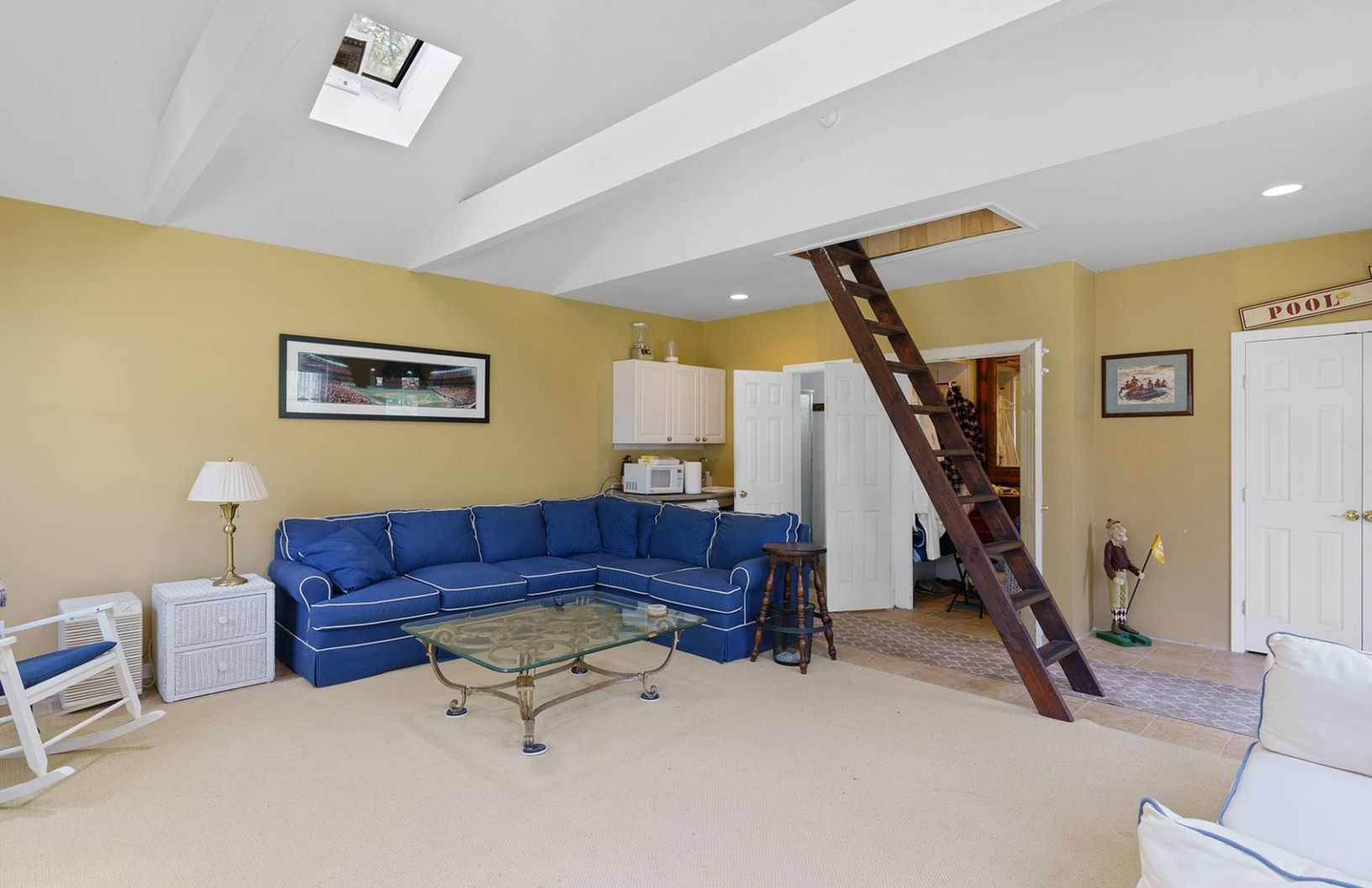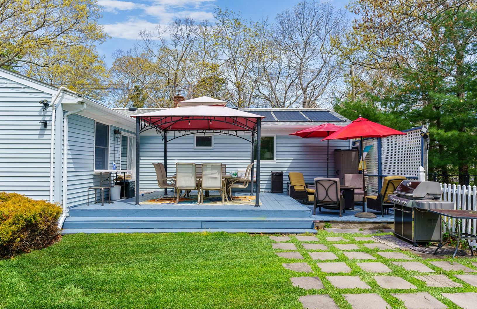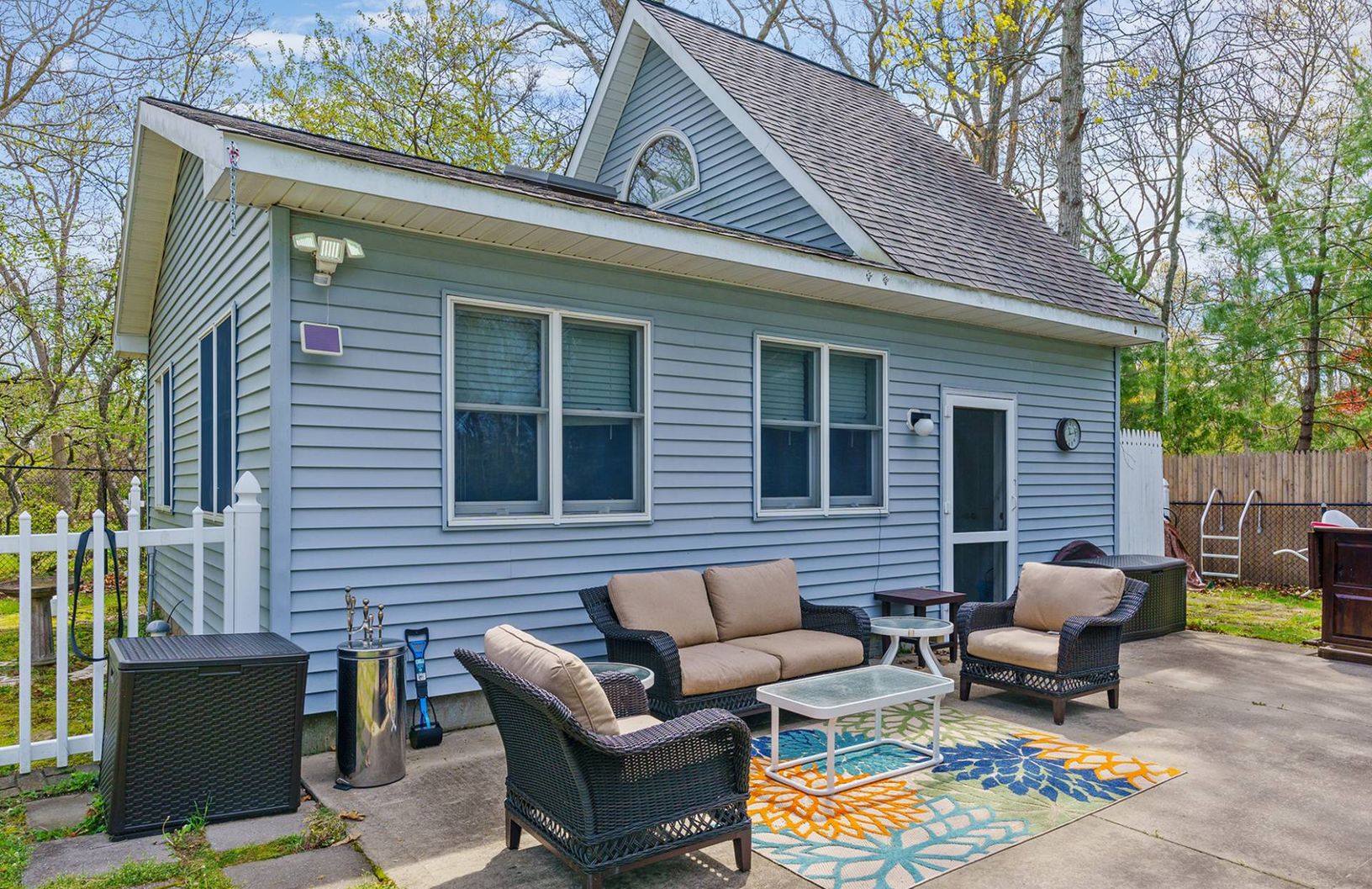 Beautifully-appointed clapboard 2 bedroom + den, 2 full bath ranch house south of the highway and less than 1 mile to Squires Beach and the Tiana Shores Association Beach Club, which offers members tennis, pool and so much more. The park-like property includes a resort-like 18'x 36' solar heated pool, a legal 20'x 25' cottage/pool house complete with a sky-lighted high ceiling grand family room, a full
