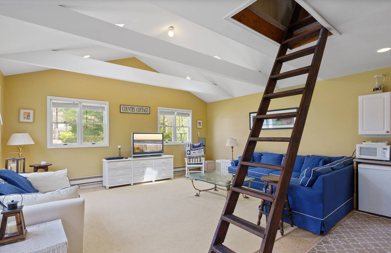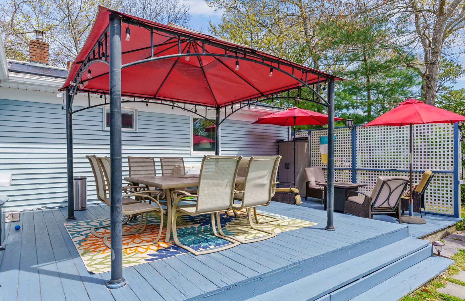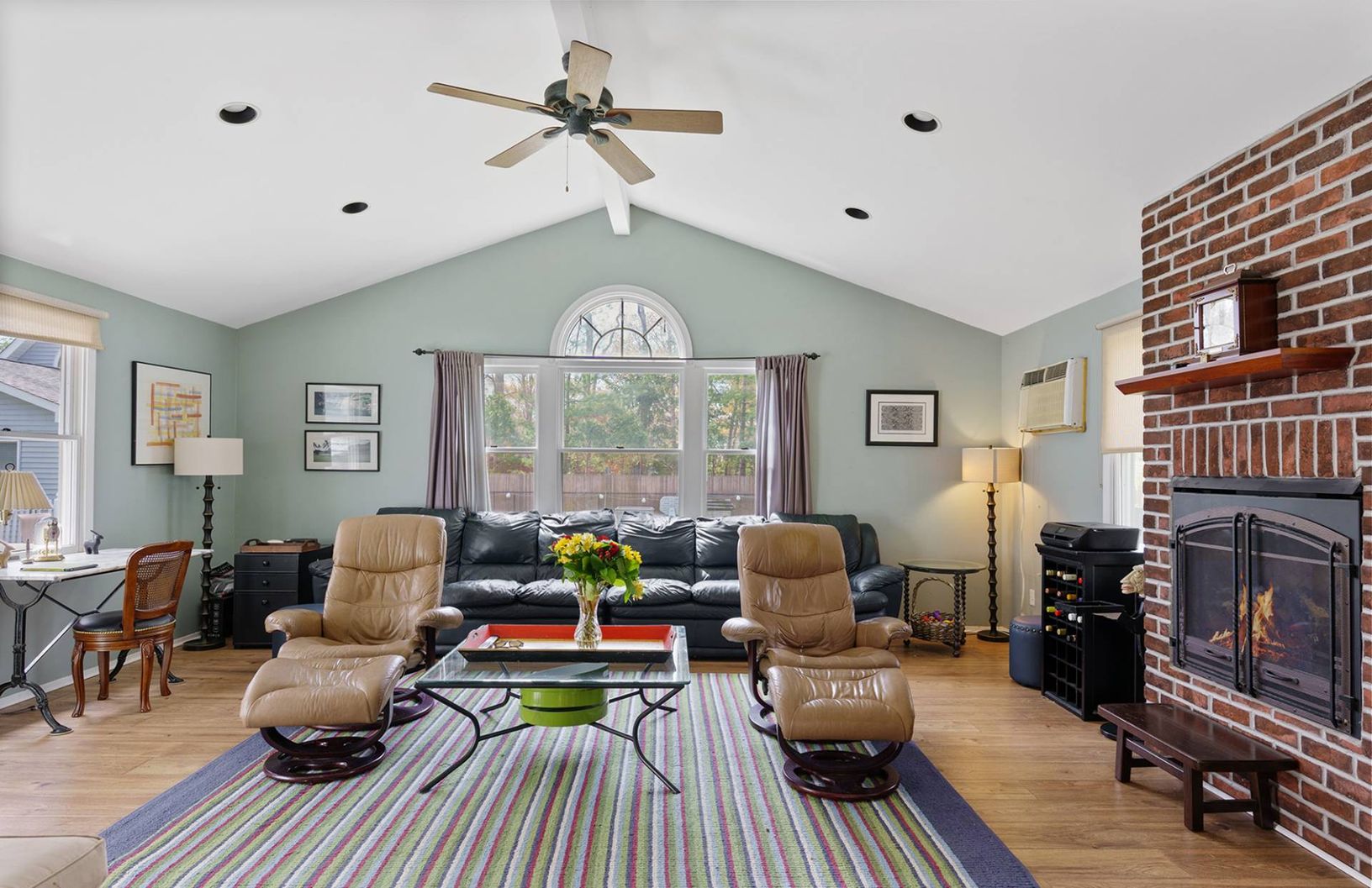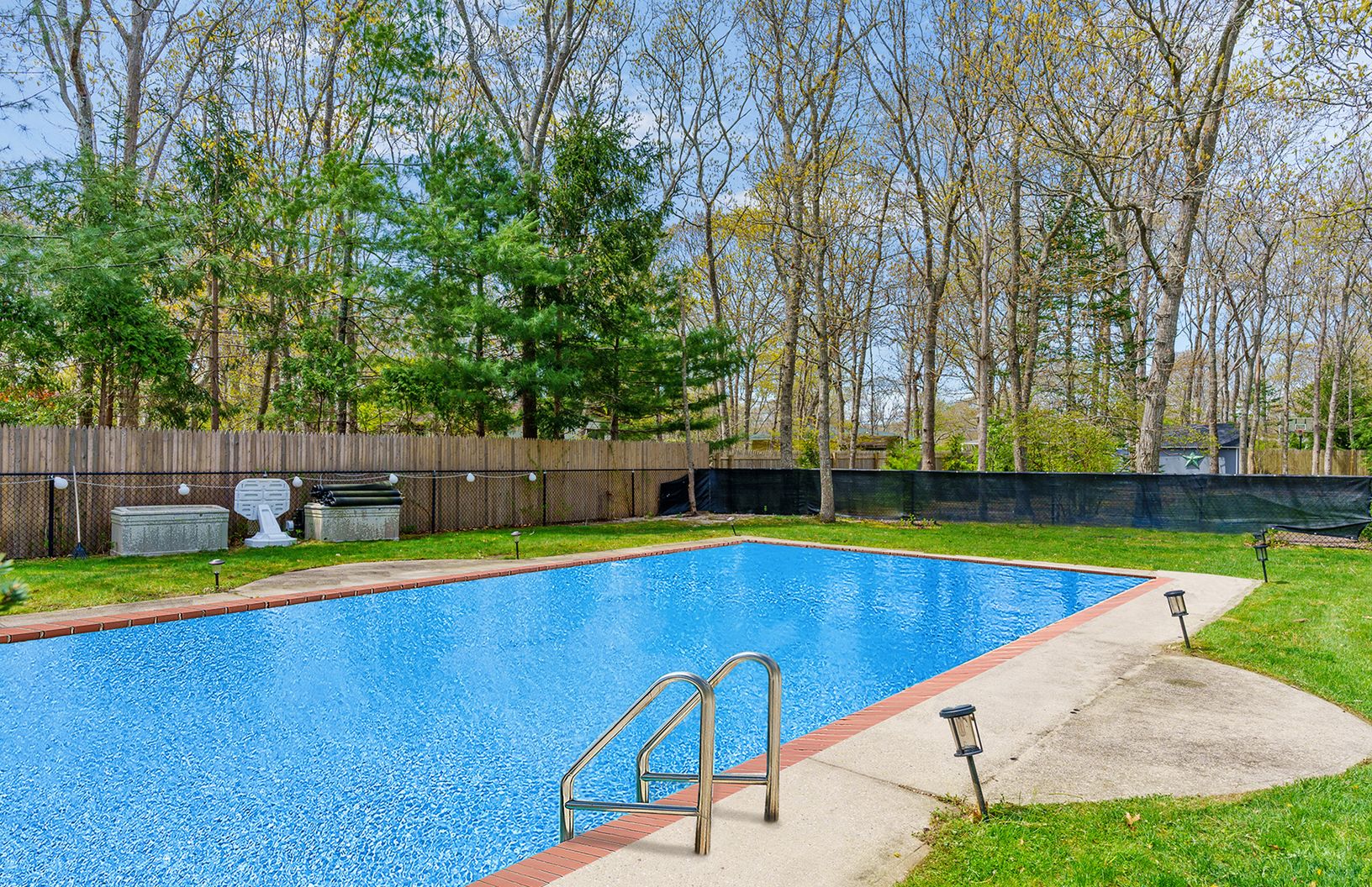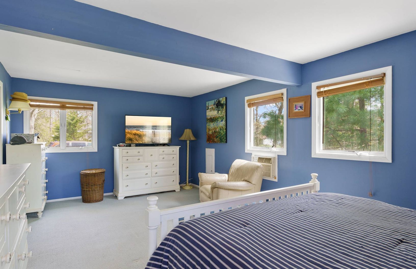 Beautifully-appointed clapboard 2 bedroom + den, 2 full bath ranch house south of the highway and less than 1 mile to Squires Beach and the Tiana Shores Association Beach Club, which offers members tennis, pool and so much more. The park-like property includes a resort-like 18'x 36' solar heated pool, a legal 20'x 25' cottage/pool house complete with a sky-lighted high ceiling grand family room, a full