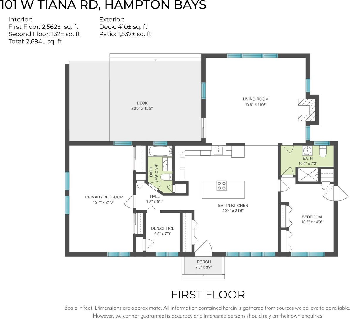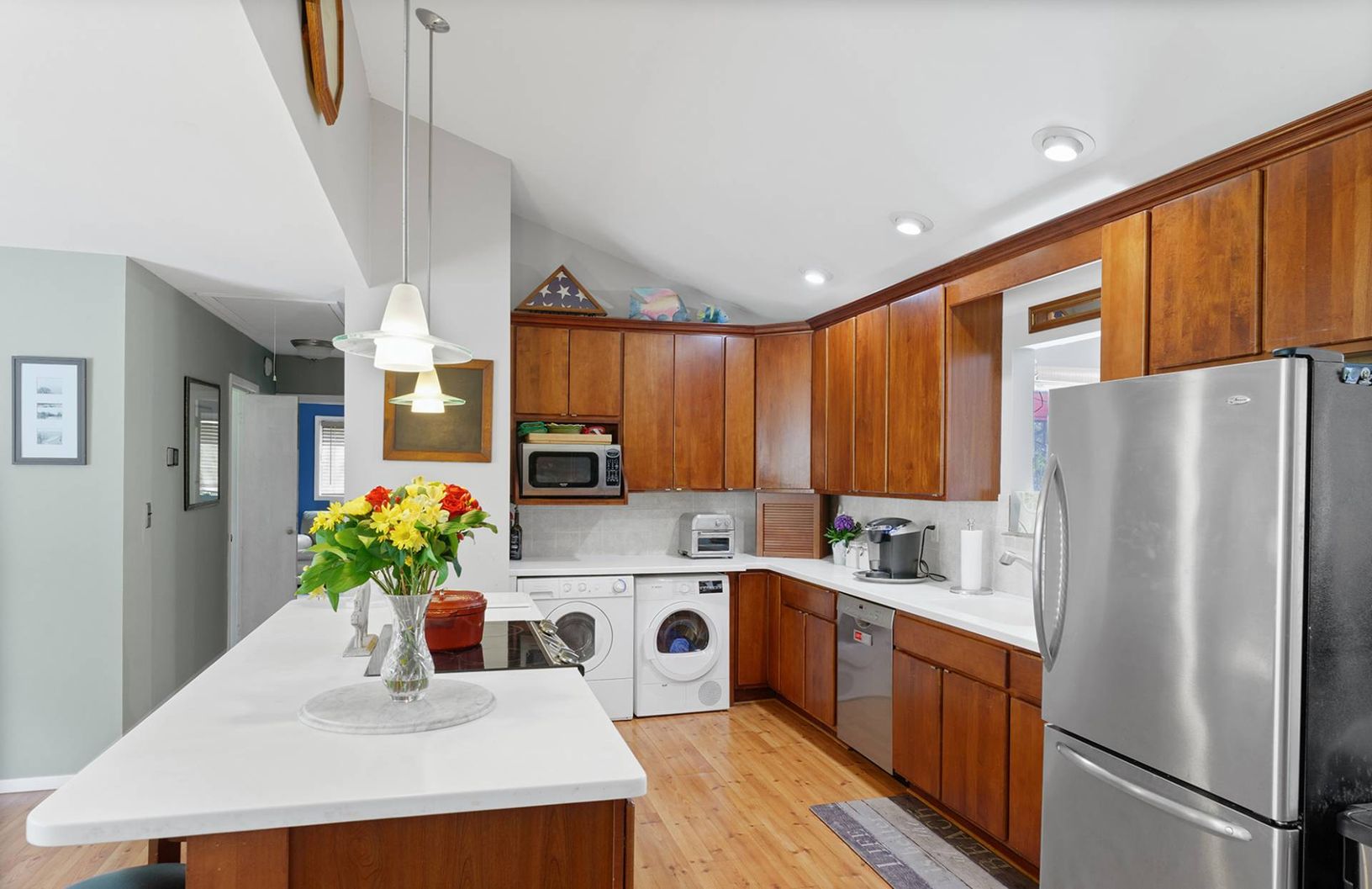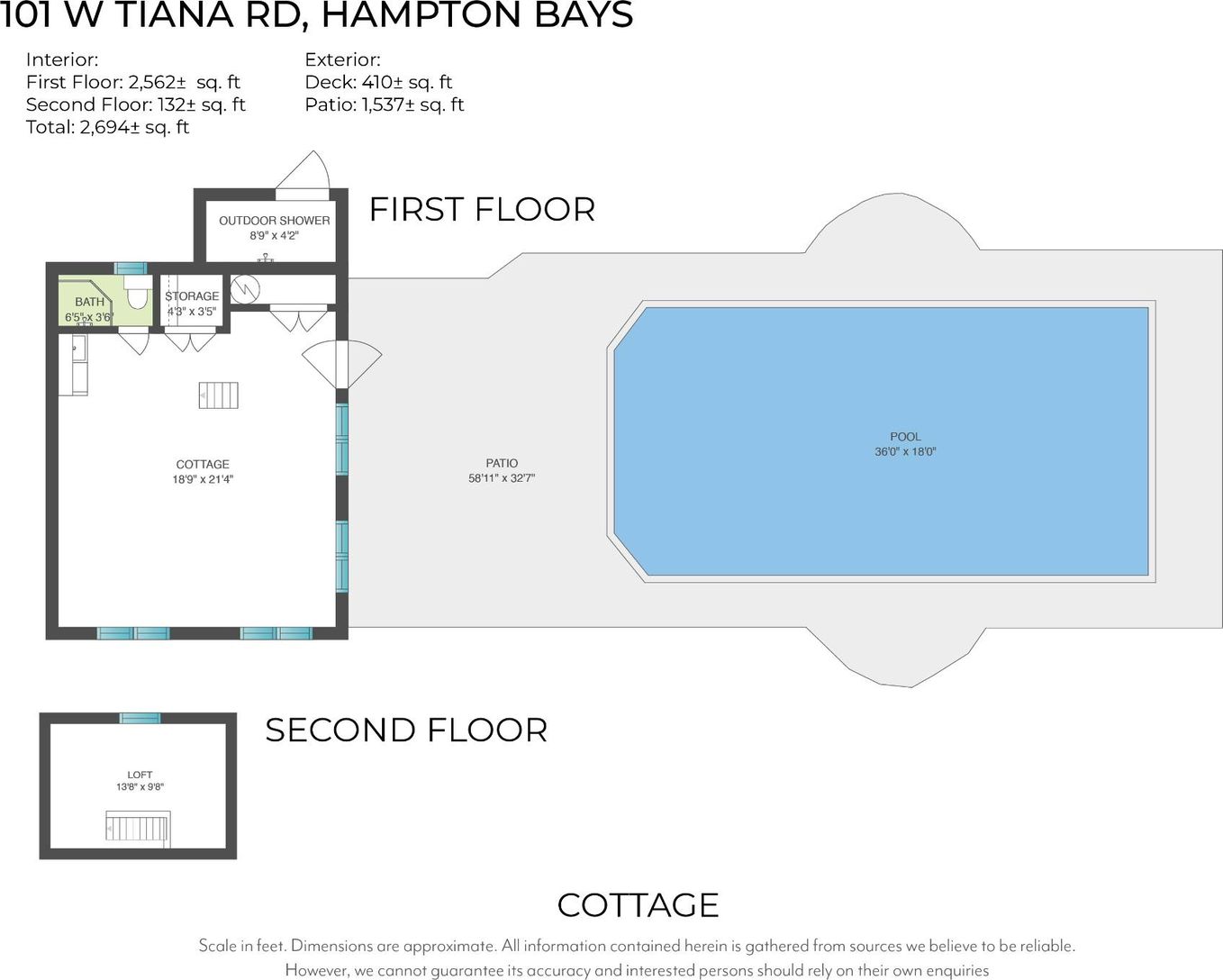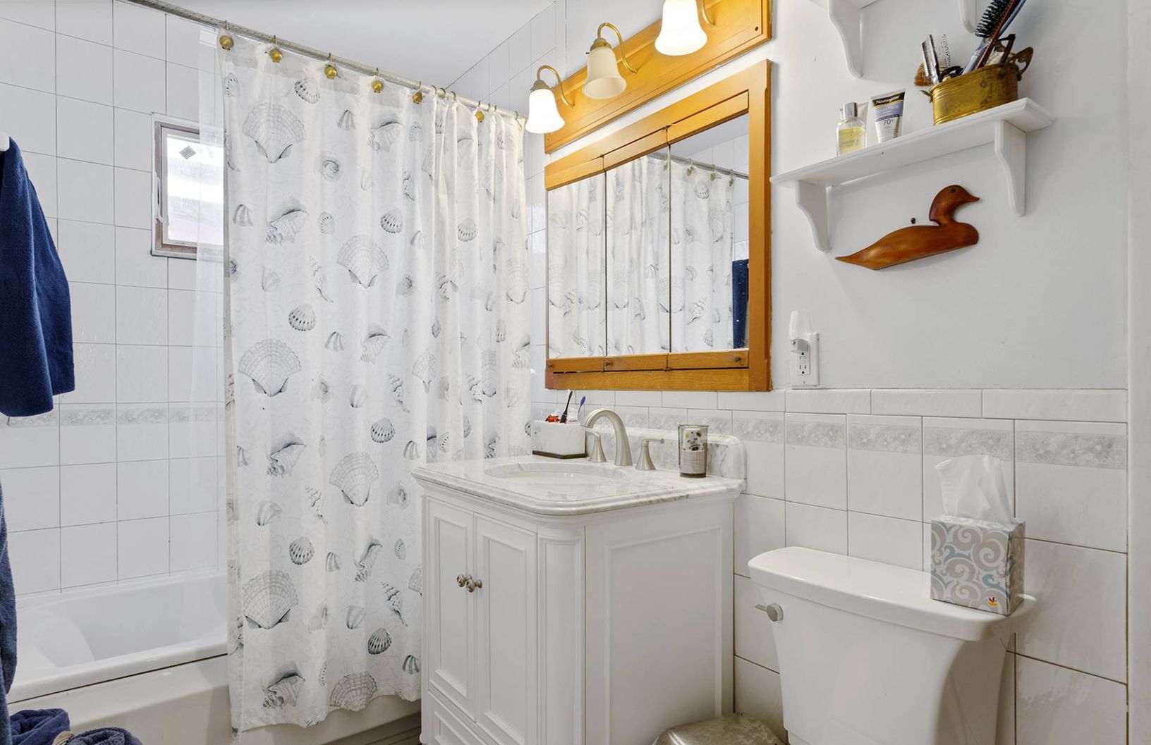 Beautifully-appointed clapboard 2 bedroom + den, 2 full bath ranch house south of the highway and less than 1 mile to Squires Beach and the Tiana Shores Association Beach Club, which offers members tennis, pool and so much more. The park-like property includes a resort-like 18'x 36' solar heated pool, a legal 20'x 25' cottage/pool house complete with a sky-lighted high ceiling grand family room, a full