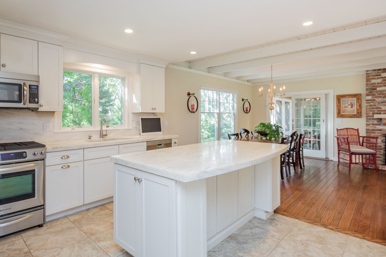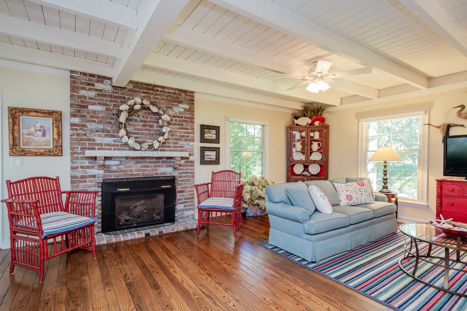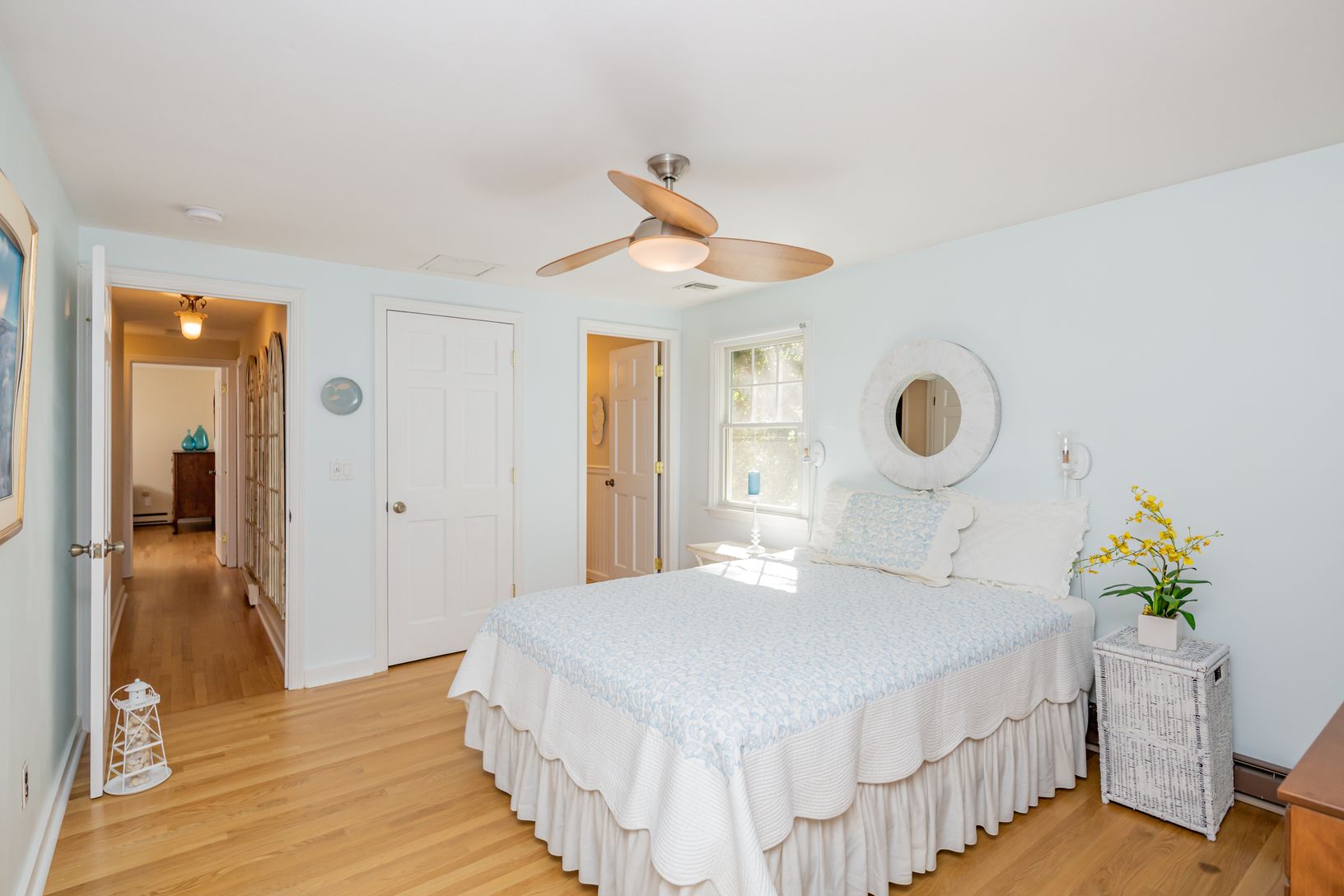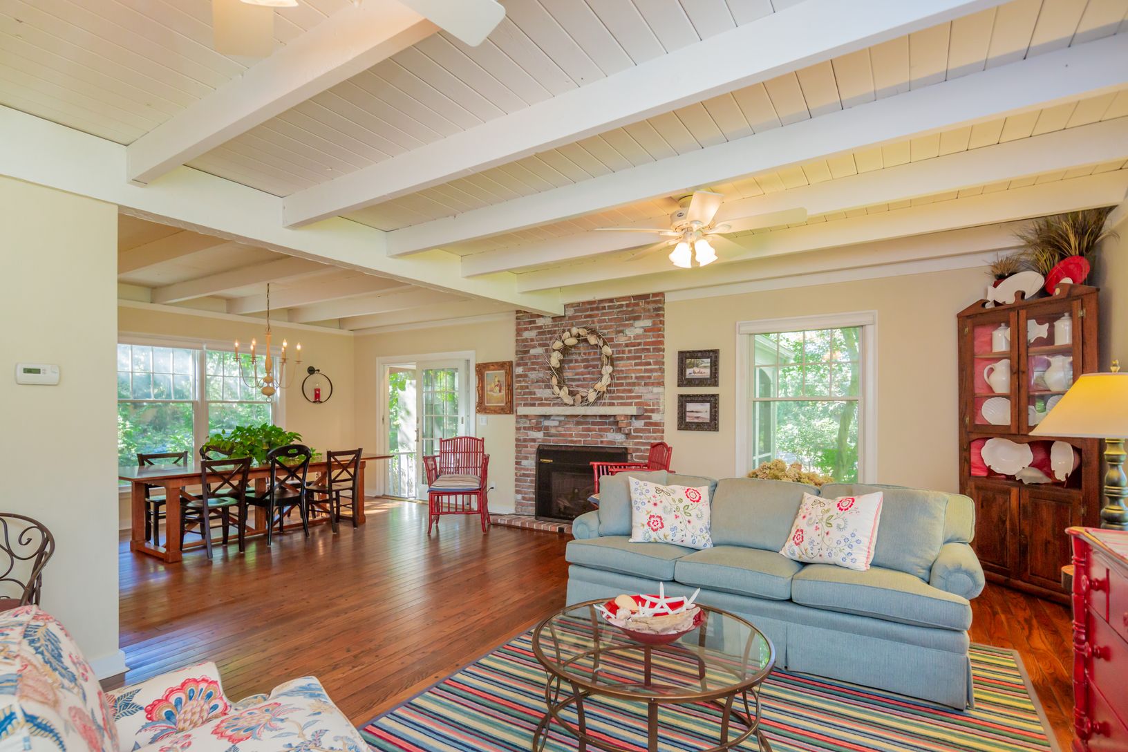 Located in Southampton Shores, a relaxed and active bay front community, this 4 bedroom, 4.5 bath home is beautifully maintained, comfortable and in very close proximity to the community tennis courts, marina and beach on Peconic Bay. The home is cheerful and attractive offering a living room with a fireplace and a beamed ceiling, a screened porch, an open dining area, and a modern and stylish kitchen with custom cabinets, high quality white m