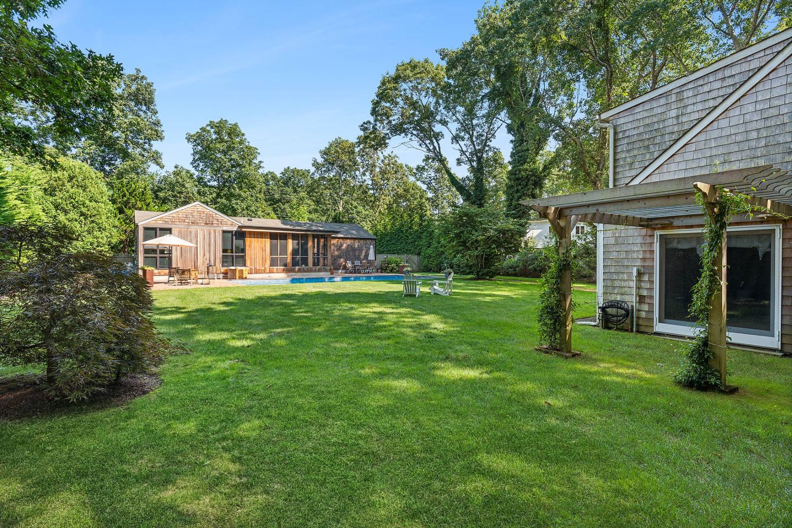 Located in coveted Clearwater Beach Community which offers a private marina with direct access to Gardiners Bay, a lifeguarded bay beach, a park, bocce ball, a BBQ area, a large gazebo with picnic tables and some of the most spectacular sunsets in the Hamptons is this recently renovated three bedroom, two and one half bath, one story home with a heated pool and a large two story cedar clad barn located in the back of the property. The sun fill